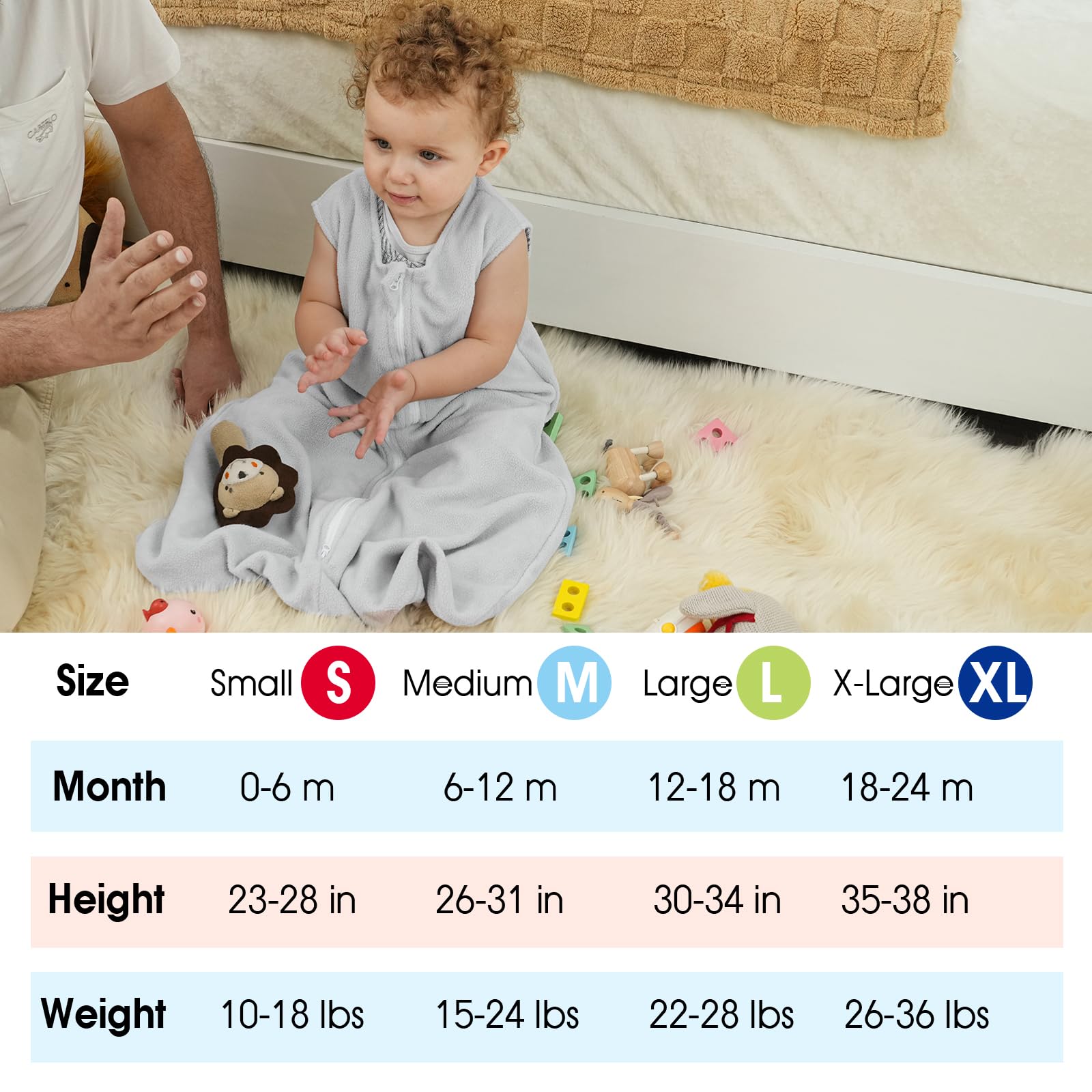 Multiple sizes: There are four sizes available for sleep sacks: small, medium, large, and X-large. Each size is suitable for a specific age range and weight of the baby, as well as their height measurements. Small is for babies 0-6 months (10-18 lbs, 23-28 in), medium is for babies 6-12 months (15-24 lbs, 26-31 in), large is for babies 12-18 months (22-28 lbs, 30-34 in), and X-large is for babies 18-24 months (26-36 lbs, 35-38 in).