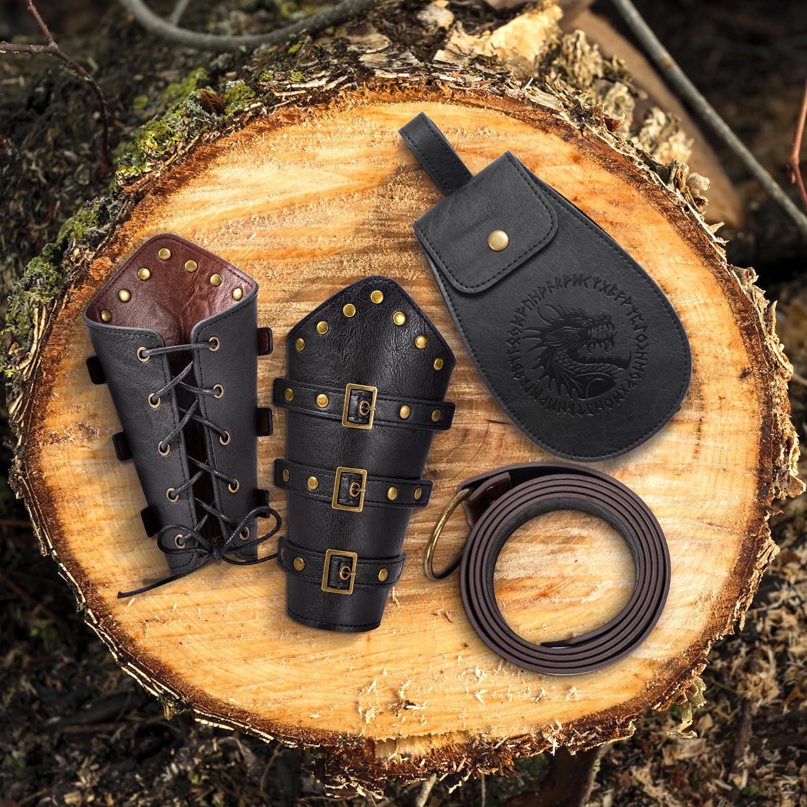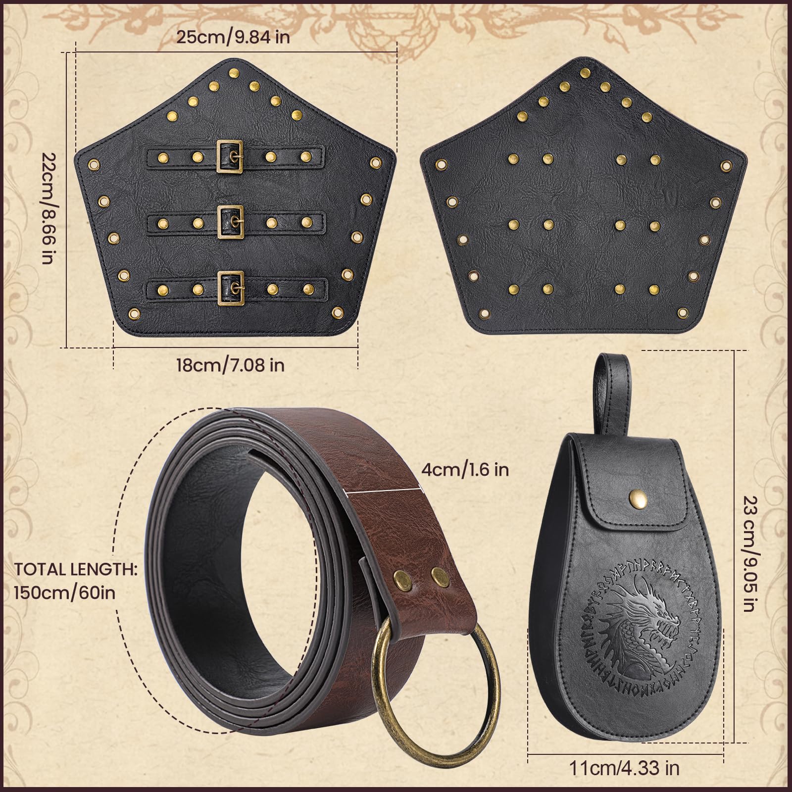 Exquisite Artistry: Every piece in the Renaissance Accessories Set is skillfully crafted, from the leatherwork on the leather bracers to the intricate designs on the Viking belt and medieval belt pouch, you'll experience craftsmanship at its finest.