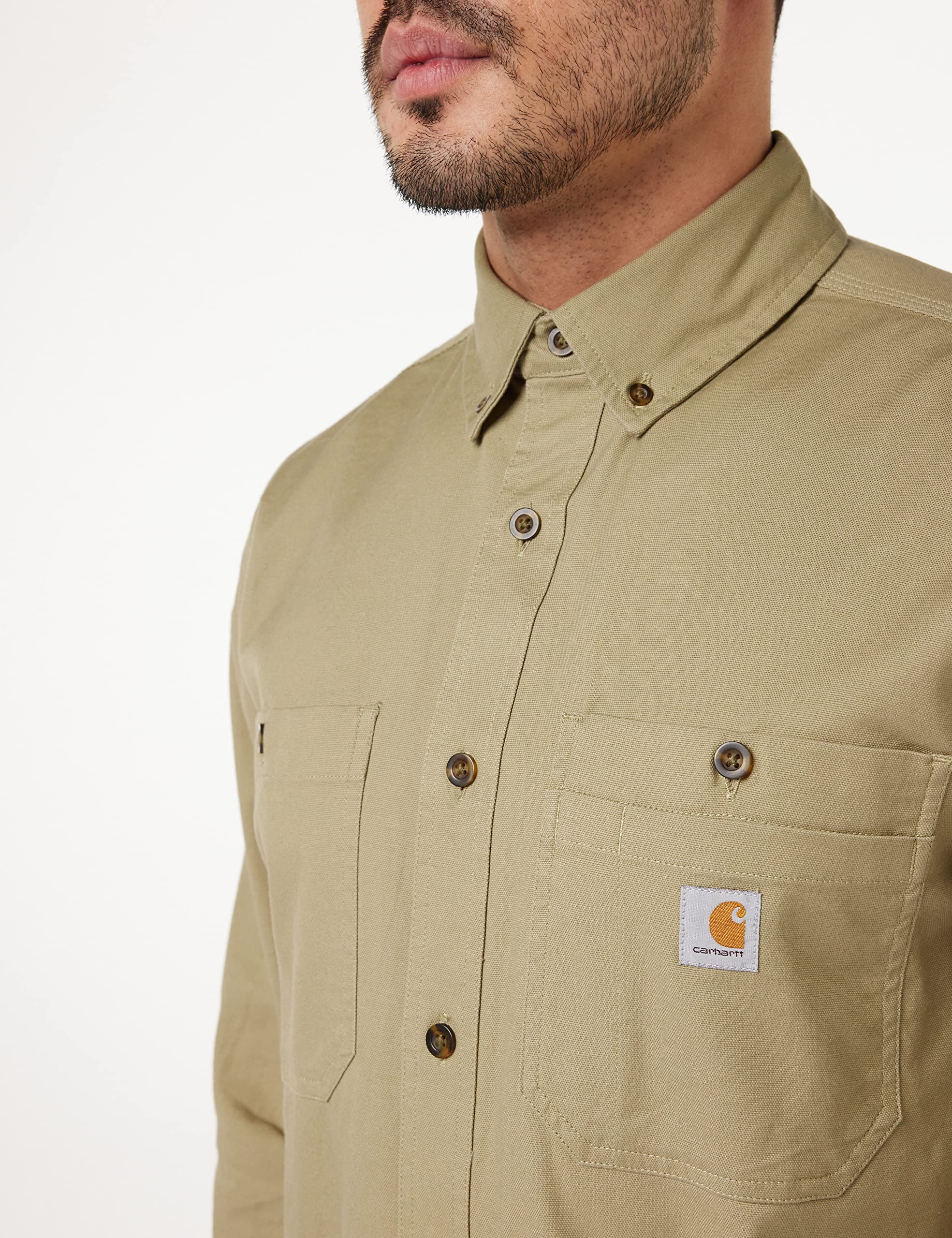 Description This durable work shirt comes standard with built-in stretch, so whatever you're doing, it's easier to do. Relaxed fit 6.5-Ounce, 98% cotton/2% Spandex rugged flex technology for ease of movement two chest pockets with additional left-chest pocket panel for added storage button-down collar two-button adjustable cuffs with extended plackets faux horn buttons drop-tail hem for additional coverage Carhartt-strong triple-stitched main seams imported