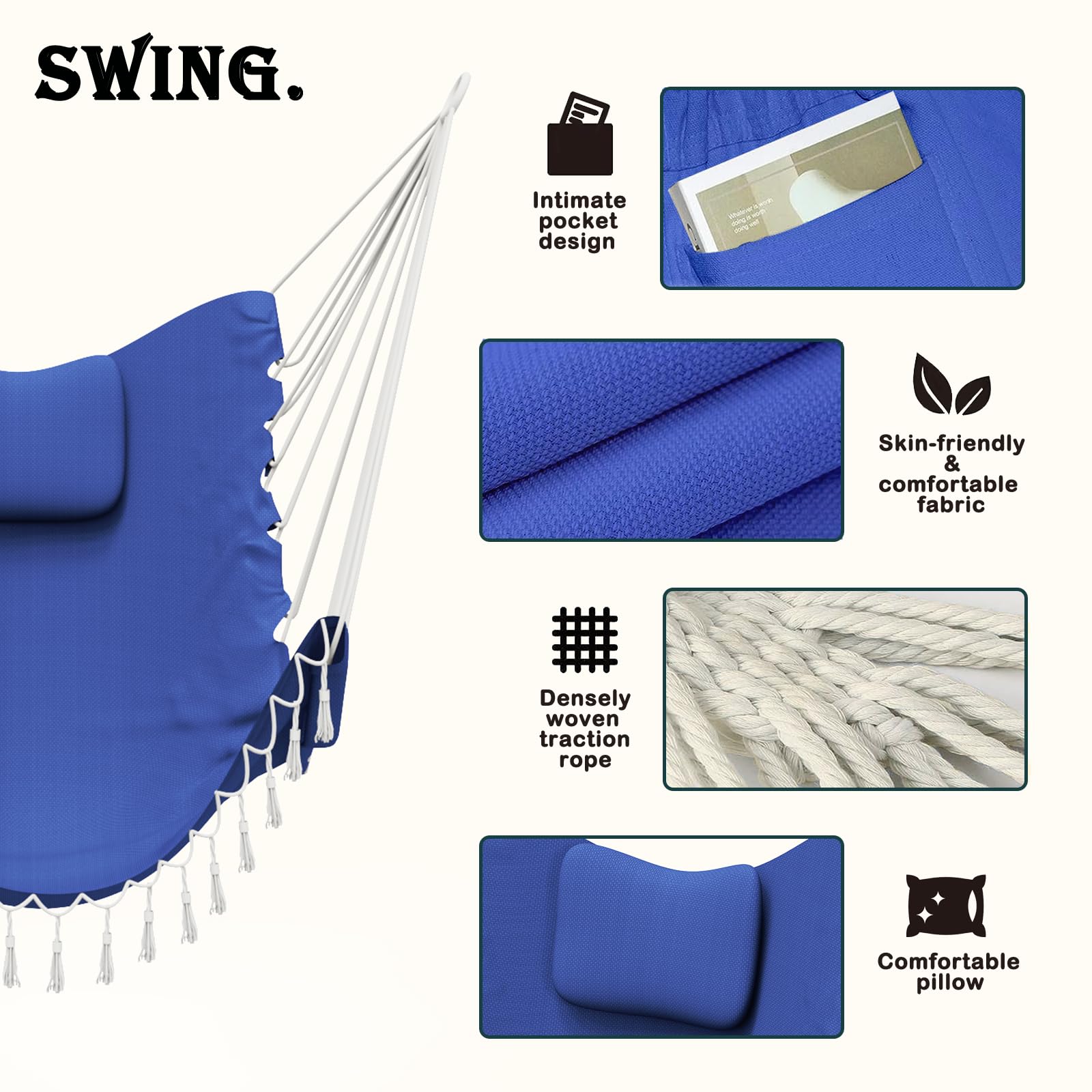 【Complimentary cotton hammock chair】 The swing chair with stand is suitable for most hammock chairs. We also present a hanging chair made of natural long-staple cotton, with excellent softness, durability and comfort. When you sit or lie on the hanging chair, just like sitting on a cloud