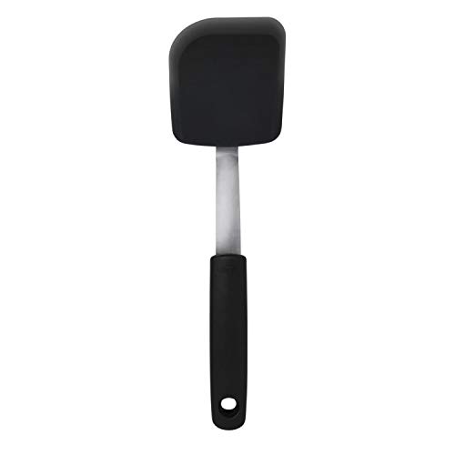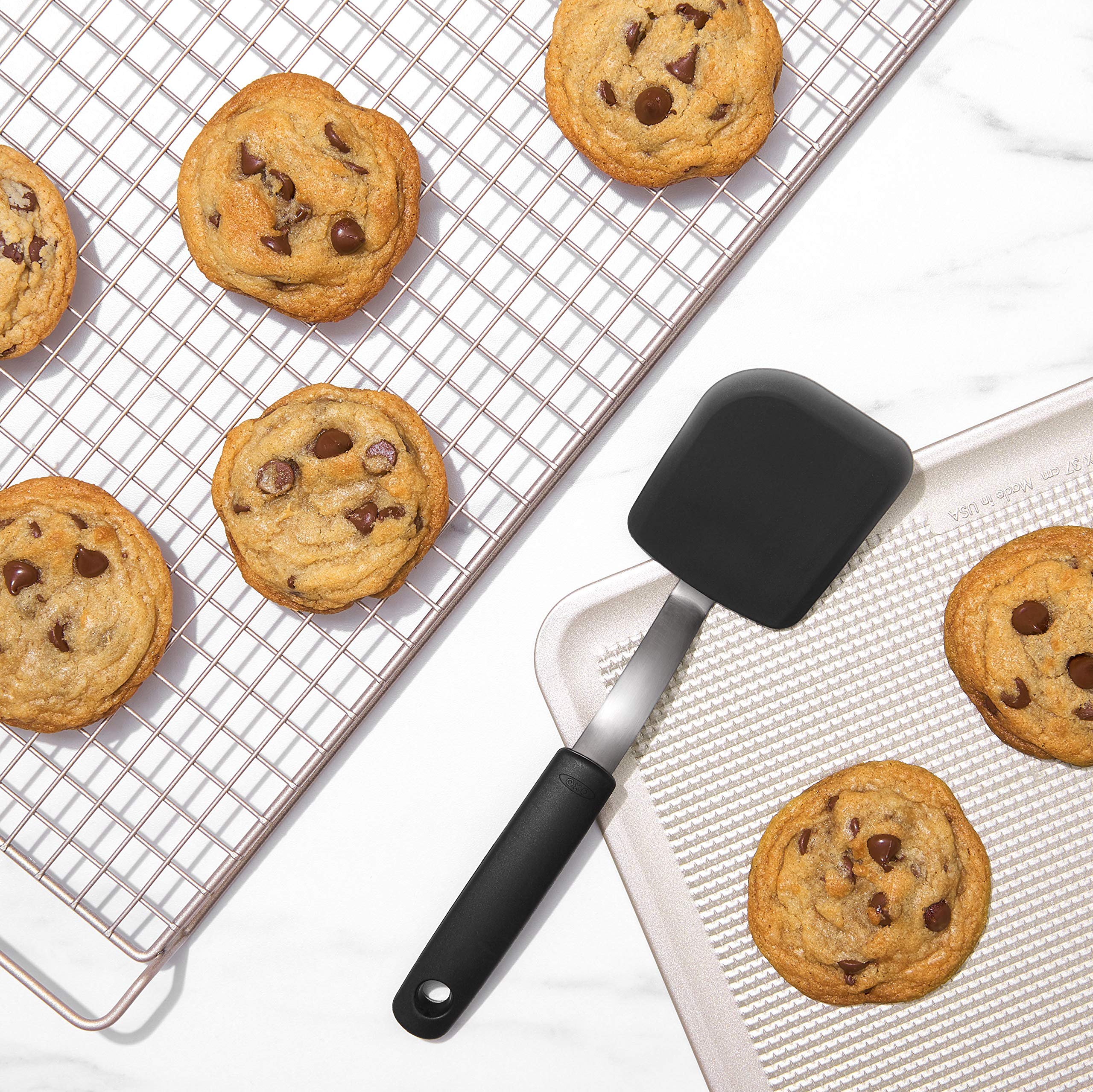 The Oxo Good Grips Cookie Spatula combines the strength of stainless steel with the advantages of silicone. The silicone outer layer, which is heat resistant to 600 Fahrenheit and safe for non-stick cookware, is bonded to a flexible stainless steel core for added stability. The Spatulaβs thin, flexible edge glides easily beneath all foods and is the perfect size for getting between cookies on a crowded baking sheet or removing one brownie at a time from the pan. The rounded corner is great for getting sticky cookie dough out of the spoon and the angled handle keeps your hand away from fragile foods and hot dishes. The Cookie Spatula has a soft, comfortable, non-slip grip and is the perfect companion to non-stick cookware and bakeware.