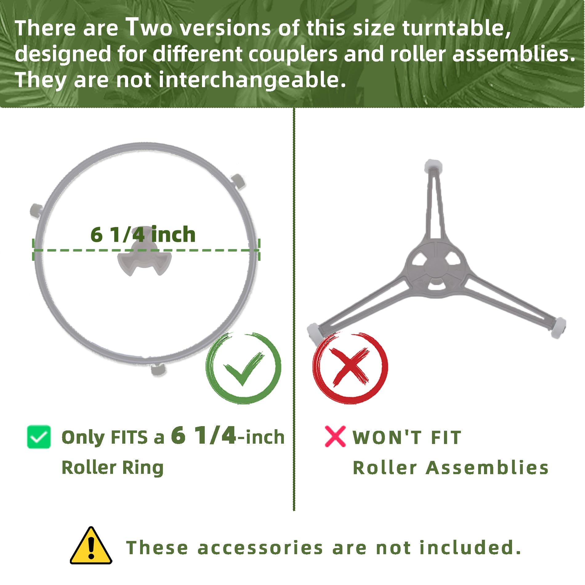 【Measurement 2】The Roller Ring should have a rotating diameter between 5 1/4" and 7". Please Note: This tray is only compatible with 6 1/4-inch roller rings (measured without the white wheels). It will NOT fit the other common 7-inch roller rings (excluding the white wheels). Please double-check your ring size before purchasing