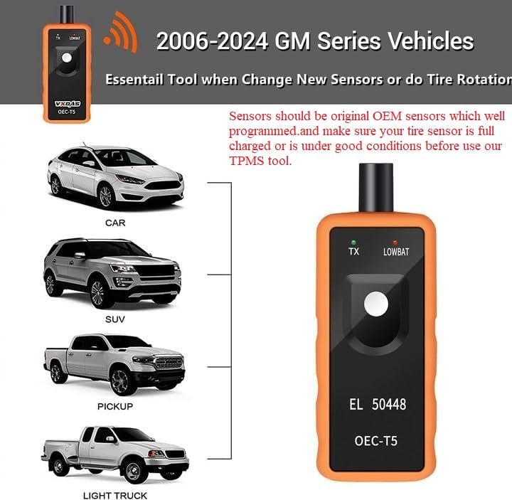 🚗2023 UPDATED FOR WIDER COMPATIBILITY: Specifically designed to work with most GM vehicles 2006-2023 (Chevy / Buick / GMC / Opel /Cadillac and more) equipped with 315/433 MHz. Your vehicle deserves the best tire pressure sensor reset tool.(It is not suitable for heavy trucks with more than 4 tires or vehicles with an external TPMS system.)Tip:Based on factory and customer-tested models shown in A+, please refer to the car model list to confirm compatibility with the VXDAS TPMS tool.