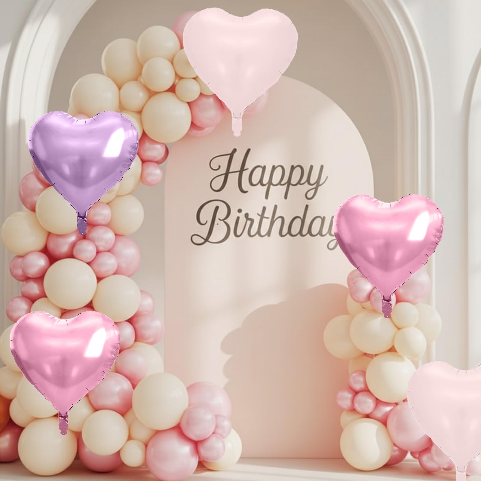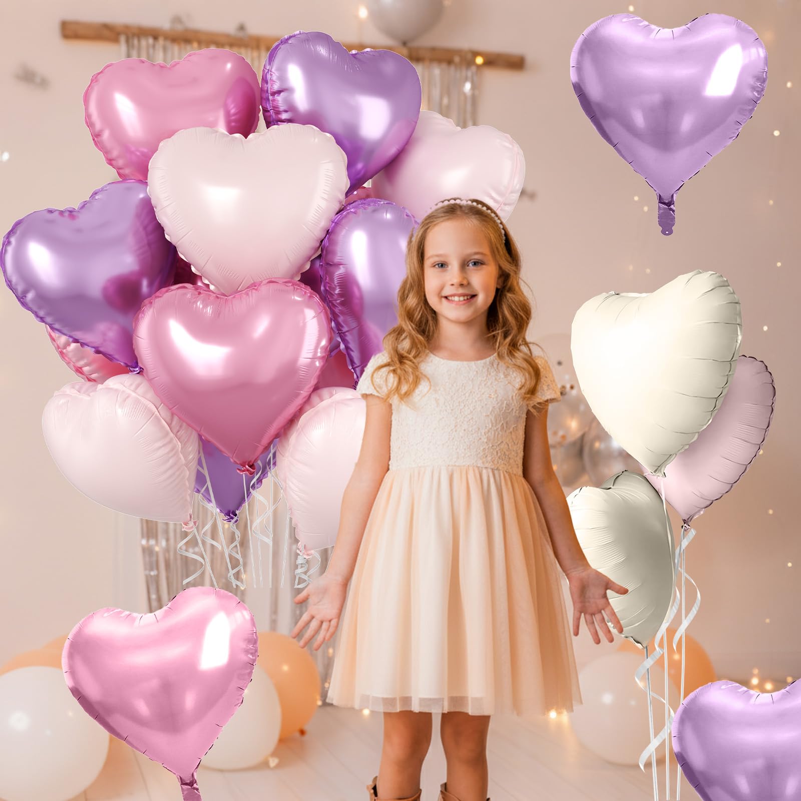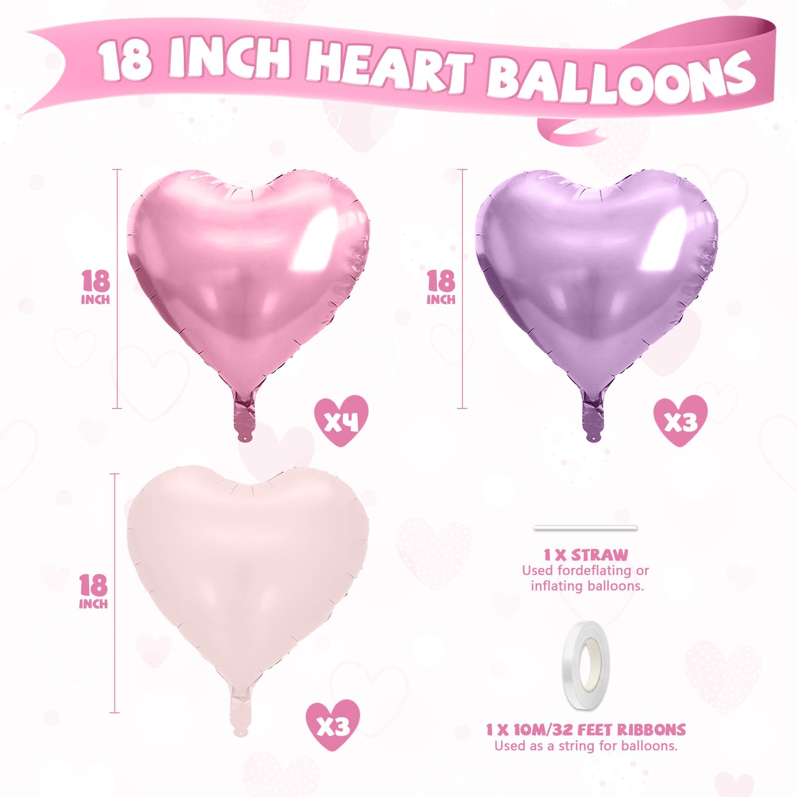 10 Pcs Pink Purple Heart Balloons: Our package includes 4 x 18 inch pearl light pink heart foil balloons, 3 x 18 inch pearl light purple heart foil balloons, 3 x 18 inch matte baby pink heart foil balloons, 1 x straw, and 1 x white ribbon. These pastel balloons create a dreamy and feminine look, ideal for birthdays, weddings, bridal showers, baby showers, and Valentine’s Day celebrations.