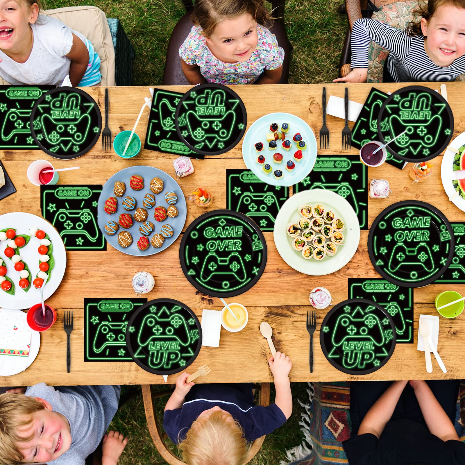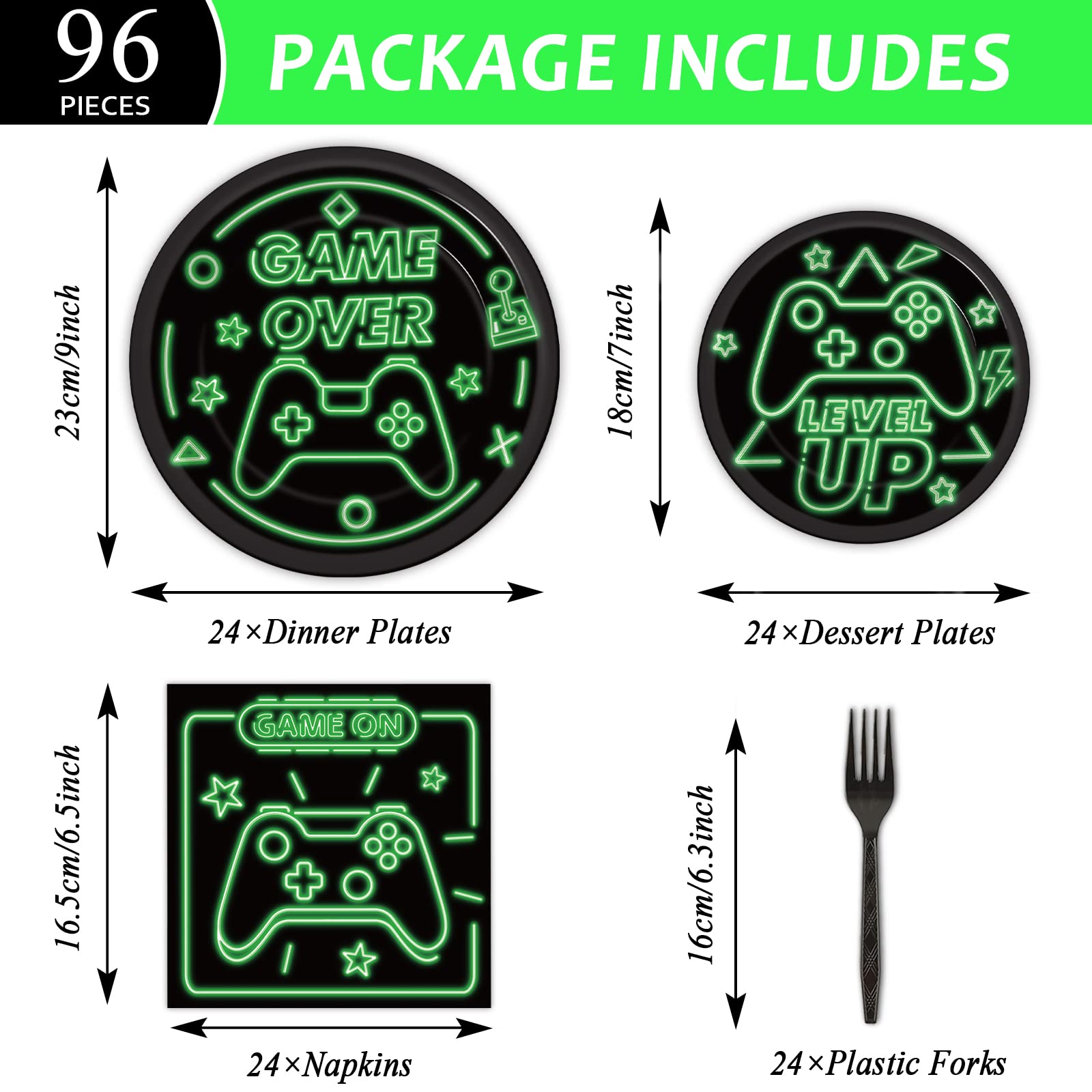【Gamer Party Set Serves 24】: Our gaming party set includes 24 9” dinner plates featuring a game controller on top of the words game over on it, 24 7” dessert plates featuring small game controller and the words level up on it, 50 Luncheon Napkins written “game on” on it, and 24 black forks.