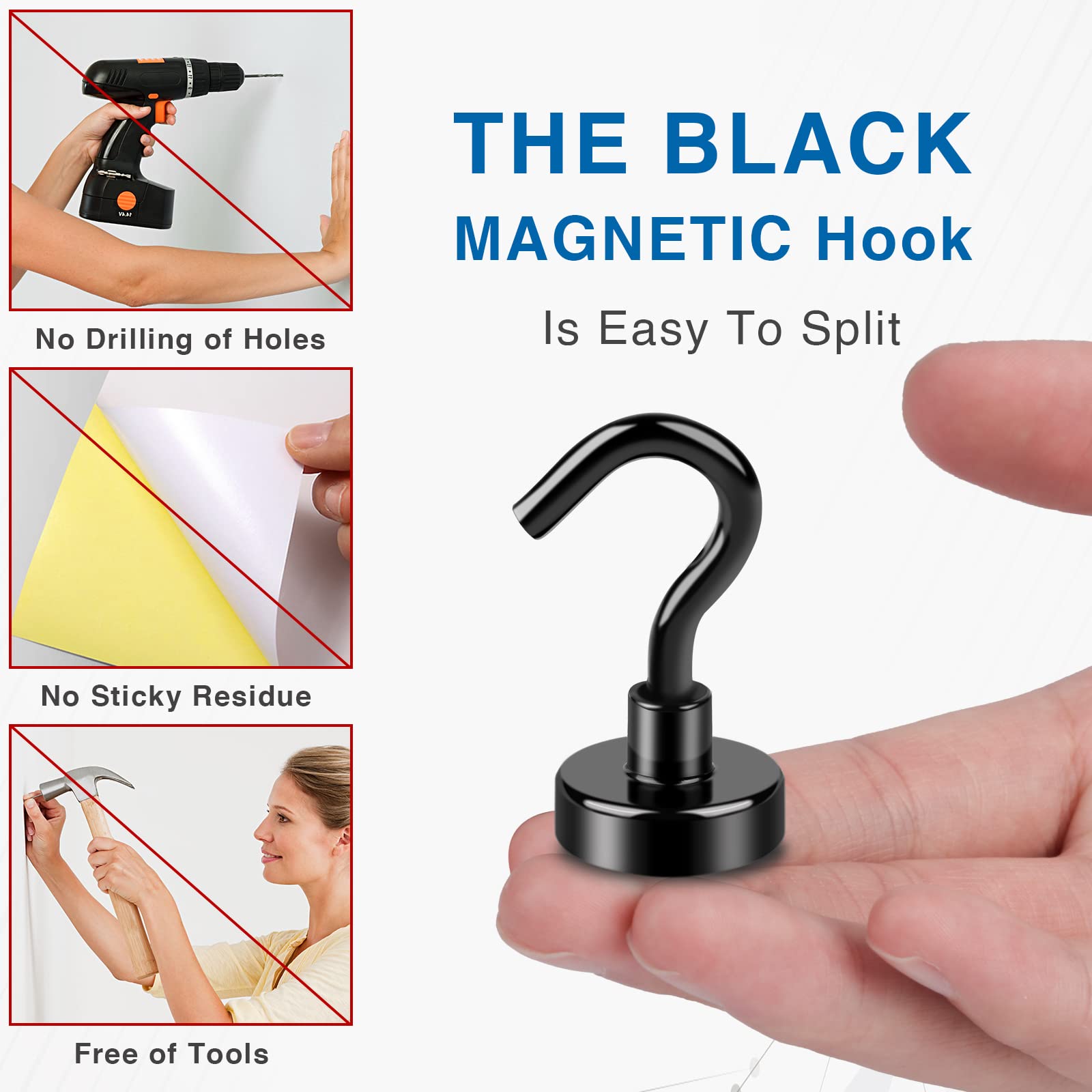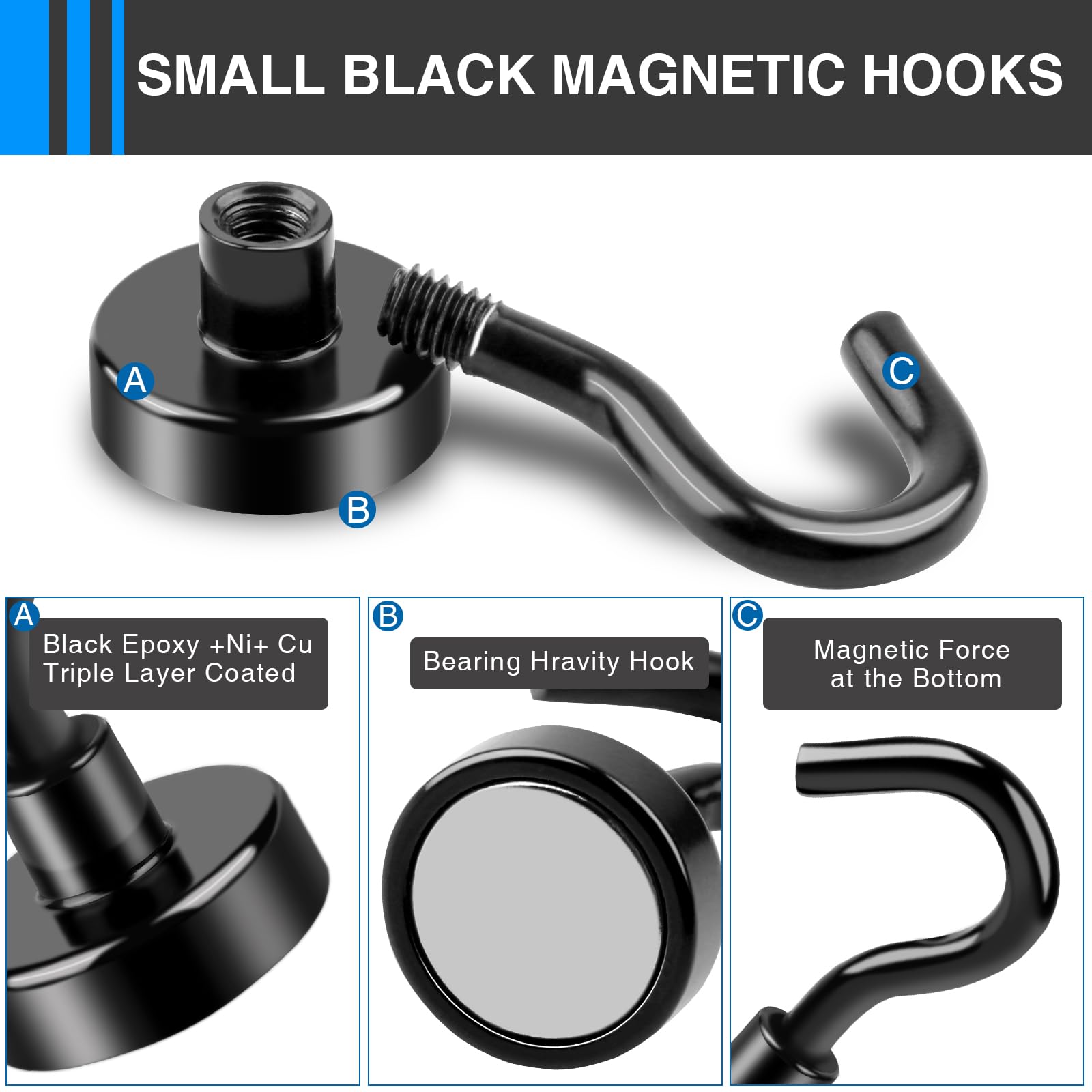 【HIGH QUALITY】--- The black magnetic hook is composed of neodymium magnet and high quality A3 steel. Due to the addition of an iron shell, the suction of magnetic hook is several times that of an ordinary magnet. Metal magnetic hook, strong magnetism forever!
