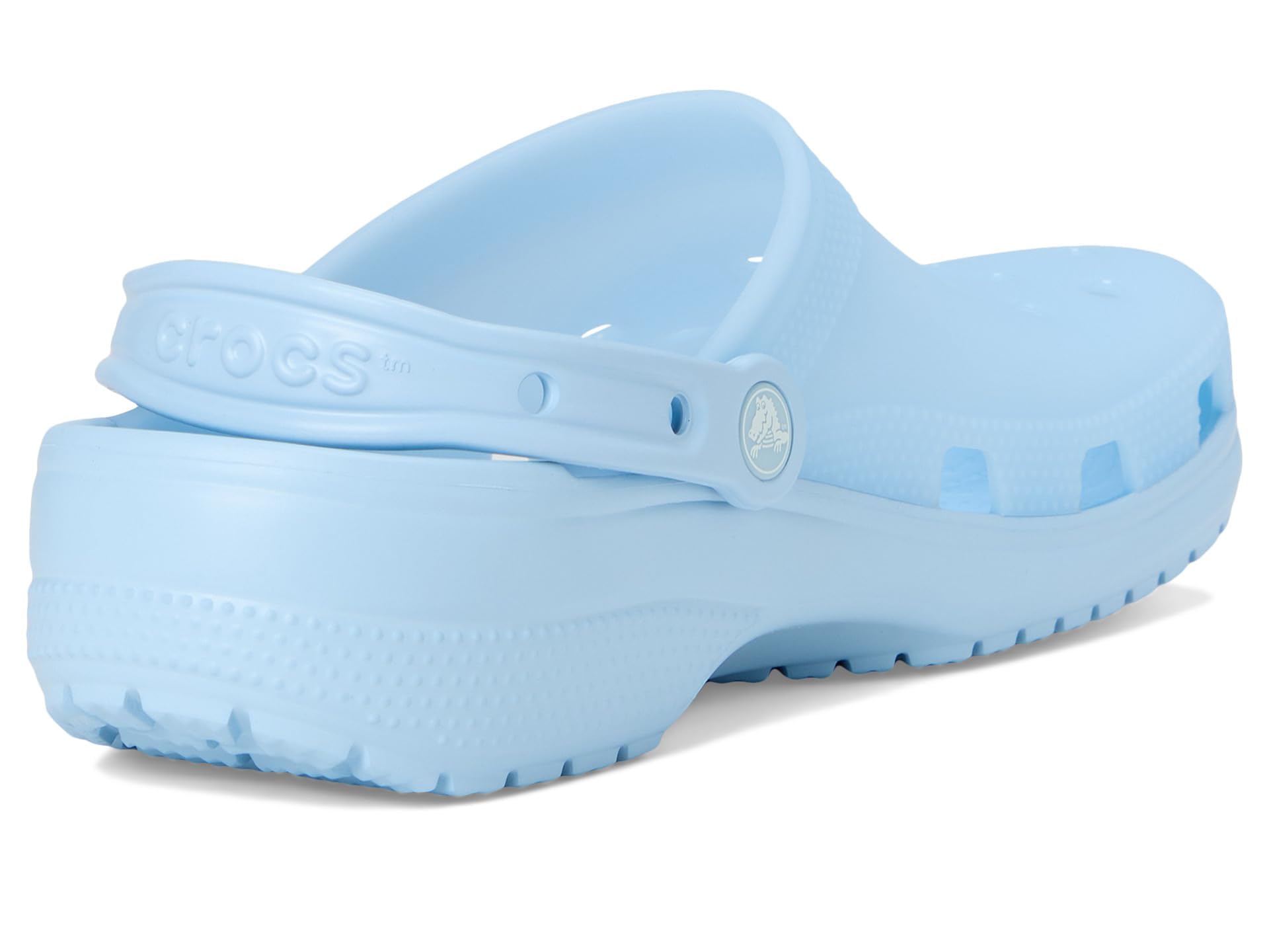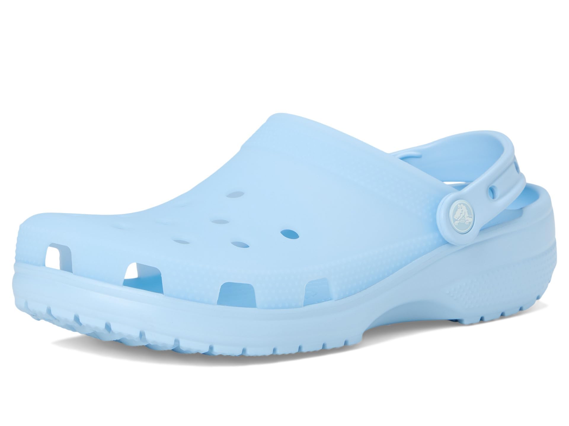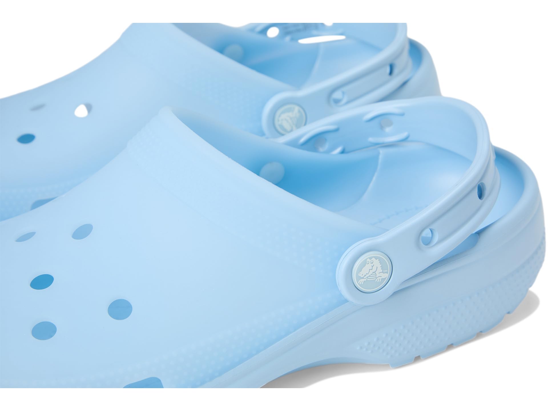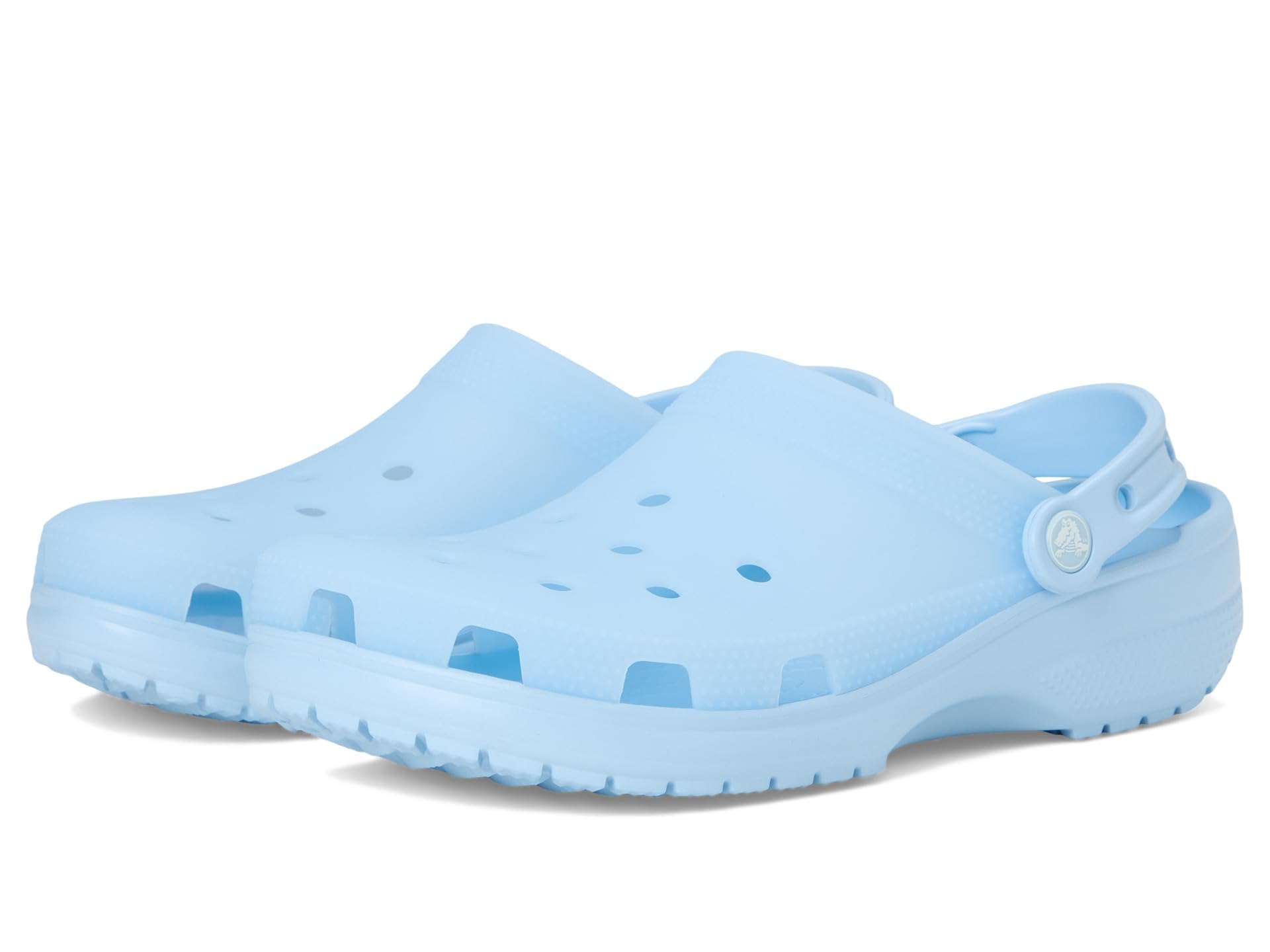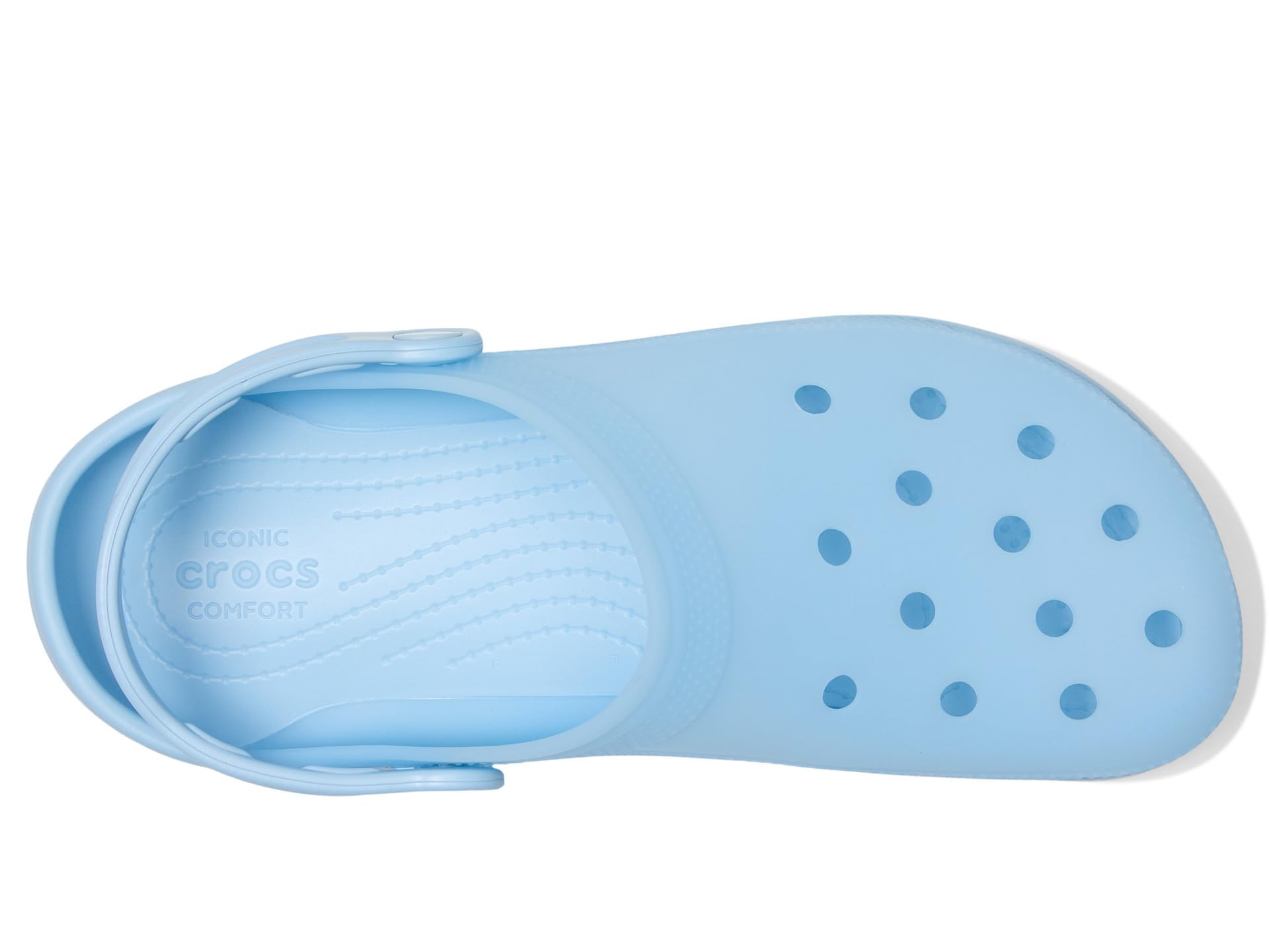 Description Crocs Classic Frosted Clog is an iconic clog that started a comfort revolution around the world! The irreverent go-to comfort shoe that you're sure to fall deeper in love with day after day. It offers lightweight iconic crocs comfort , a color for every personality, and an ongoing invitation to be comfortable in your own shoes. Crafted from EVA upper, and insole, featuring round toe, frosted matte finish adds a stylish touch with subtle color and translucence, provides lightweight, flexible, 360-degree support, and ventilation ports enhance breathability and shed water and debris for all-day comfort. EVA outsole.