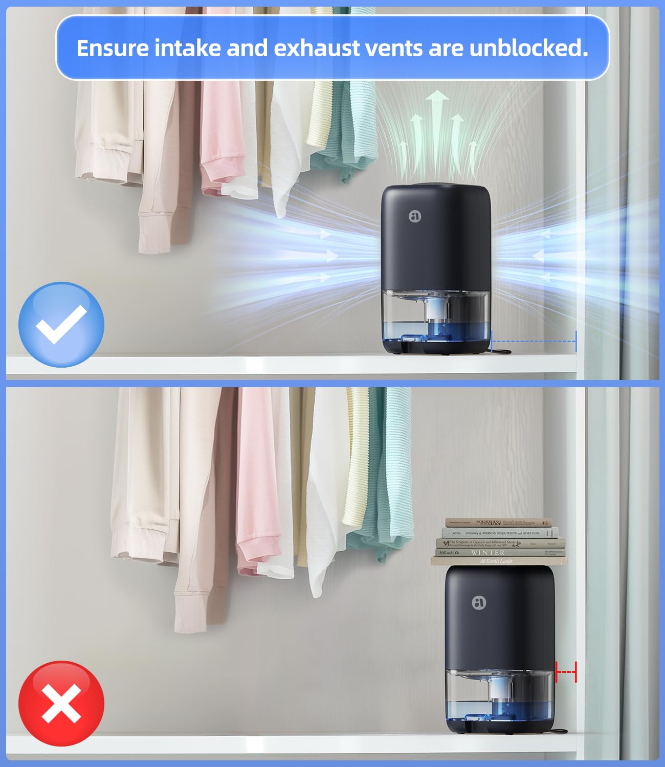 Portable Dehumidifier for Bedroom: With a compact size of 5.9X5.9X10.1 inch and a built-in handle on the back, it is very convenient to be placed everywhere. Whether in the bedroom, bathroom, RV, or closet, it effectively combats excess moisture, ensuring a more comfortable living space