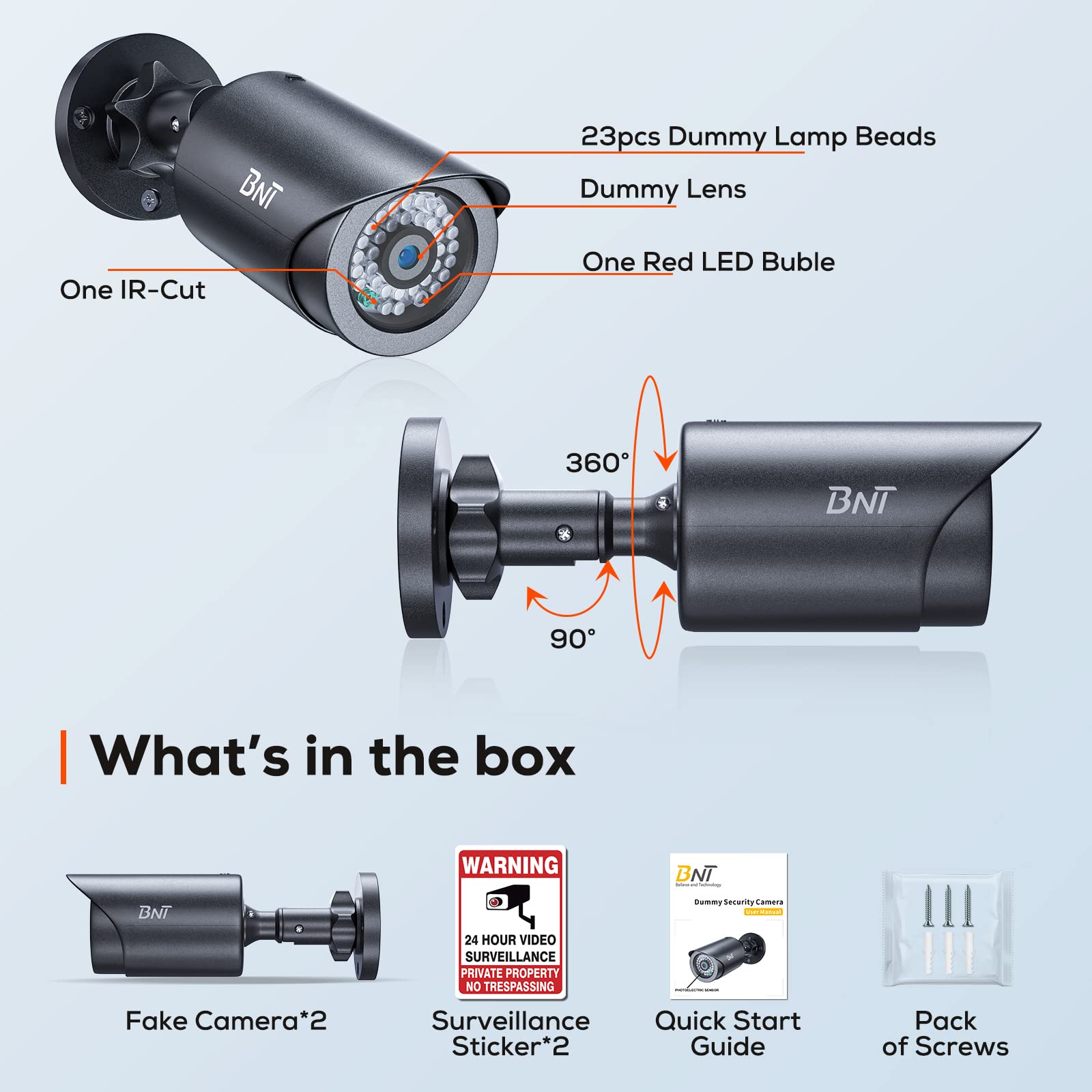HOW TO WORK: With the same appearance to real cameras, people will think it's a real camera, even in the close distance during the day; With the built-in photoelectric sensor, the red LED light only illuminated at night, very eye-catching. They will 7x24 protects your safety.