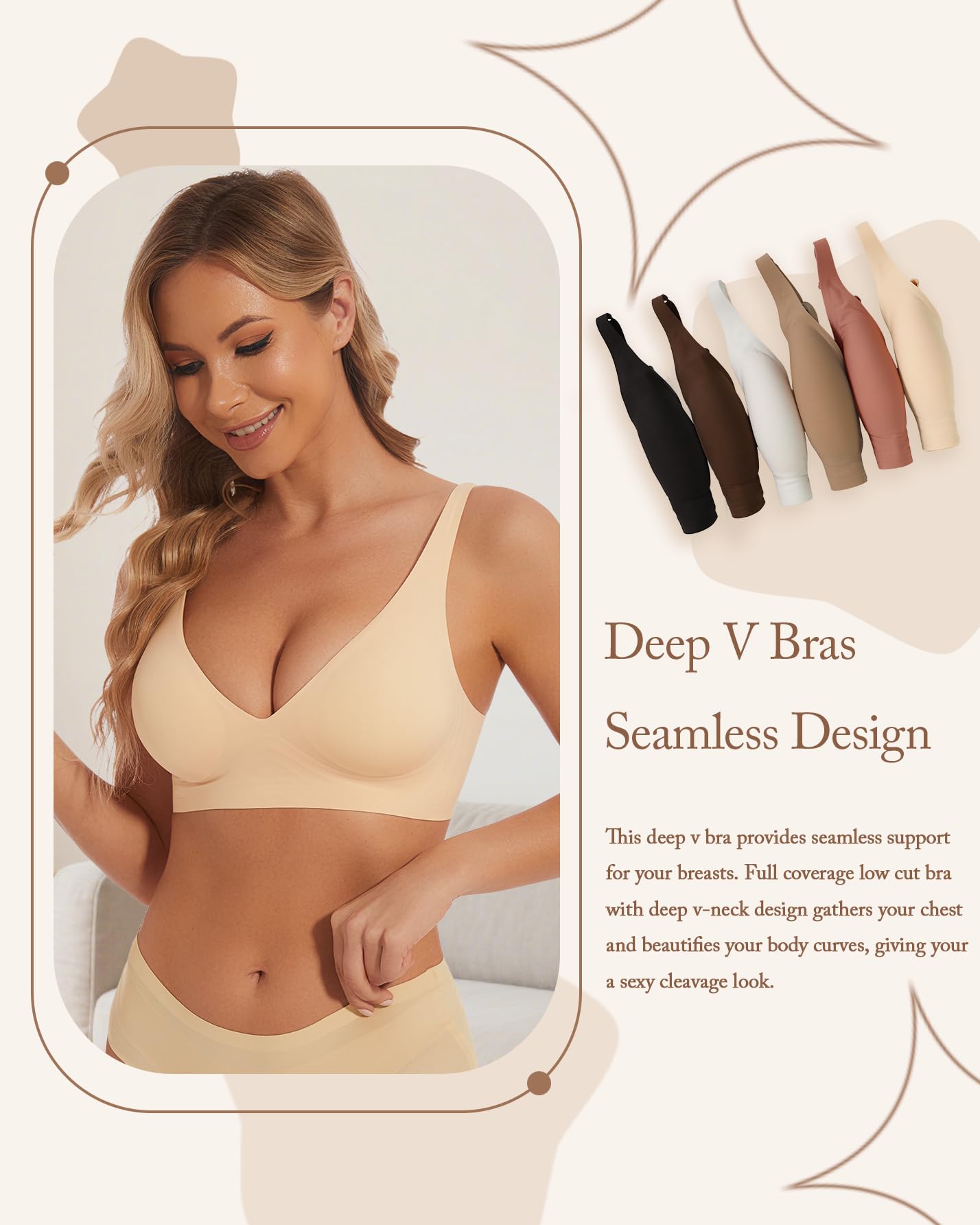 [Low Cut Bra for Deep V Neck - Slightly Push Up Effect]: This low cut bra provides seamless support for your breasts; full coverage bra with deep V-neck design gathers your chest and beautifies your body curves, giving you sexy cleavage look