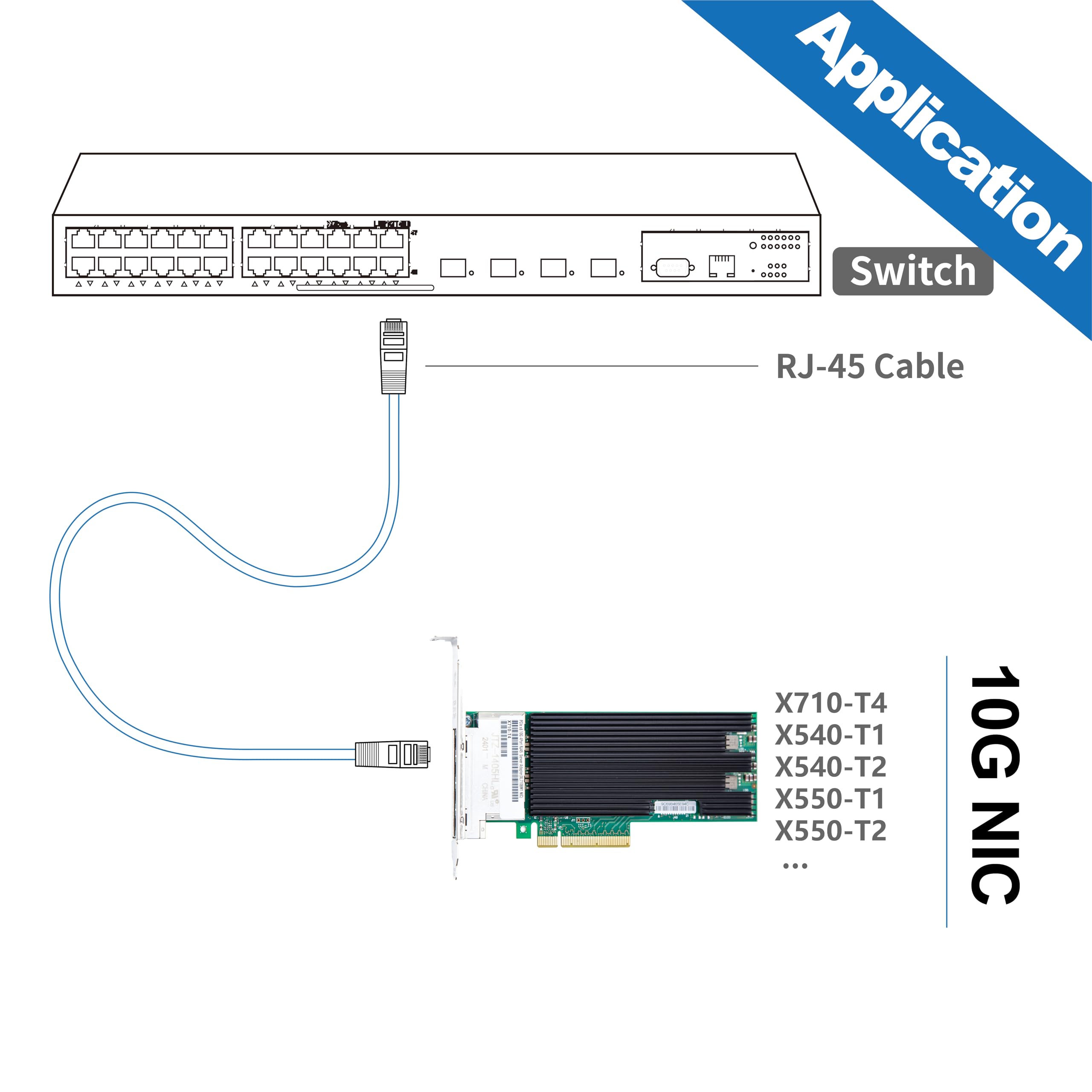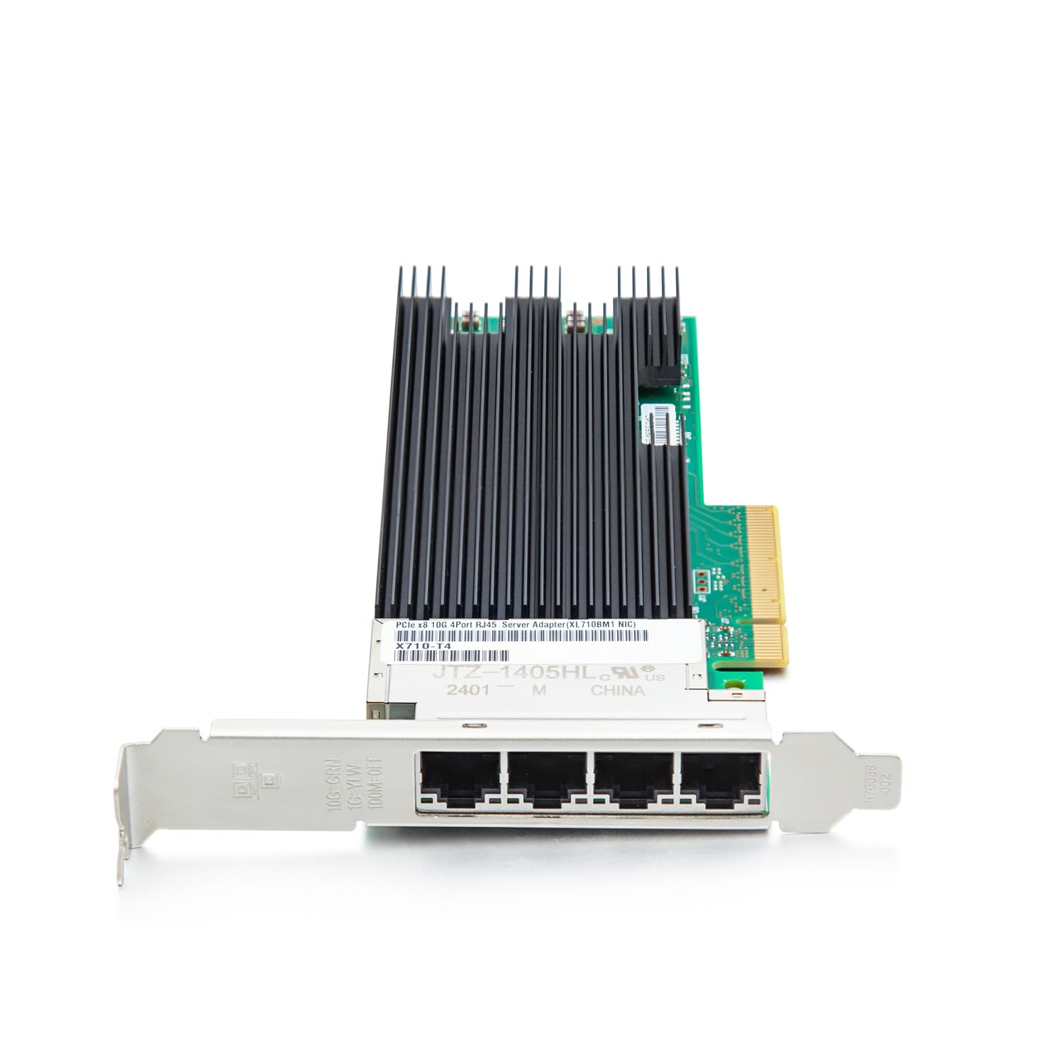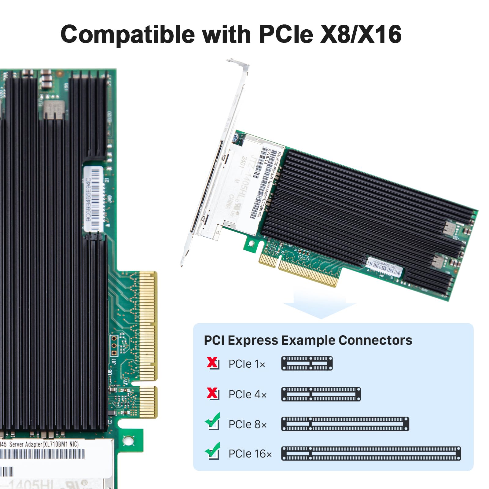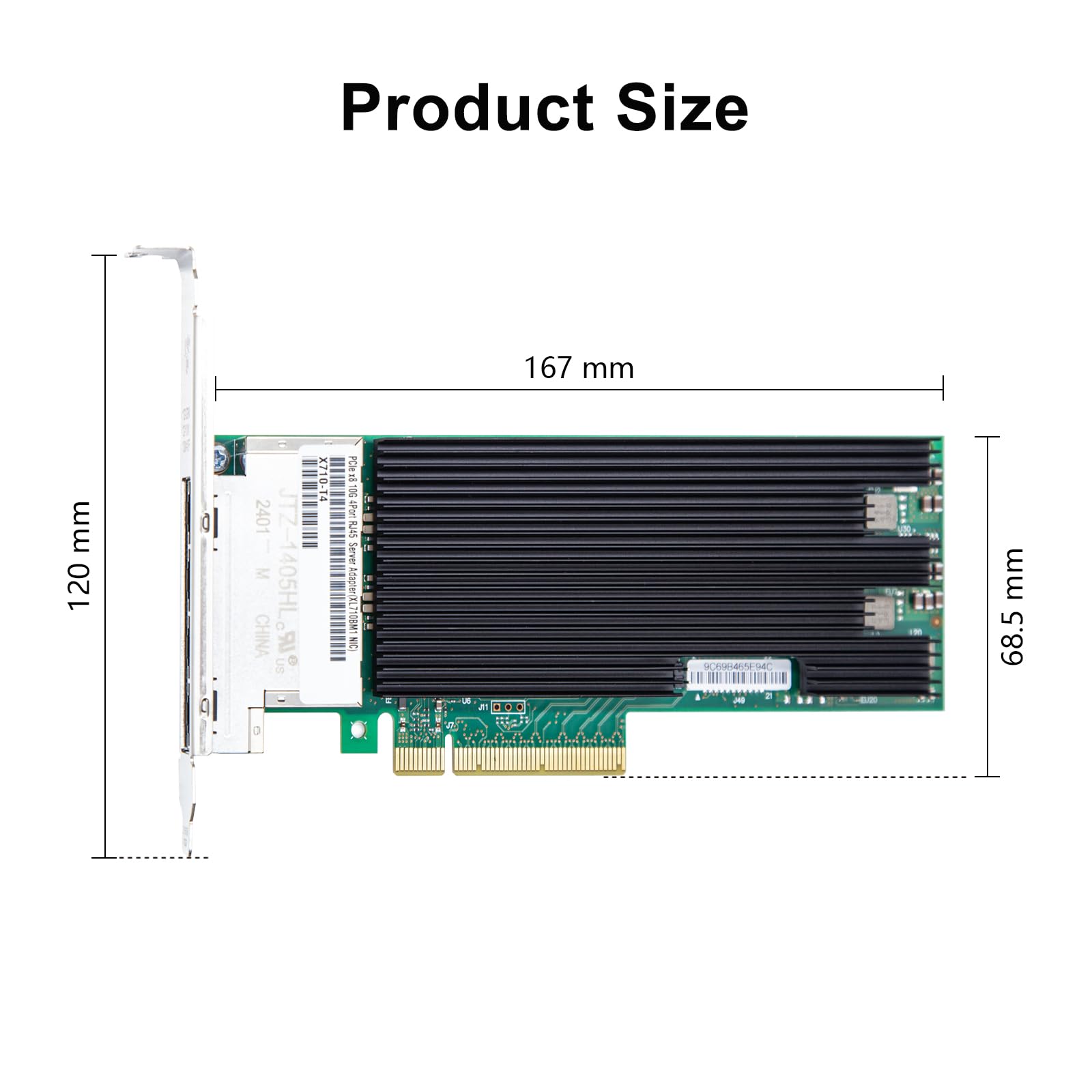 Standard CAT6A cabling with four RJ45 connectors for maximum system density; Backwards compatible with existing 100BASE-T and 1000BASE-T networks; PCI Express (PCIe) 3.0, x8.