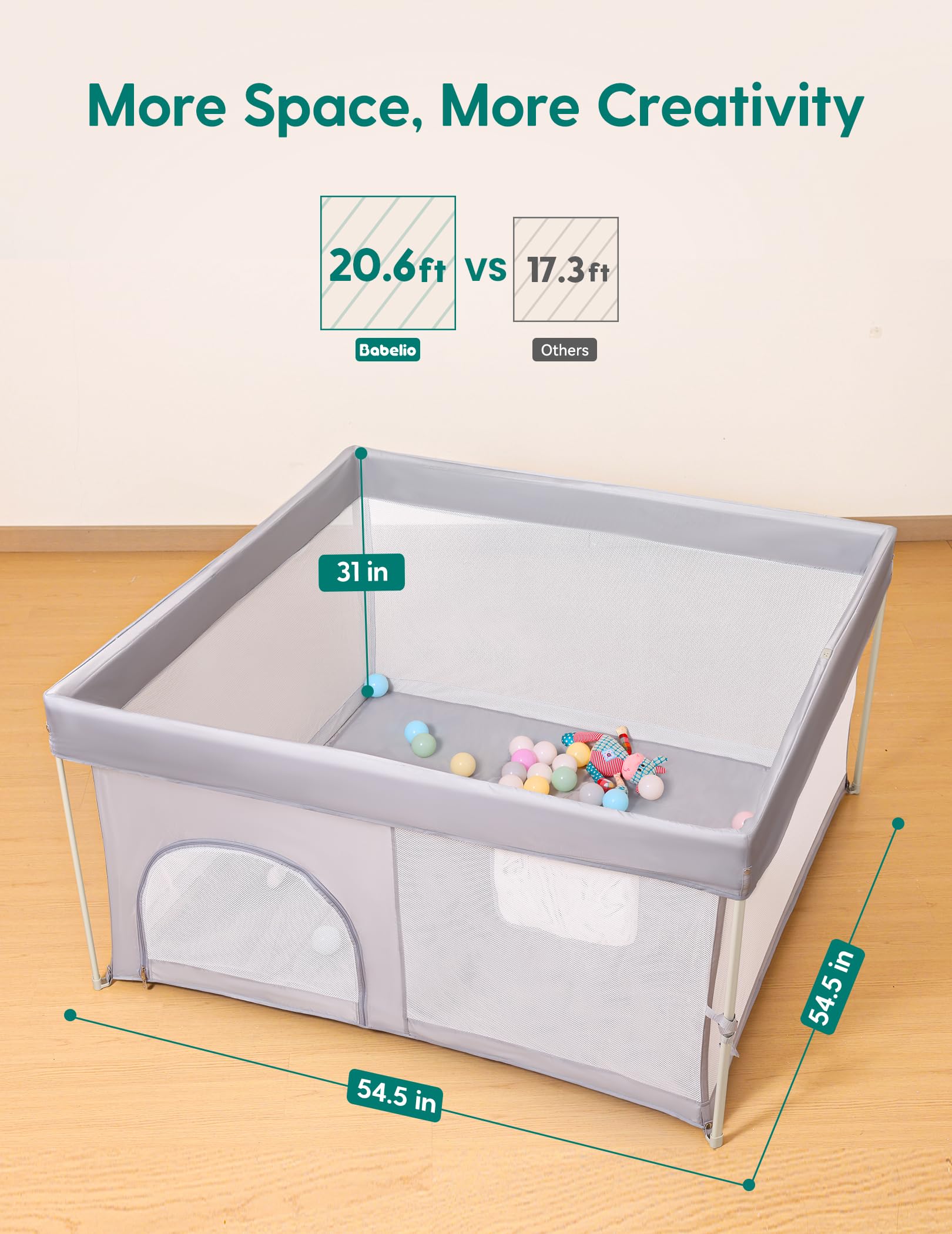 Extra-Large Play Yard: Enjoy a spacious 54.5" x 54.5" play area for your baby. This larger size offers ample room for fun and activities. The removable, easy-to-clean fabric ensures a safe, hygienic space. Perfect for active play without cluttering your home