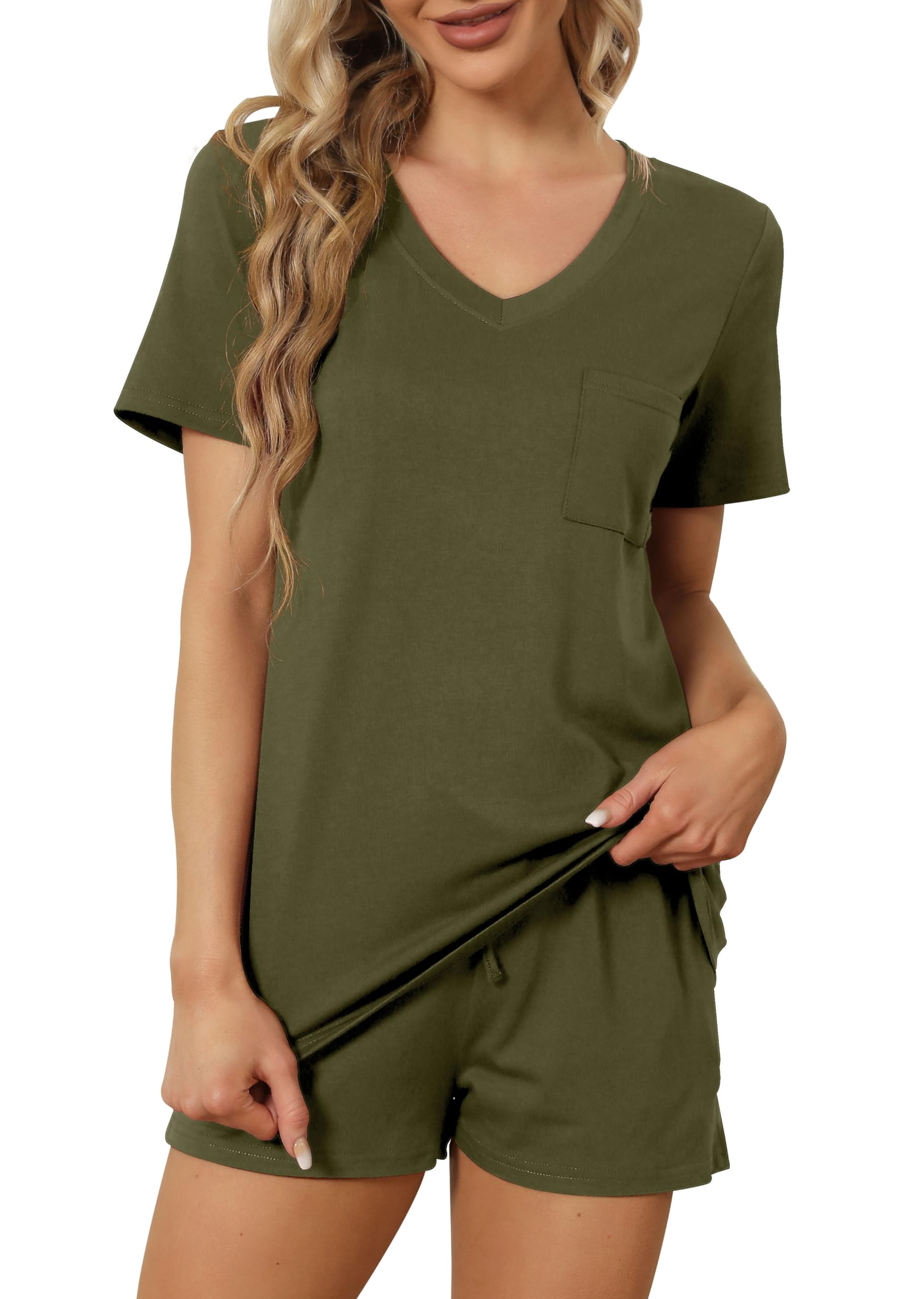 FEATURE --- The package including 1 x short sleeve t-shirt and 1 x short. The top has classic v neckline and a pocket. The short has elastic drawstring and side pockets. The cute top is perfectly complemented by shorts. Casual and sexy in daily life.