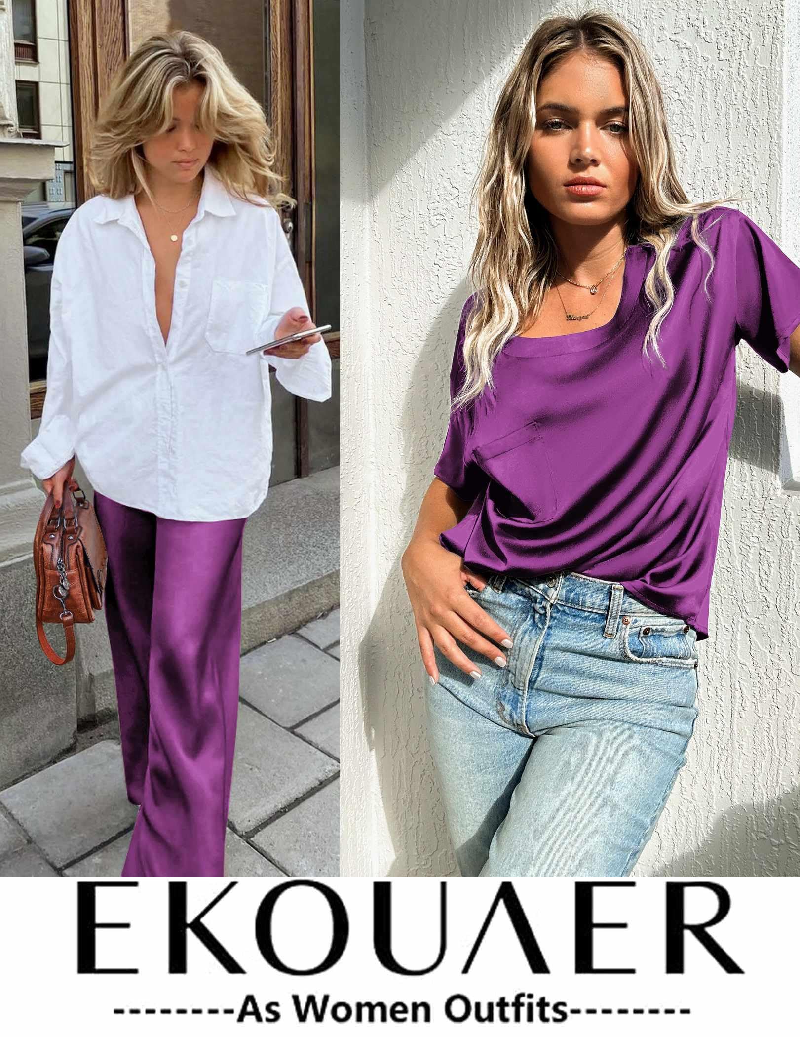 Top: Loose fit, satin short sleeve t-shirt. Solid color, crewneck, and a chest pocket casual nightwear.