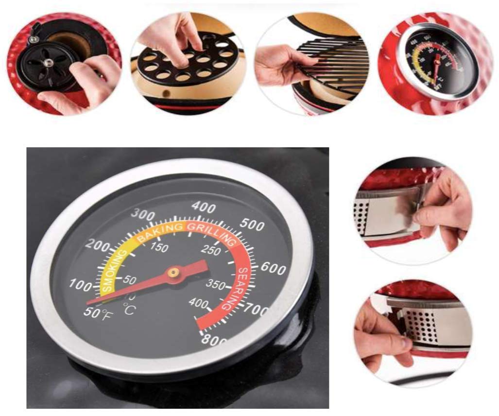 DESIGNED with the griller in mind – Premium glass fiber gasket with thermometer, cast iron top vent, stainless steel bottom vent, inner fire bowl, cast iron charcoal grate, 11” easy clean stainless steel cooking grate.