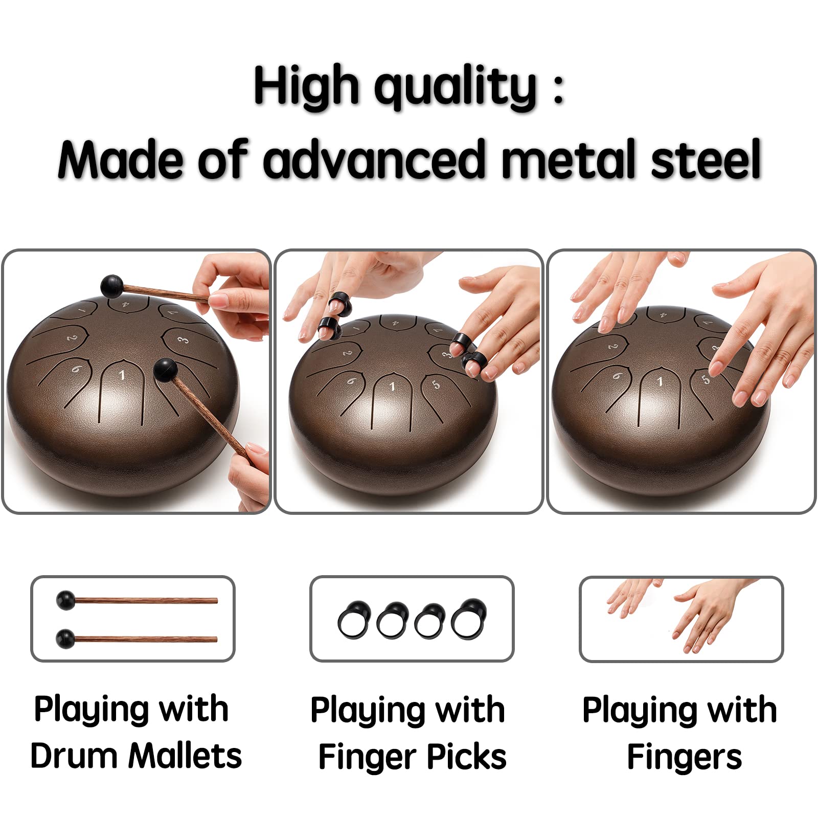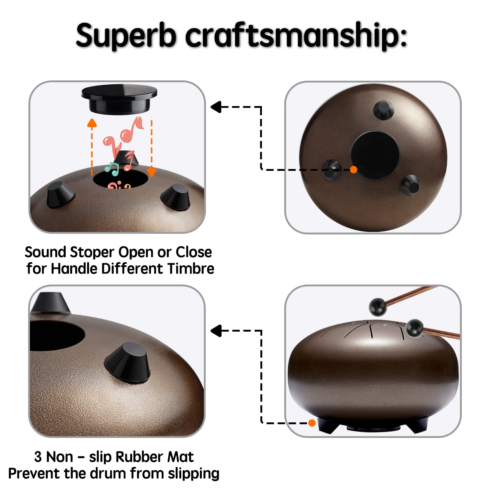 π Accessories Upgrade: 6 inch steel drum, drum mallets, drum bag, finger plectrums, spare note stickers, sheet music, mallets stand. Steel drum are a total of 8 tones, which have a wider range of sound and can play more music. You can play steel drum with the included drum mallets or with you hands, and the included note enable beginners to learn and play it more easily. Steel drum comes with a carry-on bag for easy carryinag