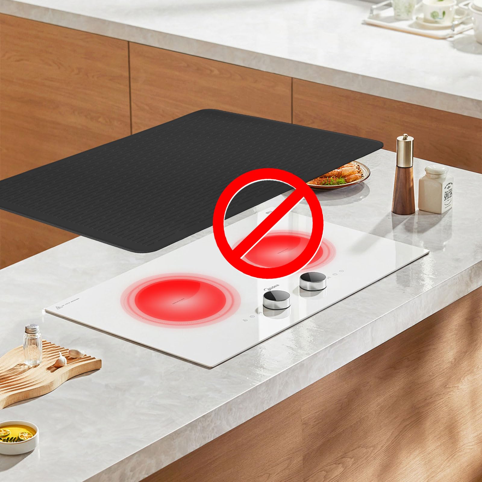 Anti Scalding Silicone Mat: Our glass-top stove cover doubles as a silicone trivet mat that can hold hot pots and pans. Heat resistant up to 400°F, its raised wide ridges separate the hot pot from the table and protect your kitchen surfaces from scalding. Attention!*Do NOT put the electric cooktop cover on the electric range while it's ON to prevent damage.
