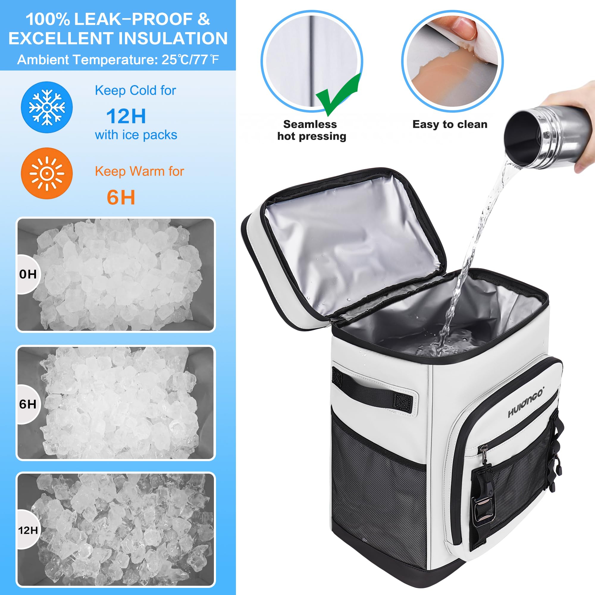 Leak-proof and Sweat-free: Our cooler backpack utilizes a high-tech seamless hot pressing process, making it completely leak-proof. Moreover, the additional smooth horizontal zippers enhance its anti-leaking properties