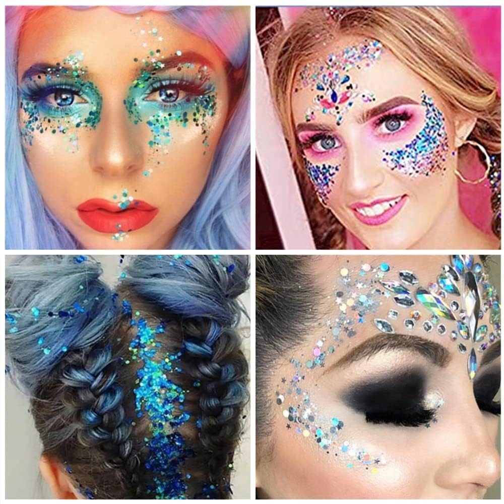 【Perfect for Party on Festival Halloween Rave Accessories】Super Ideas For Makeup Festival Glittery Face Paintings Jewels Festival Rave Accessories for masquerade club, rave.The stunning glitter makes you stand out in themed parties.Suitable for Festival,Party,Wedding and Halloween,Christmas ,Birthday ,Stage and so on.