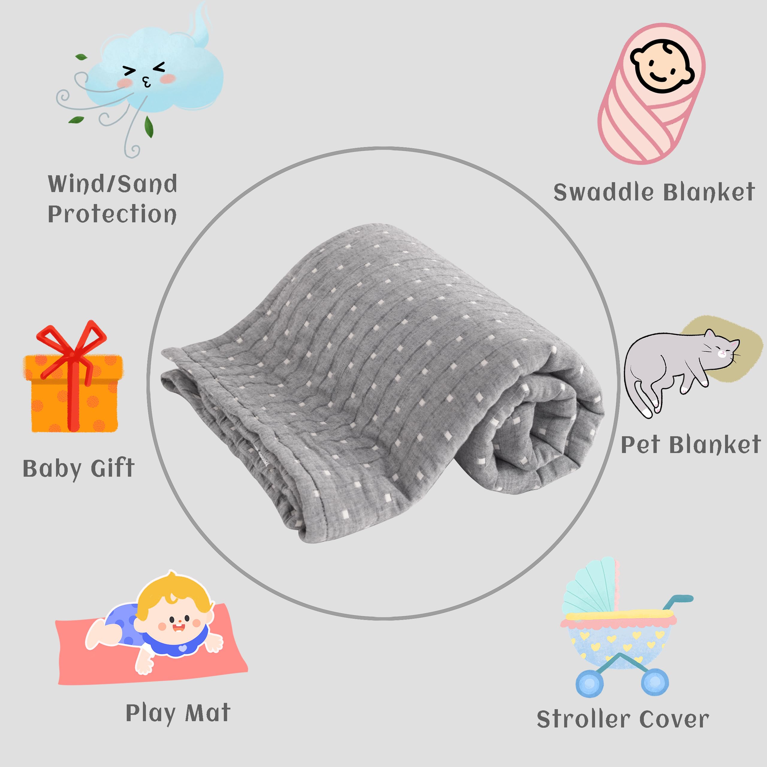 Multiple use: These muslin blankets can be used for tummy time, traveling, cuddling, stroller and car seat use, picnics, and even as a throw blanket.