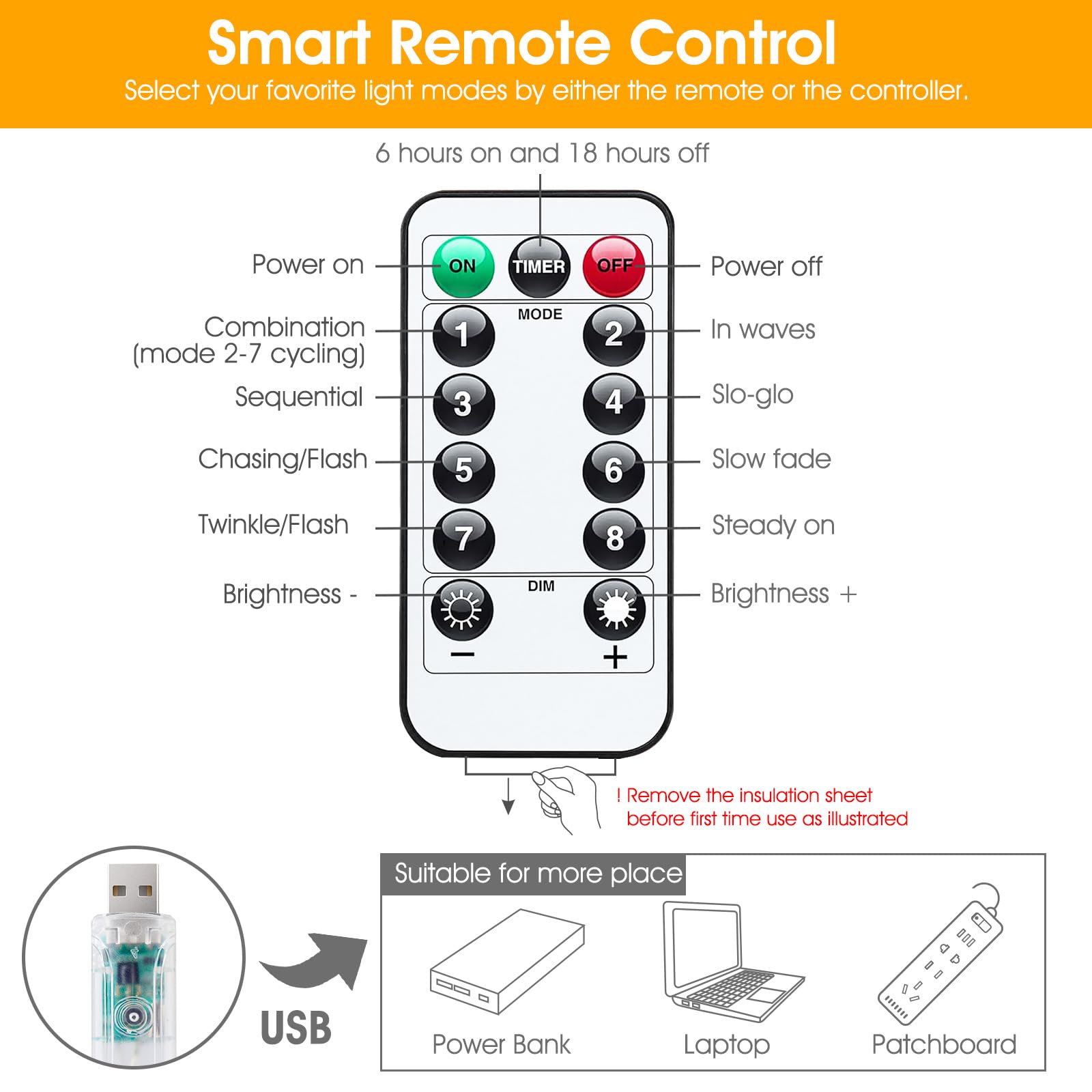 [ 8 Modes & Memory Function ] - The string lights have 8 lighting modes: Combination, in waves, sequential, slogs, chasing, slow fade, twinkle, steady on. With a memory function, the mode that is turned on again after being turned off is that before turning off.