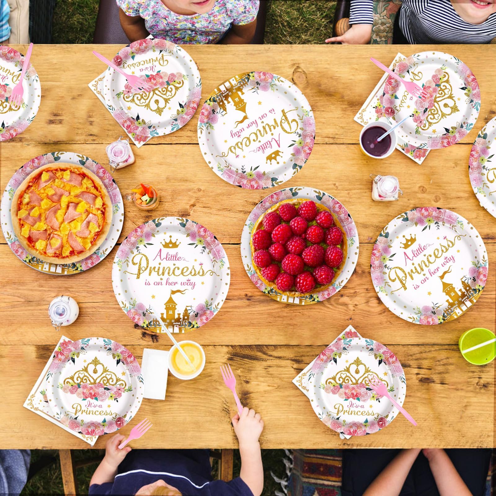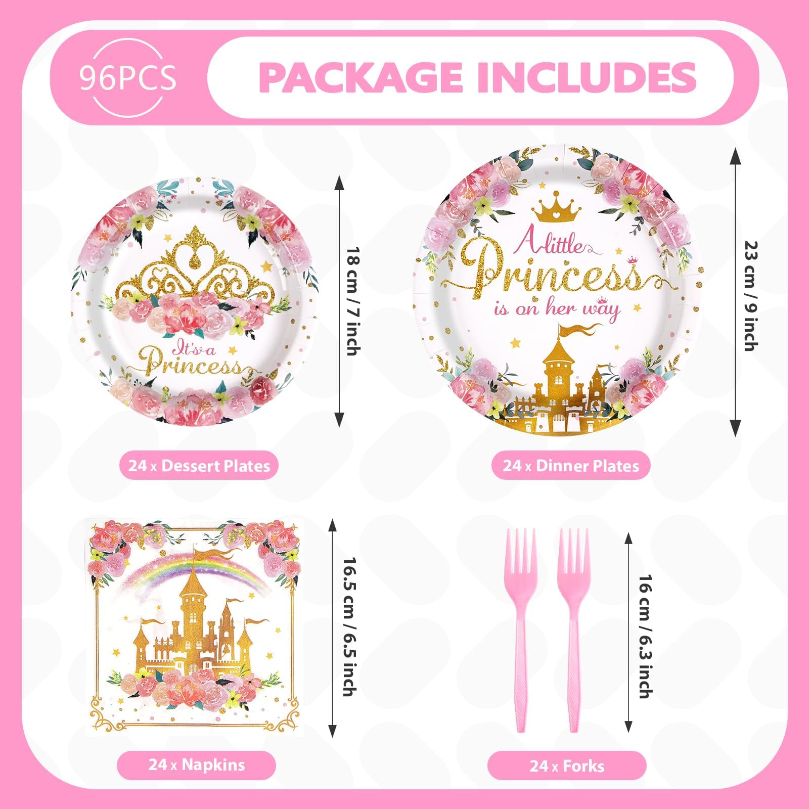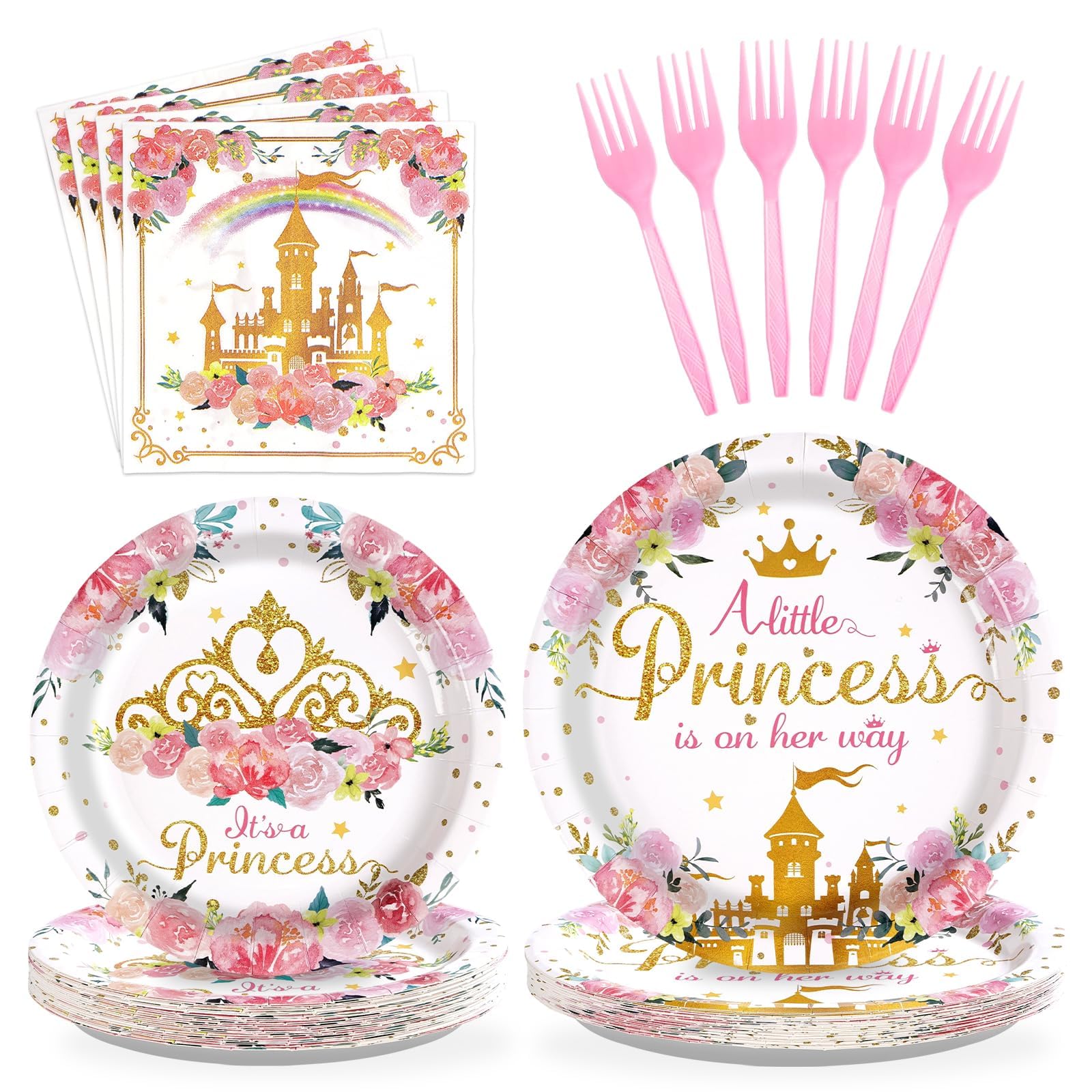 What You Get: The 96 pcs a little princess is on her way tableware set is a must-have for your girl's special day, including 24 9" princess plates, 24 7" princess plates, 24 princess napkins and 24 forks for up to 24 guests, adding a sweet touch to a princess birthday party