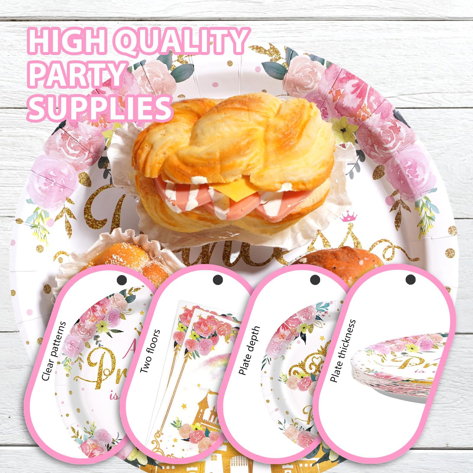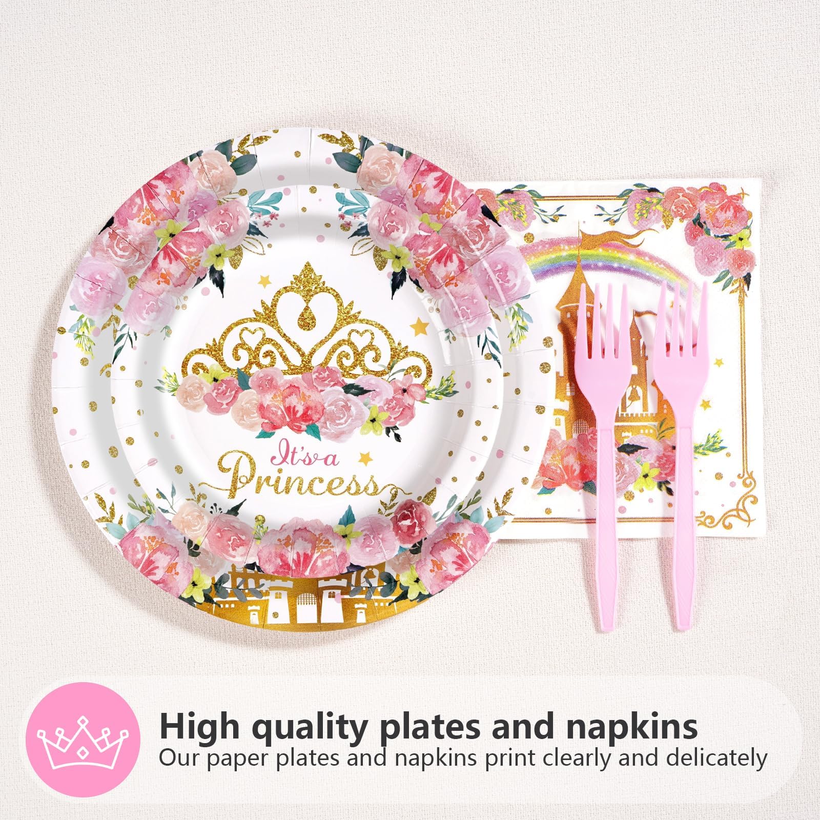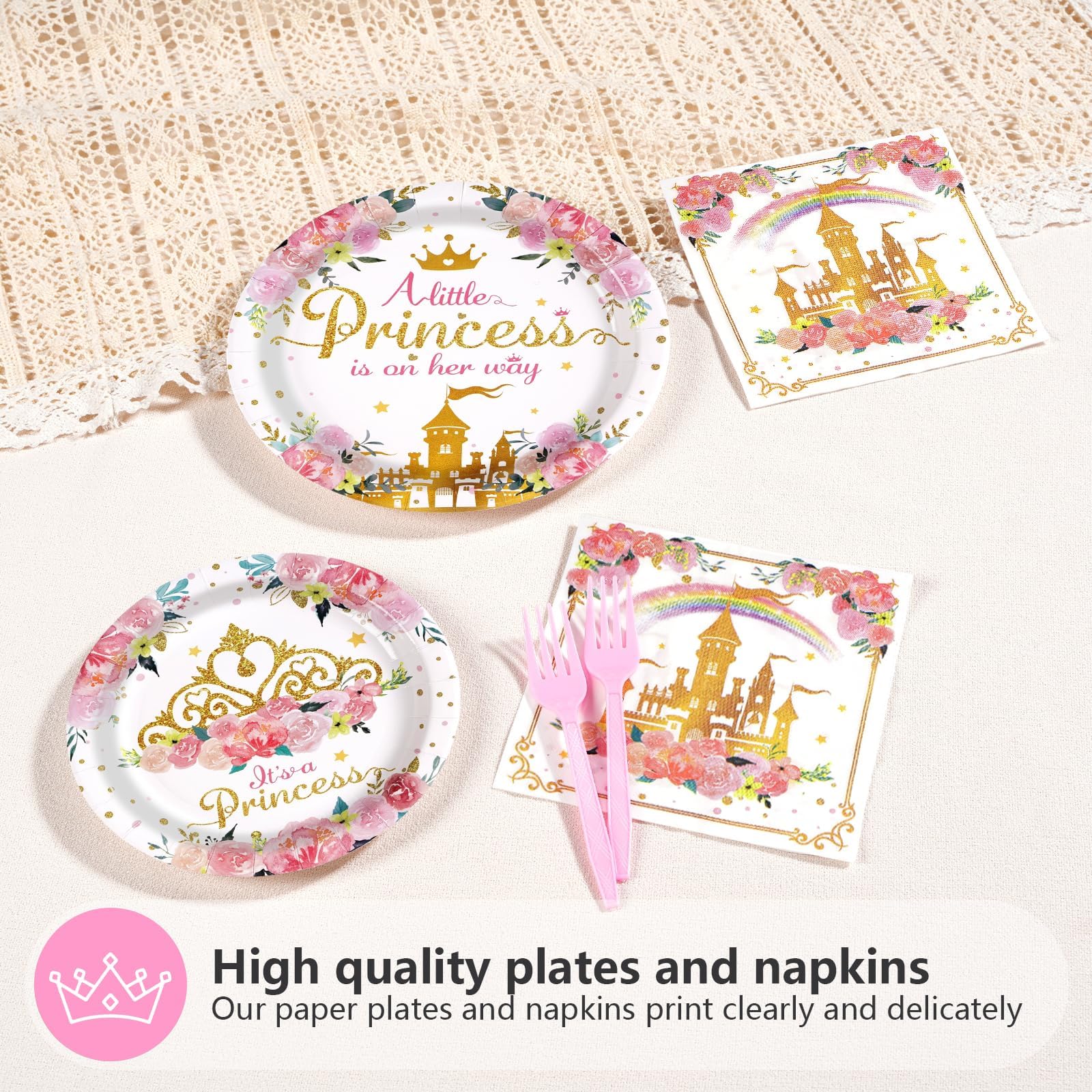 Upgraded Material: All princess baby shower plates and napkins are made of high quality thick paper. Princess paper plates are upgraded to 350g, more solid and durable and cut-resistant; napkins are added to 2 ply, thicker and softer and more absorbent; forks are not easy to break; patterns and colors are beautifully printed and won't fade. Premium materials ensure you have a sweet and fun dining experience (Tip: Please do not microwave the plate)