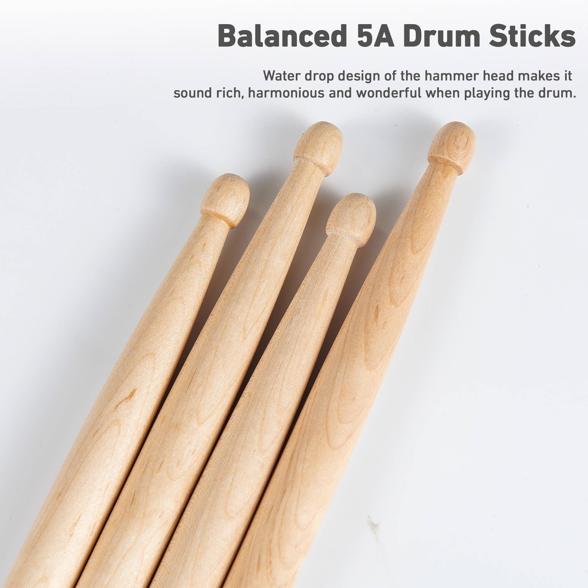 NATURAL FINISH - Comfortable and Slip Resistant. Each drum stick meets the 5A specifications, featuring a comfortable grip and versatile performance.
