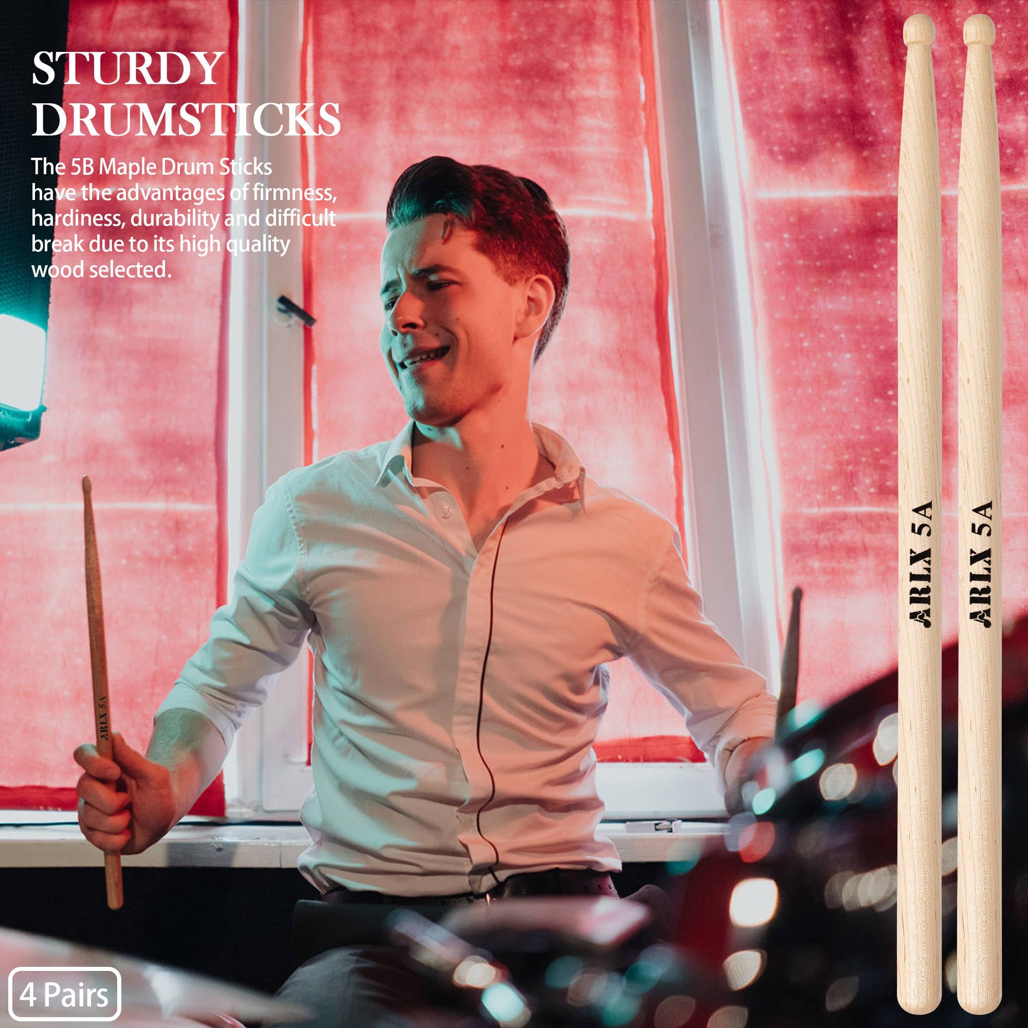 PROFESSIONAL 5A DRUM STICKS - Package includes 4 pairs of drum sticks. Suitable for drummers of all genres, these 4 pairs of drum sticks can be prepared for live performances, studio recordings, and practice sessions.