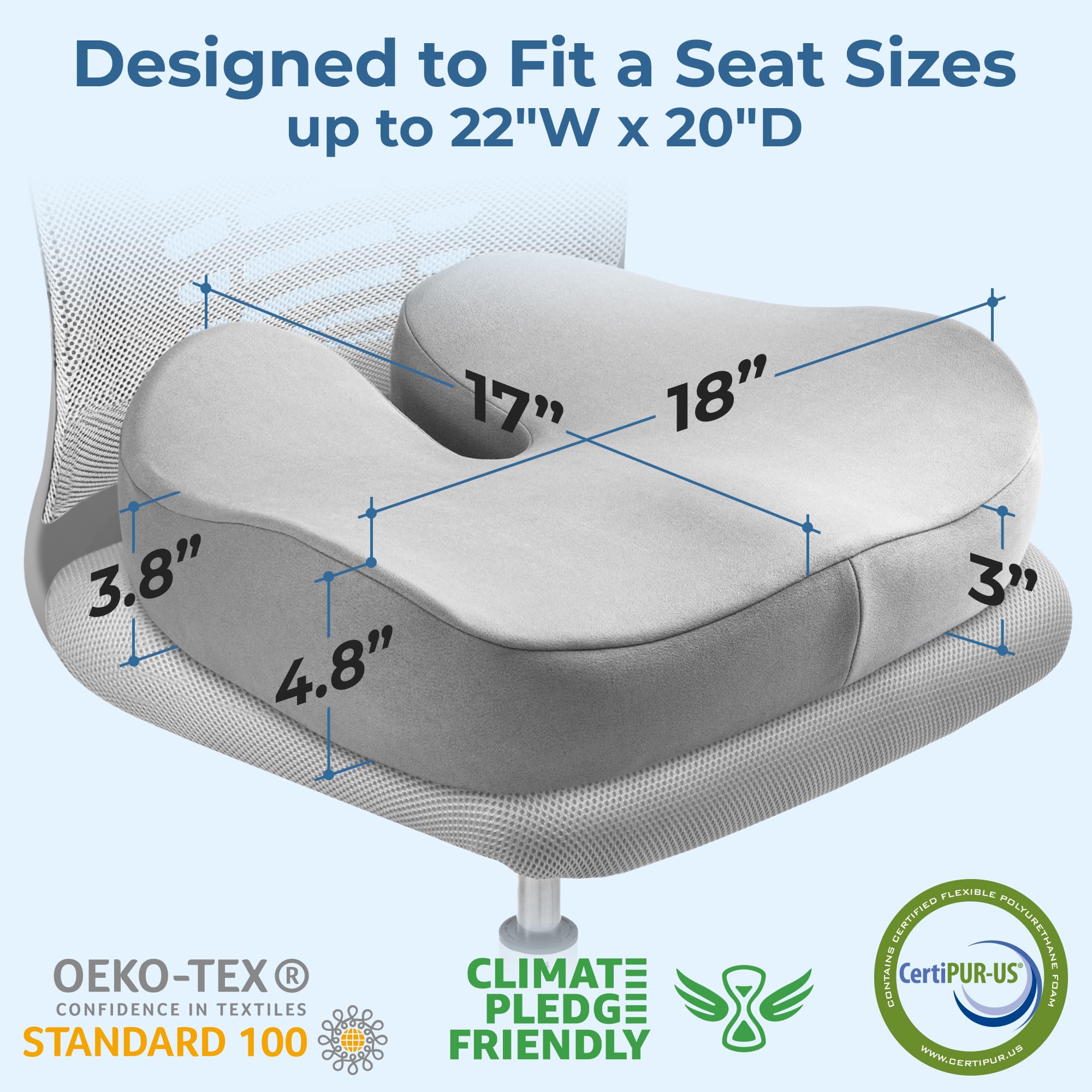 𝗚𝗲𝗻𝗲𝗿𝗼𝘂𝘀 𝗦𝗶𝘇𝗲 & 𝗣𝗹𝘂𝘀𝗵 𝗖𝗼𝗺𝗳𝗼𝗿𝘁: Experience a 25% larger chair cushion, measuring 18"W x 17"D. It fits perfectly on office chairs, car seats, wheelchairs, gaming, computer, and wooden dining chairs