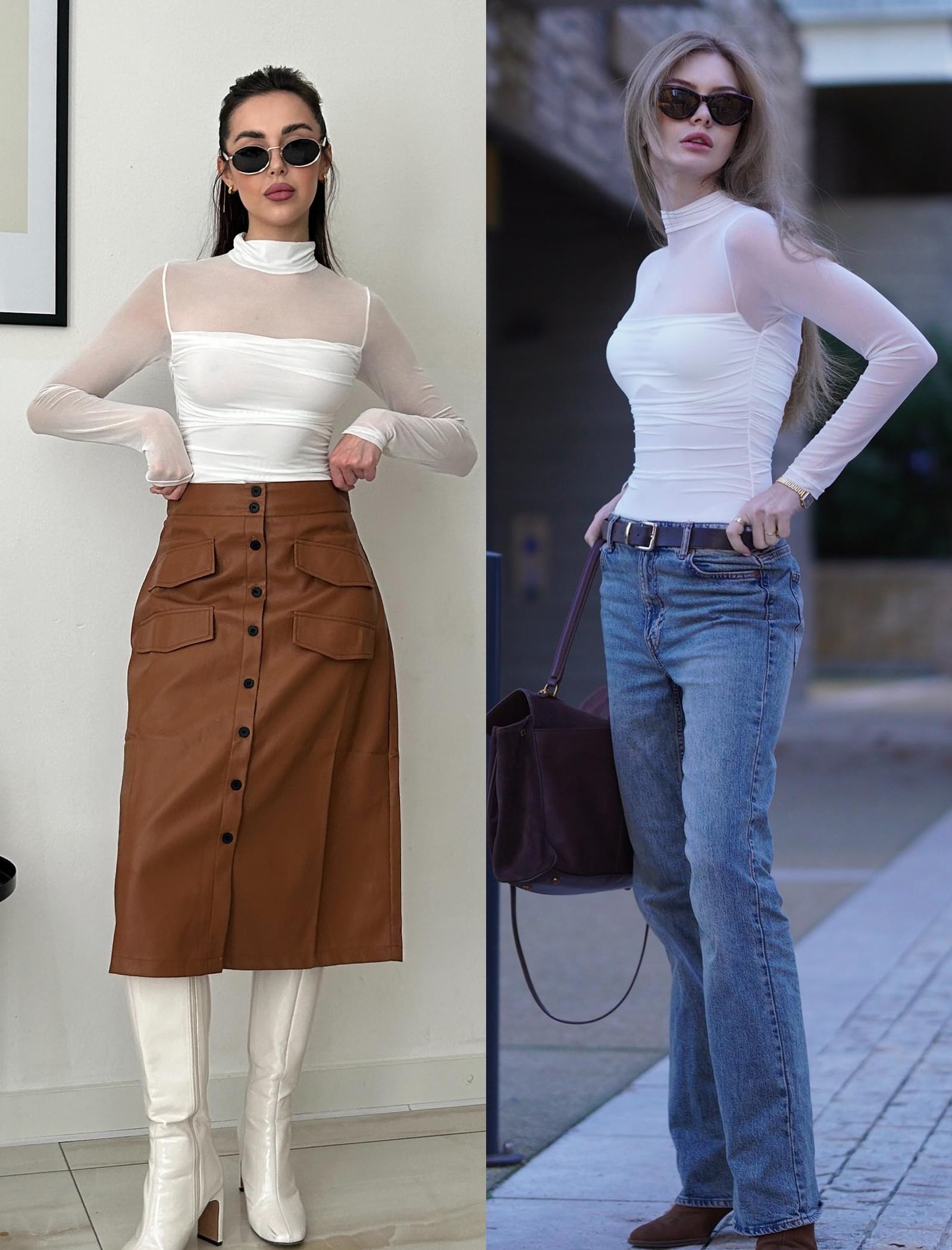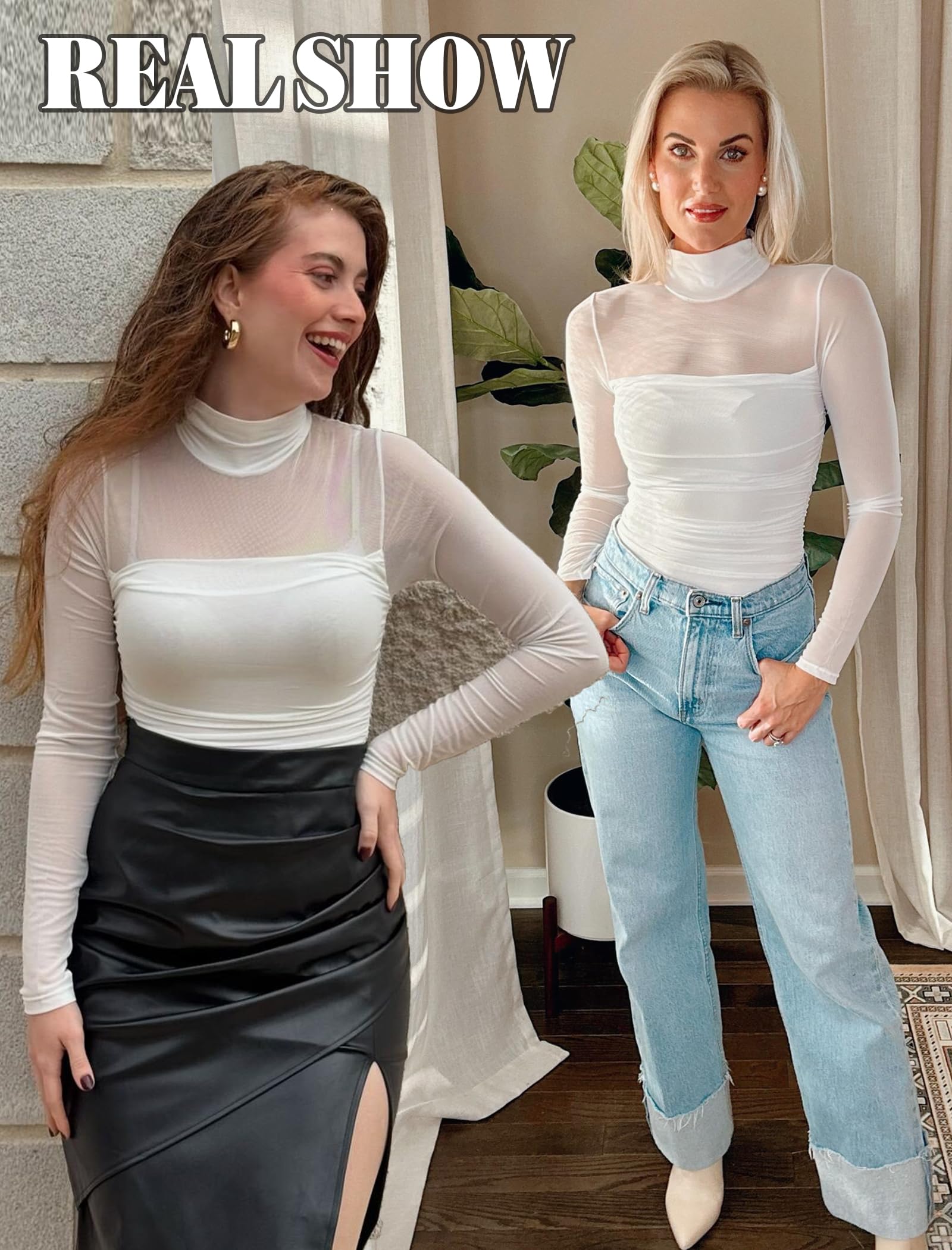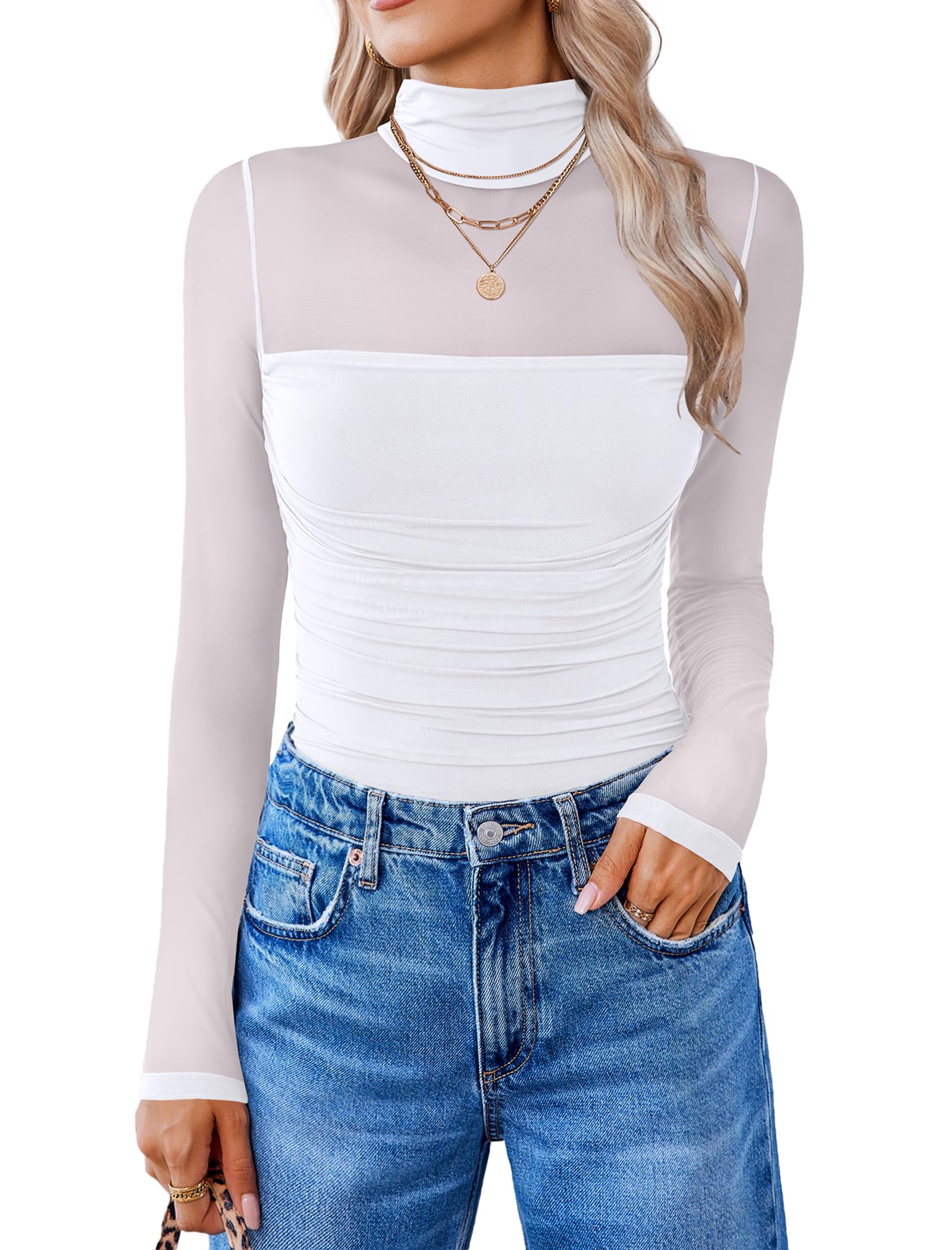 【Design】Sheer bodysuit for women feature Turtle neck and mesh sleeves ,design with double-layer fabric, layered ruched decoration,from chest to waist with super soft material,make it more slim fitting, bring a sense of detail design to basic styles, but also make them more elegant and versatile,great staple for your wardrobe.