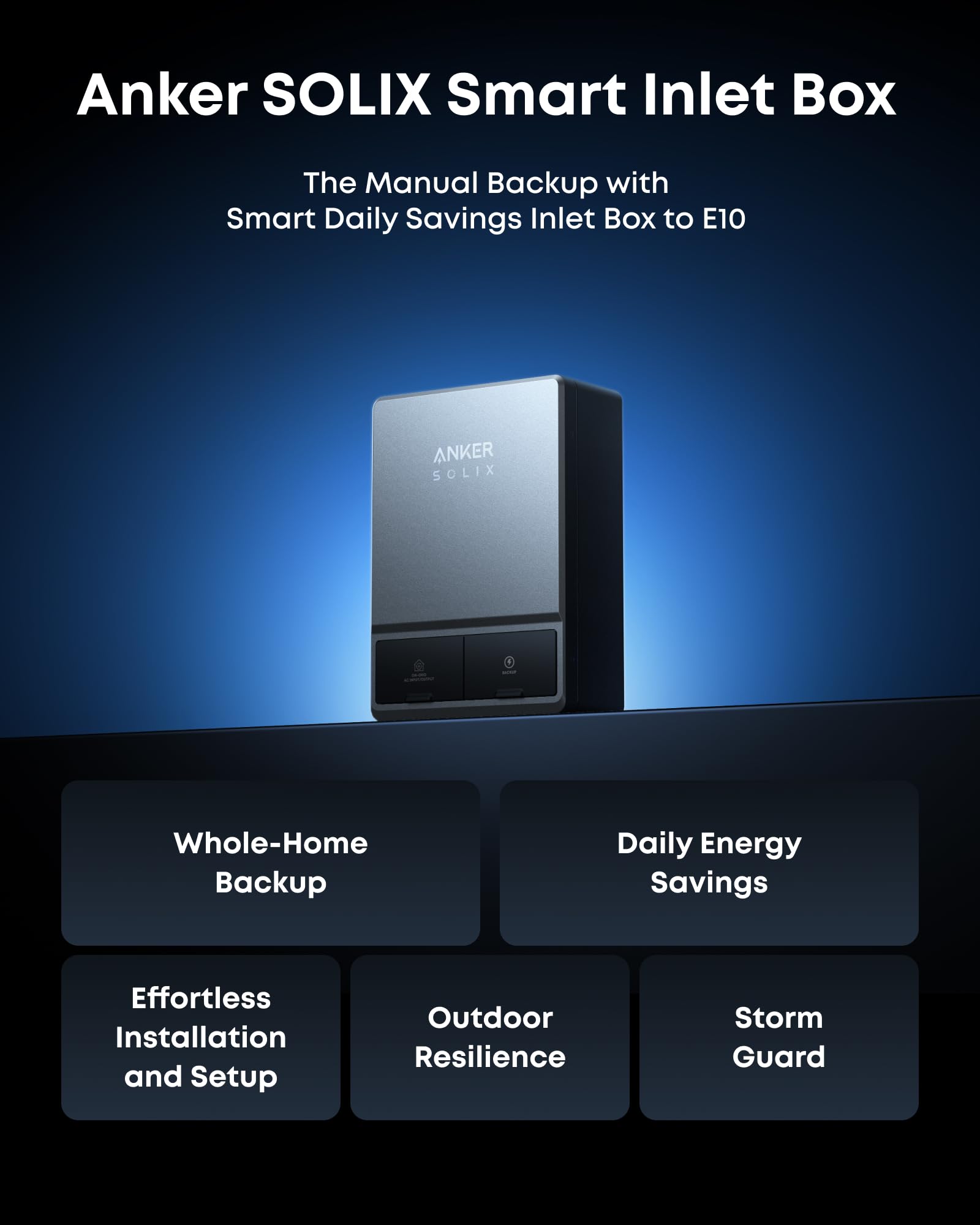 Manual Backup with Smart Daily Savings: Smart Inlet Box connects E10 to your panel for manual whole-home backup. Flip the switch during outages to power entire home instantly—no circuit limits, complete protection.