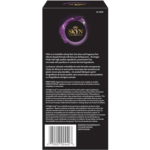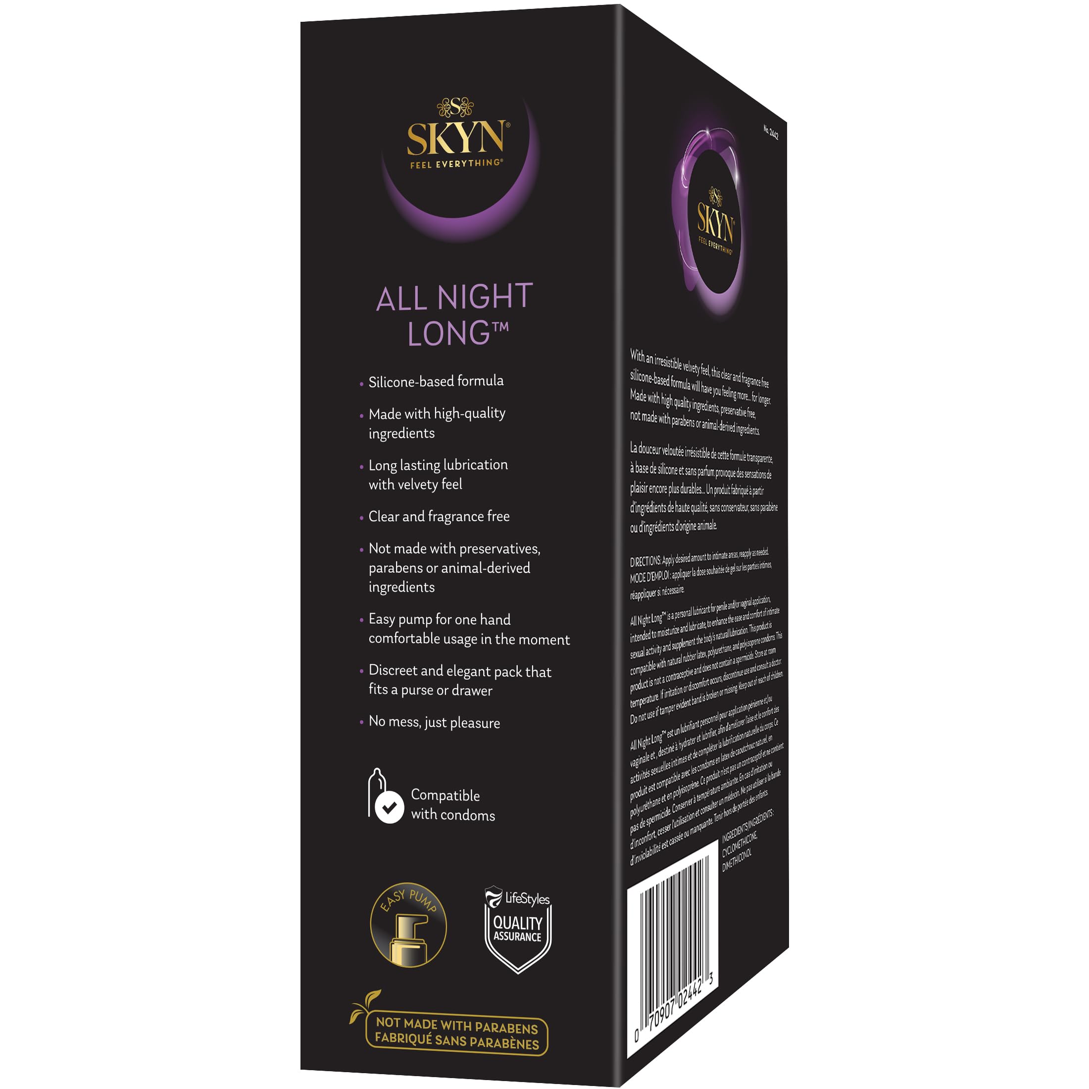 SKYN All Night Long is a personal lubricant, for penile and/or vaginal application, indented to moisturize and lubricate, to enhance the ease and comfort of intimate sexual activity and supplement the body's natural lubrication. Compatible with Latex, polyisoprene and polyurethane condoms. This product is not a contraceptive and does not contain spermicide. All personal lubricants compatible with polyisoprene, natural latex and polyurethane condoms.