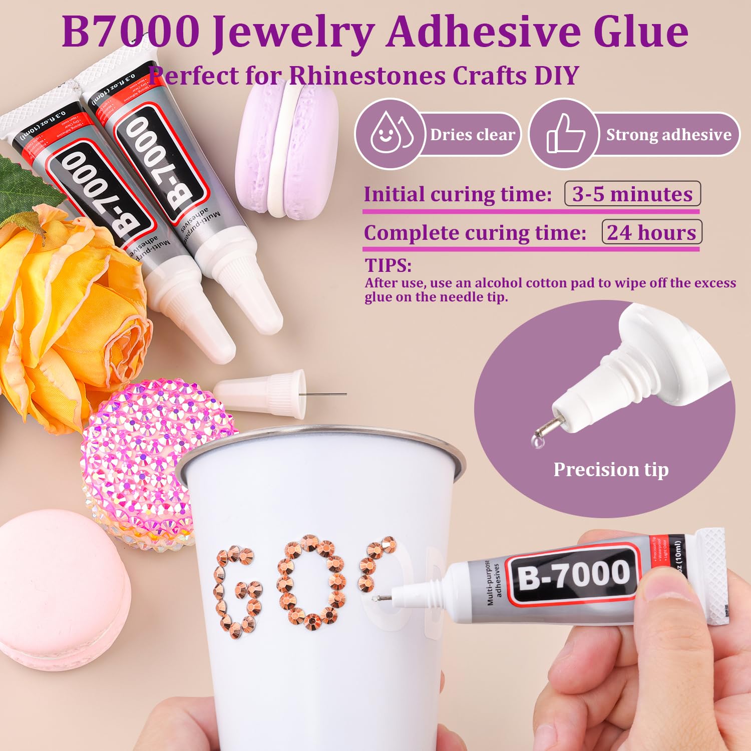 🌈B7000 CLEAR GLUE FOR GEMS -- Our B7000 glue has strong adhesion and dries clear, non-toxic and harmless to the skin.The glue has a precision needle for easy application, initial cure time is 3-5 minutes and full cure time is 24 hours. The glue will have a slight overflow when first used, before use you can leave the glue head up for a few minutes to avoid overflow. After use, the needle needs to be wiped with an alcohol pad.