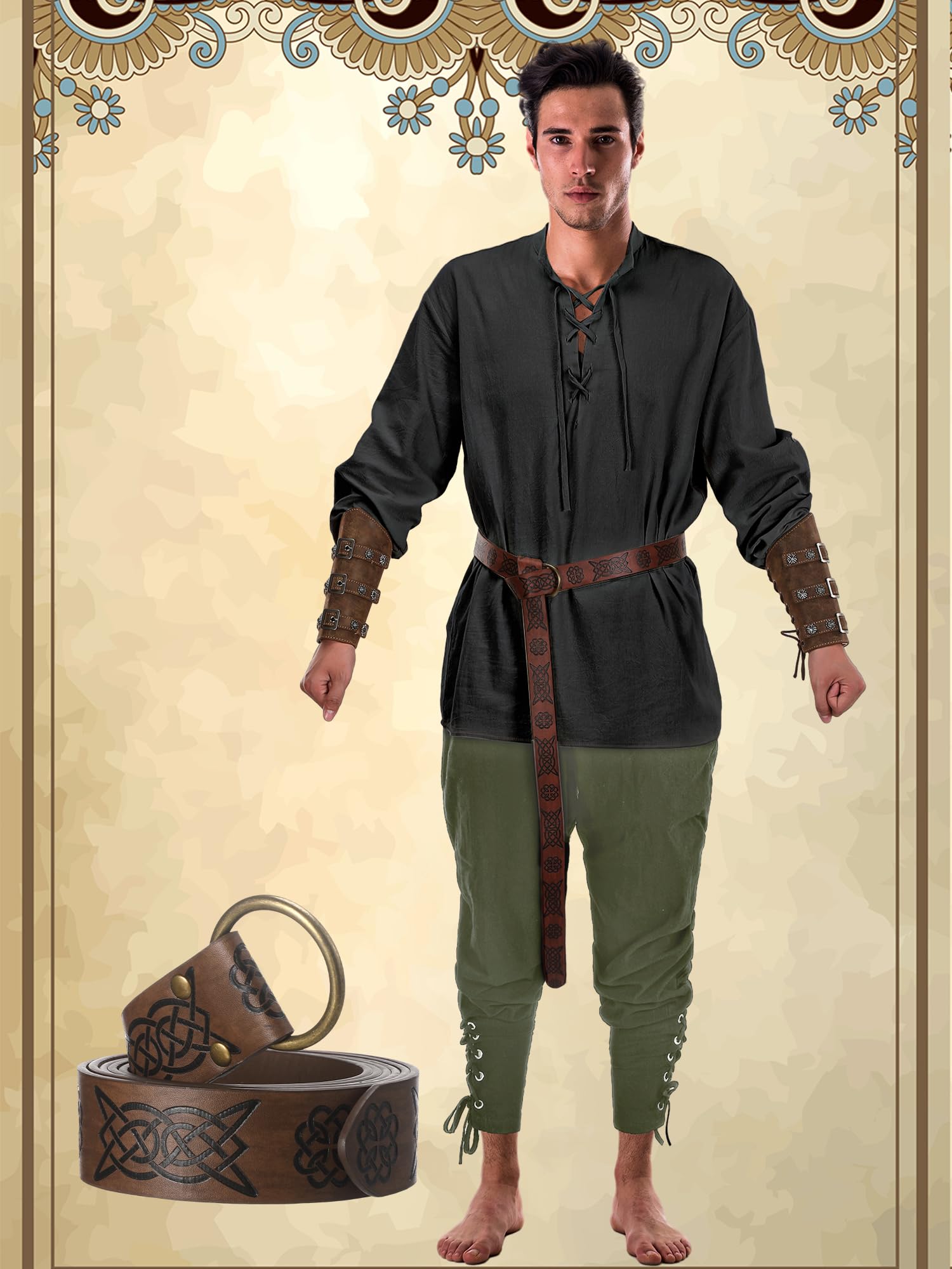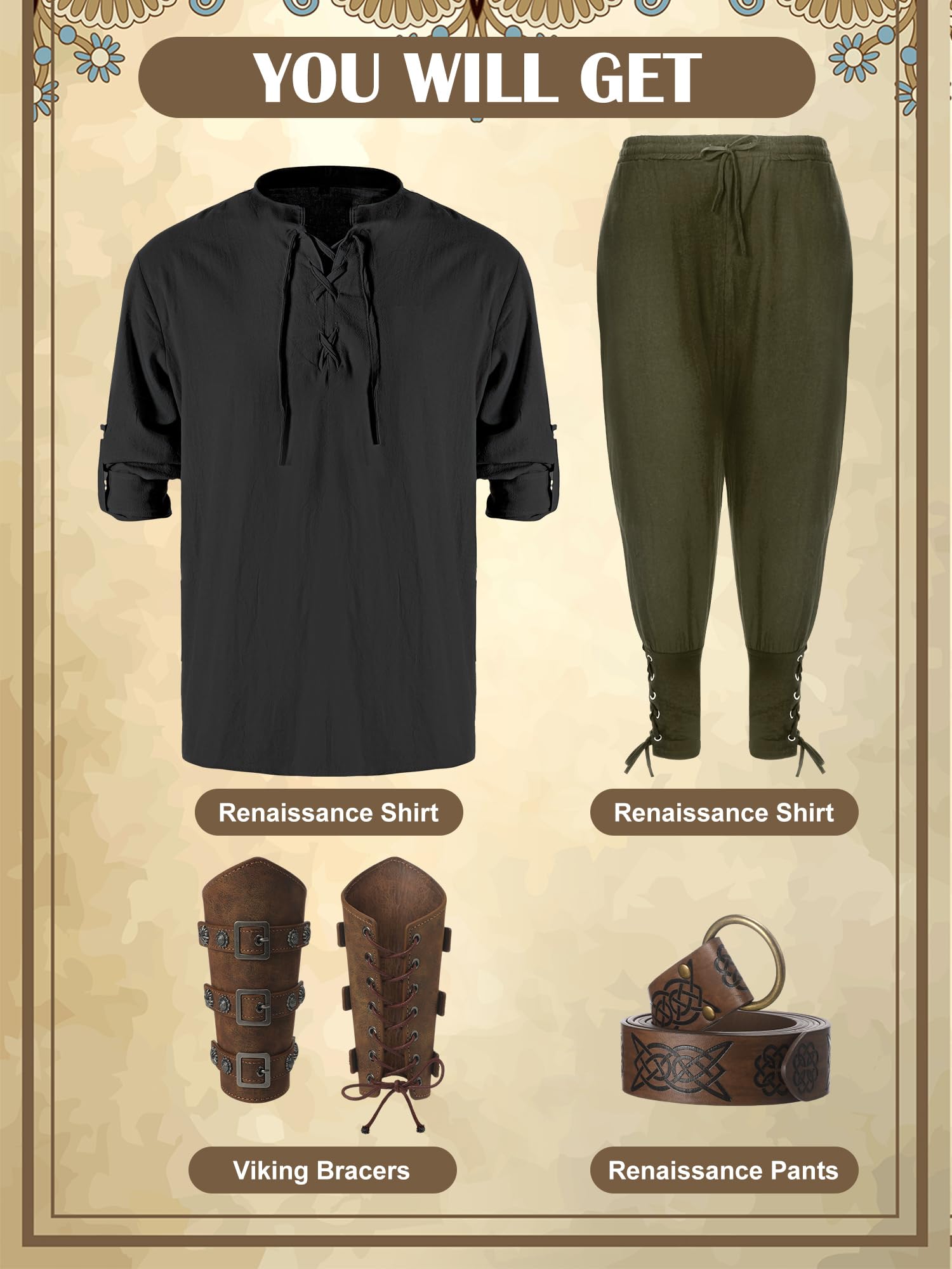 Nice Combination: the set includes 1 cotton retro style lace long sleeve shirt for medieval, 1 pair of renaissance gothic trousers, 1 medieval knight's belt and 1 pair of leather buckle wrist guards, nice for Halloween cosplay party