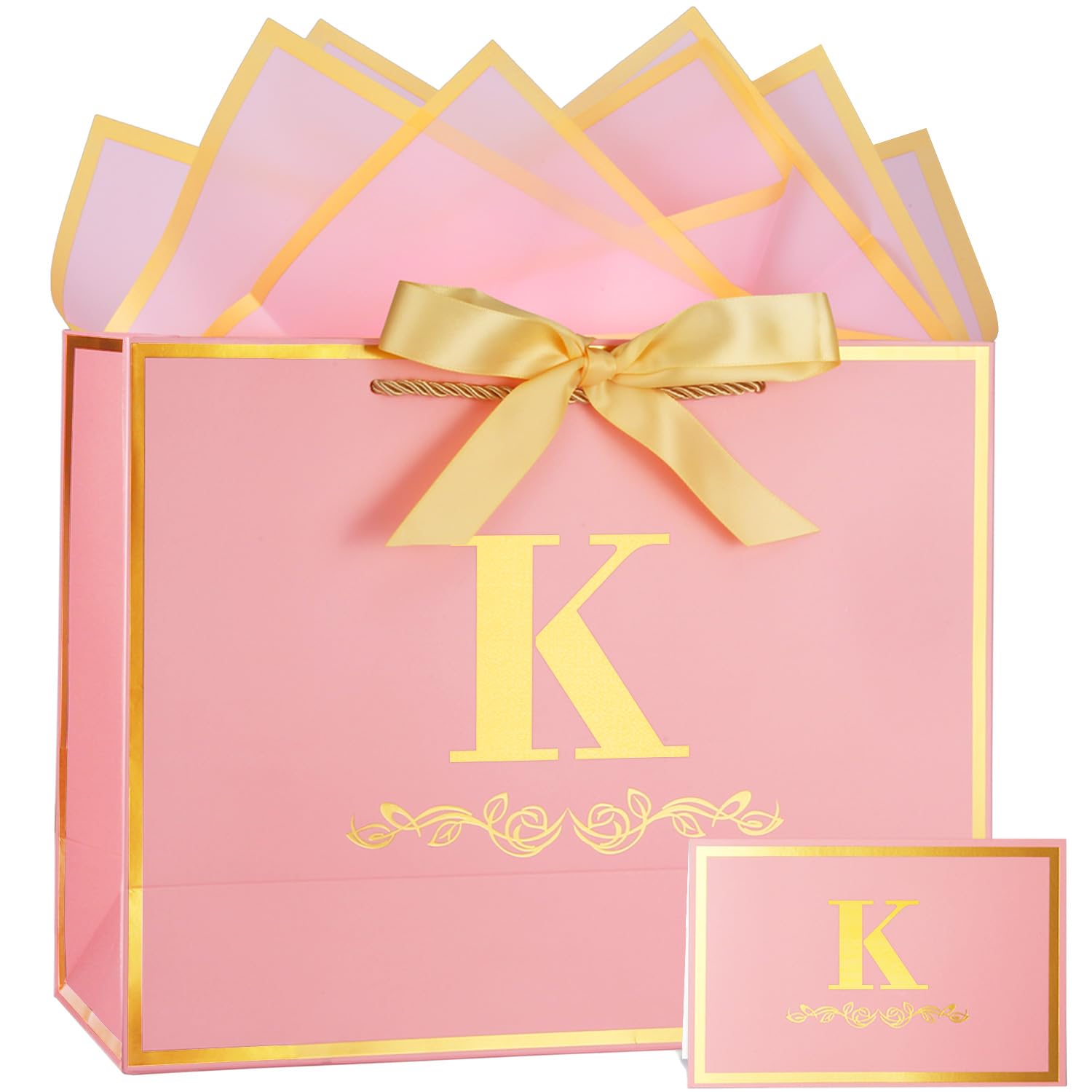 Initial Birthday Gift Bag with Card and Tissue Paper for Women/ Her, 13" Large Pink Gold Personalized Alphabet Bag for Women, Bridal Party Gift Paper Bow Gift Bag for Gifts Wrapping