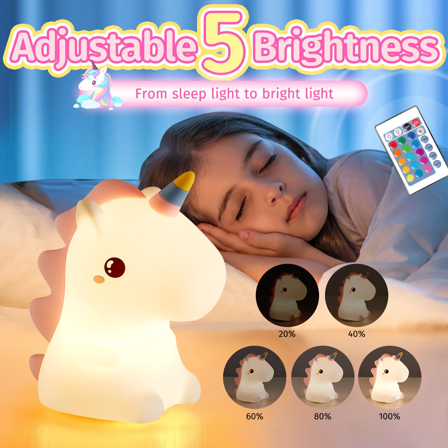 đă5 BRIGHTNESS NIGHT LIGHT FOR KIDSăThe toddler night light for kids night light has 5 LIGHTNESS:20% & 40% & 60% & 80% & 100% to meet different needs. U can use cute night light's sleep light when lying in bed,and use the bright light when reading on desk. Besides,the nightlight for kids room,toddler night lights for kids lamp allows mom to breastfeed&change diaper without waking up baby at night. The toddler night light for kids night light have 2 adjustment methods,remote for 5 gears&button for 2. We try our best to provide high-end toddler night light for kids night light,cute night lights for kids,nightlight for kids room,Pick our unicorn lamp,unicorn night light for girls night light!