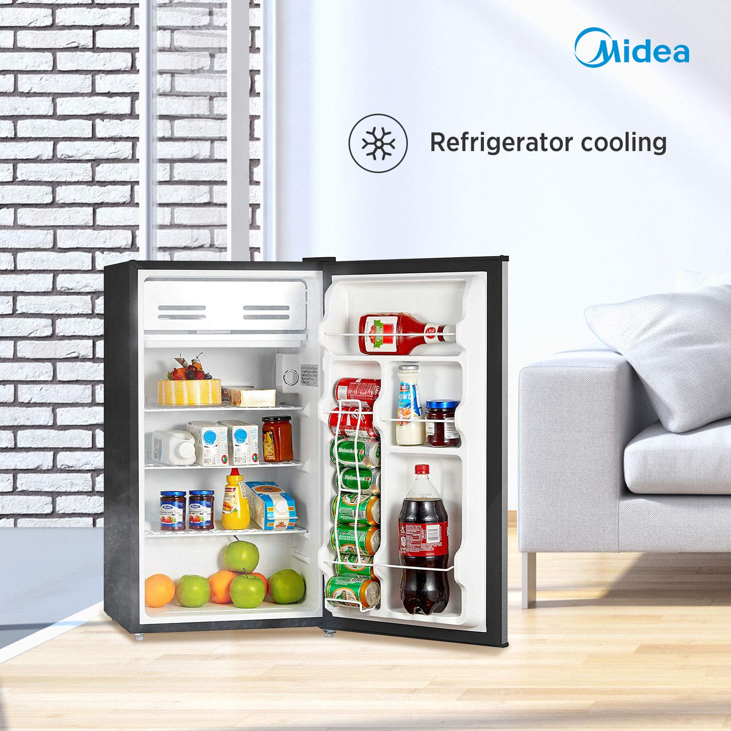 Product Description With 220 kWh annual energy consumption, this refrigerator helps you save money on your utility bills and helps keep the environment green This 3. 30 ft ³ refrigerator might look small but it can hold plenty of food and groceries Place your refrigerator in any corner of the room with its reversible door construction that could be adjusted to open from either side From the Manufacturer Midea is proud to offer a fine selection of the highest quality refrigerators and freezers in a variety of styles and functions. This model features… Net capacity: 3.3 cu.ft. Mechanical temperature. Low noise. Energy saving. CFC free. Adjustable leg. Separate chiller compartment.Reversible door. Dimension: (W*D*H), 17.72*18.58*33.86 inch. Loading capacity(40HQ): 338 pcs. Midea is a global company on a mission to provide outstanding quality and value above all else. At the core of their business is the basic, but ever-important concepts of quality and value; concepts that many companies have forgotten or neglected in recent decades. In their climb through the refrigeration and air conditioning markets, their pursuit of market leadership is driven by the desire to be a customer-focused, global company that delivers exceptional quality, innovation and value in all aspects of their operations -- from product development and production, to delivery and customer support. The company's core products are residential air conditioning, commercial air conditioning, washing machines, and refrigeration.