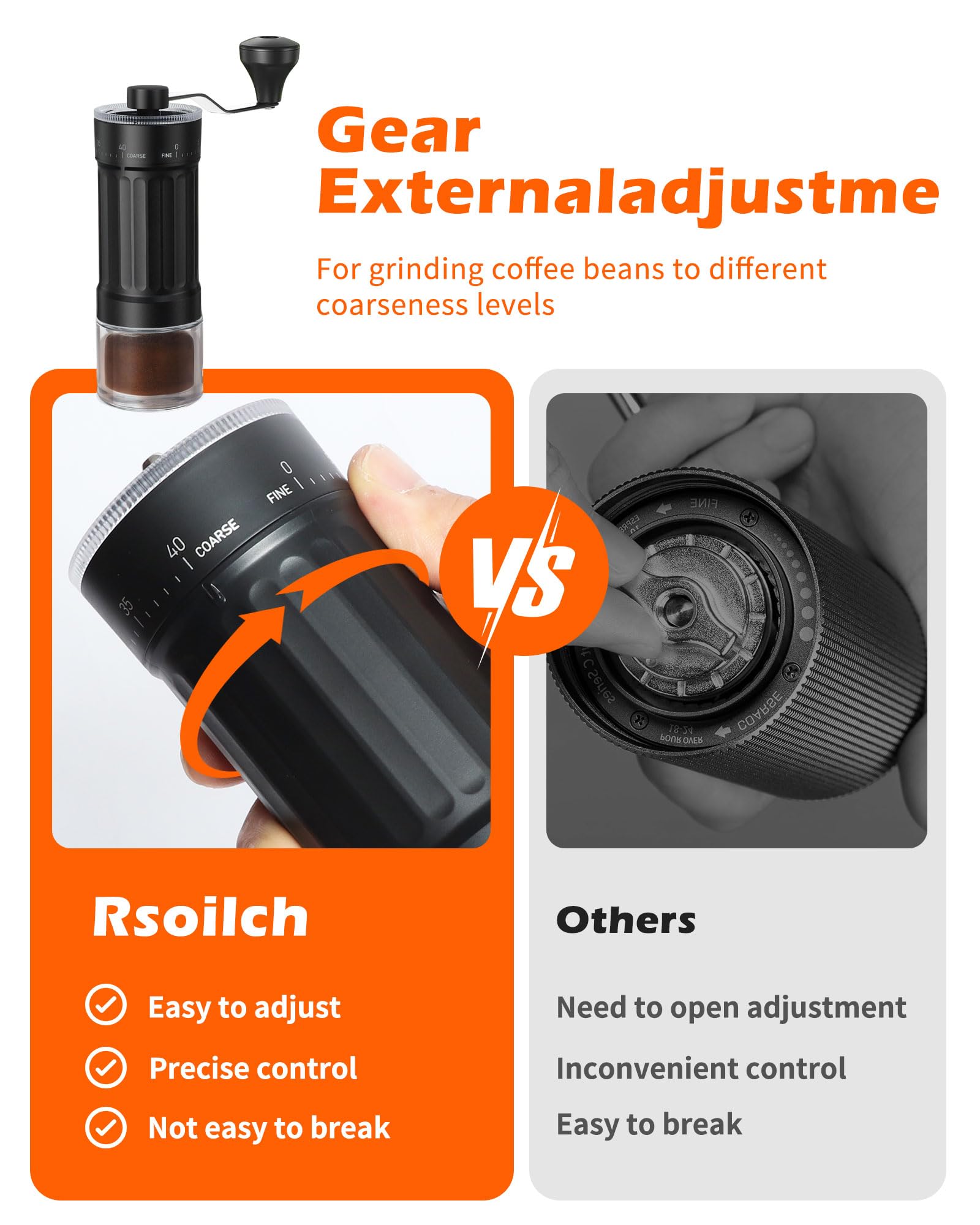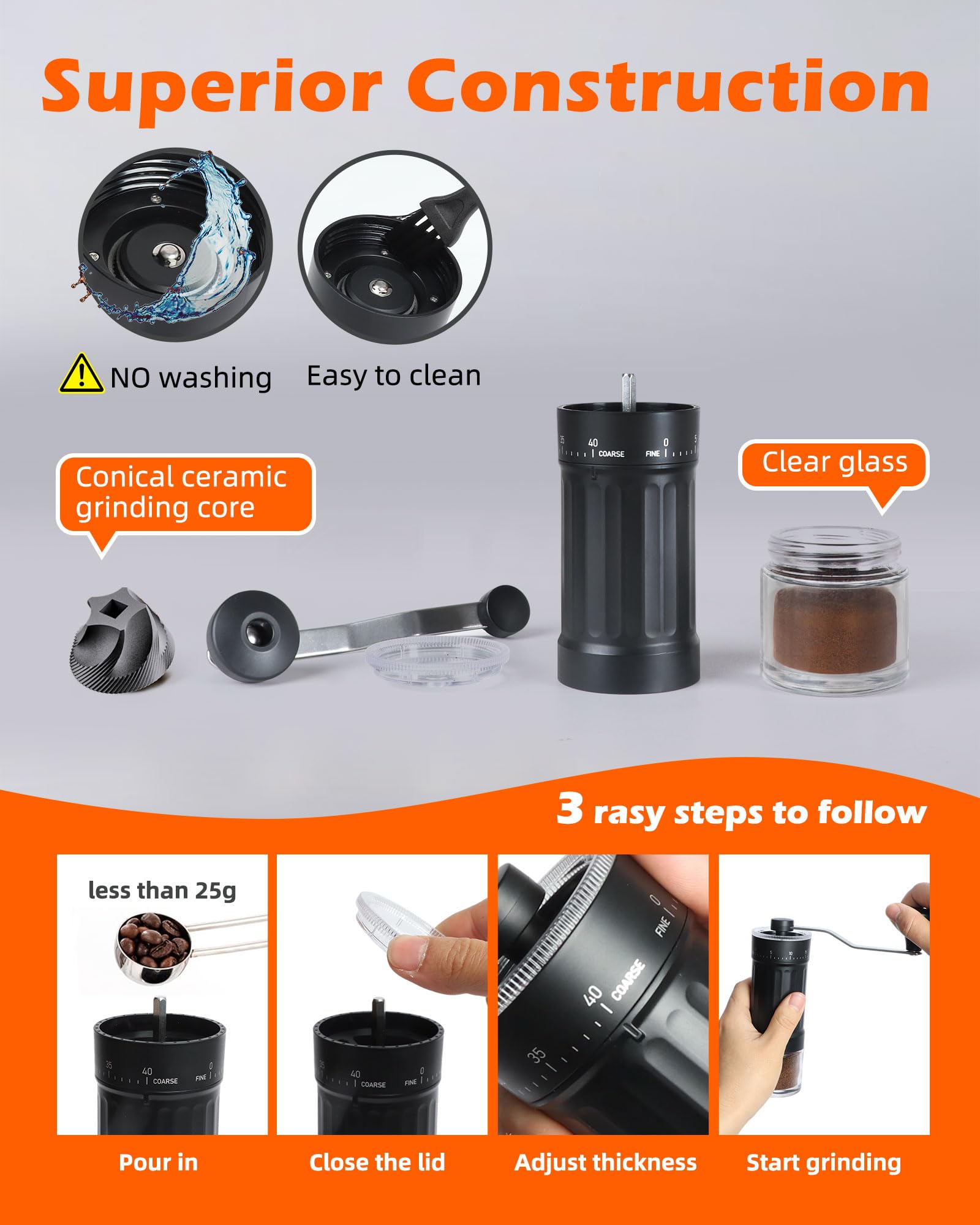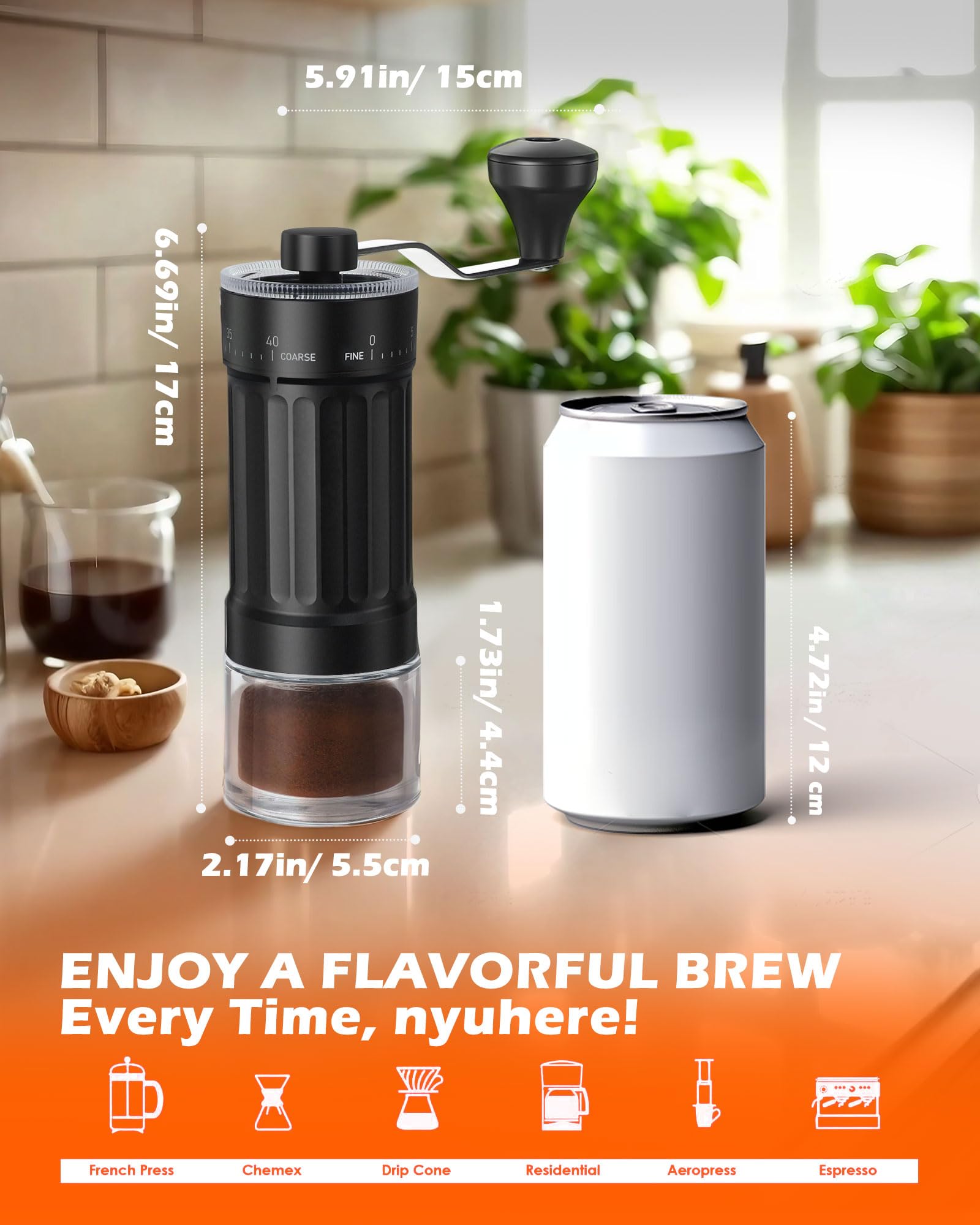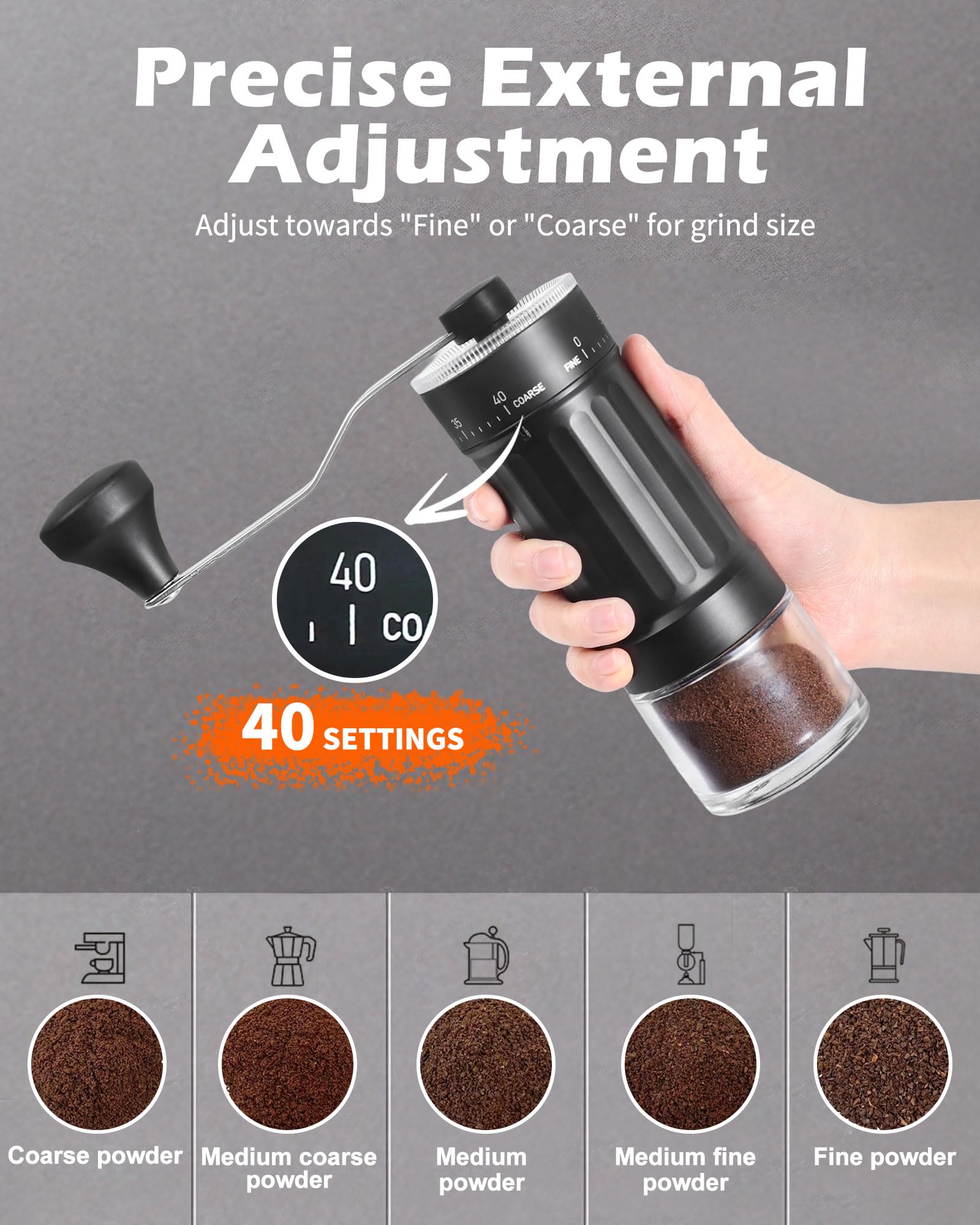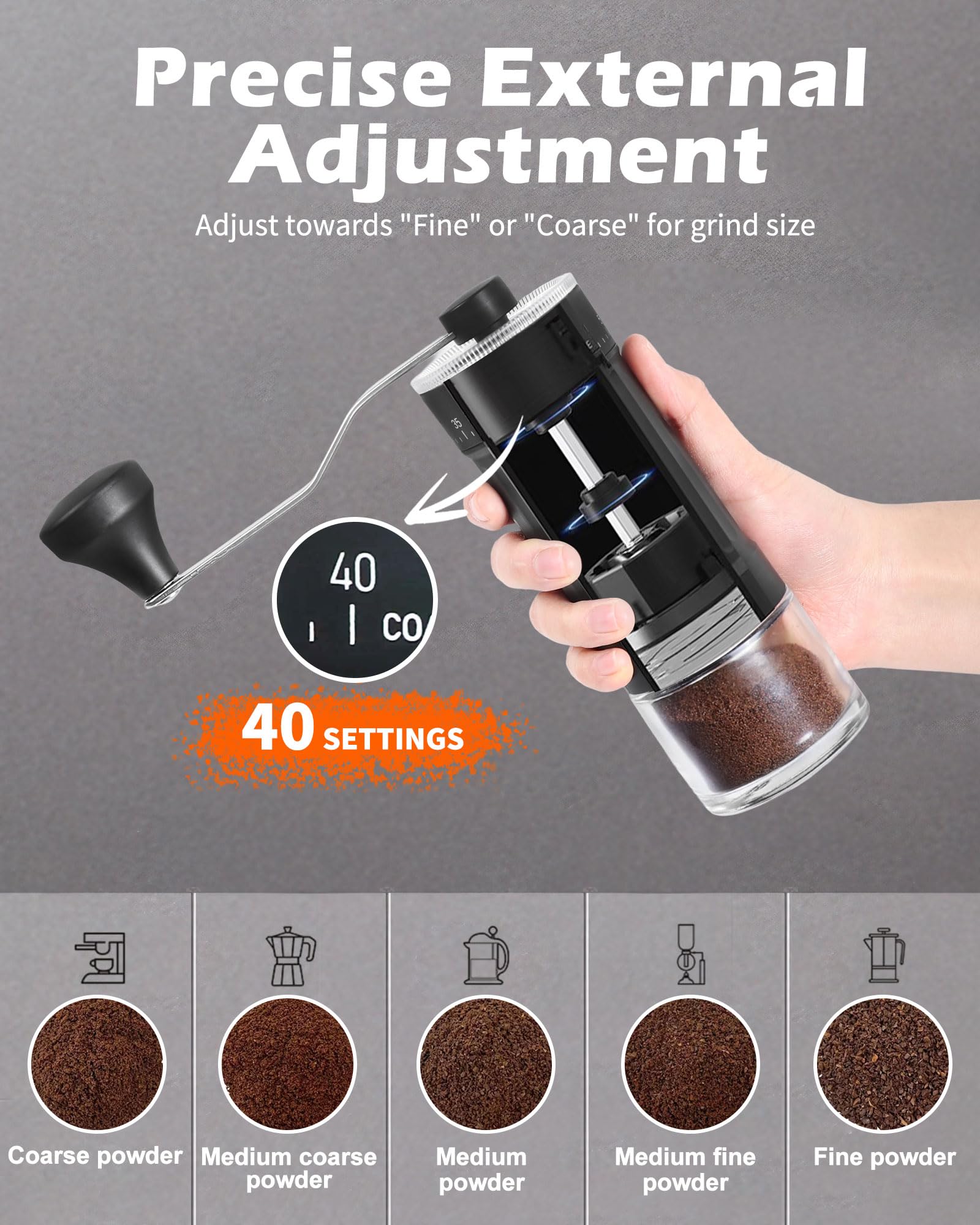Enjoy freshly ground coffee anytime with our versatile manual coffee grinder featuring 40 adjustable grind settings. The conical ceramic burr ensures a uniform grind for a perfect brew every time, whether you prefer espresso or French press.