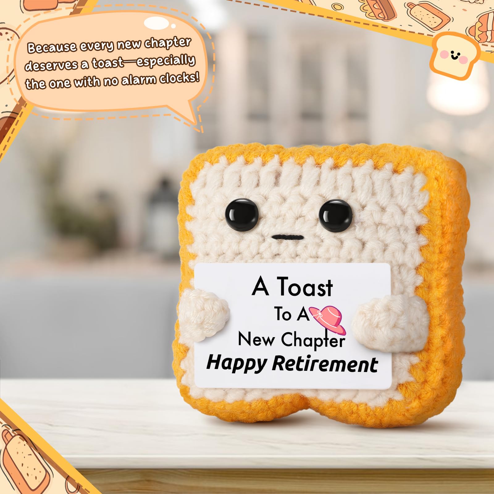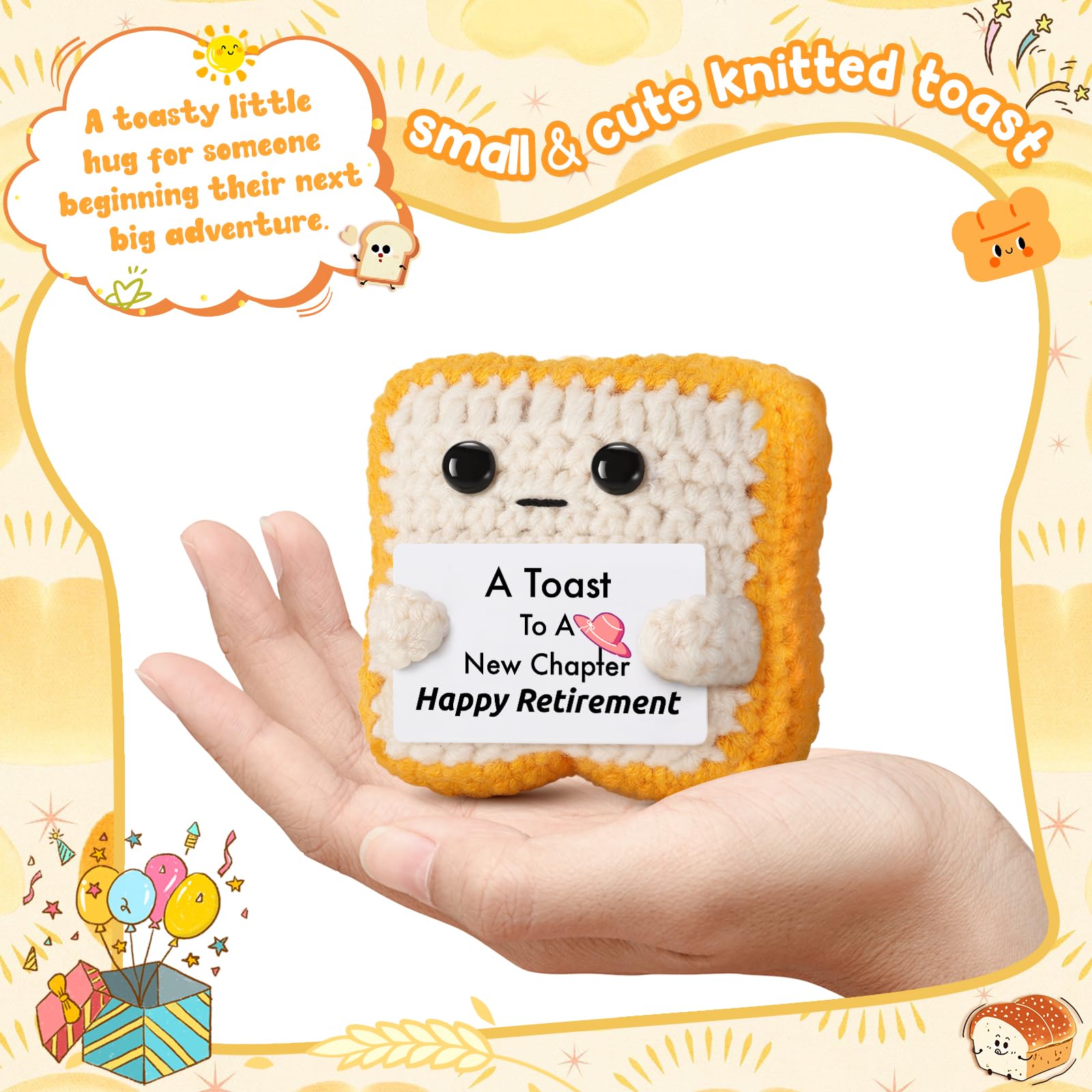 Send someone into retirement with humor, heart, and handmade charm! This crochet toast plush features a playful card that reads: “A Toast to a New Chapter – Happy Retirement.” Measuring just 2.8 × 2 × 2.8 inches, this mini toast is compact yet full of personality—easy to display or tuck into a gift bag. Crafted with care from soft yarn and cotton, it brings cozy warmth and durability. Perfect for your favorite coworker, retiring teacher, beloved parent, or cherished friend. It’s the ideal desk ornament, shelf decor piece, or heartfelt gift-basket addition—designed to spark smiles and uplift spirits. Because every career milestone deserves a toast and a giggle!
