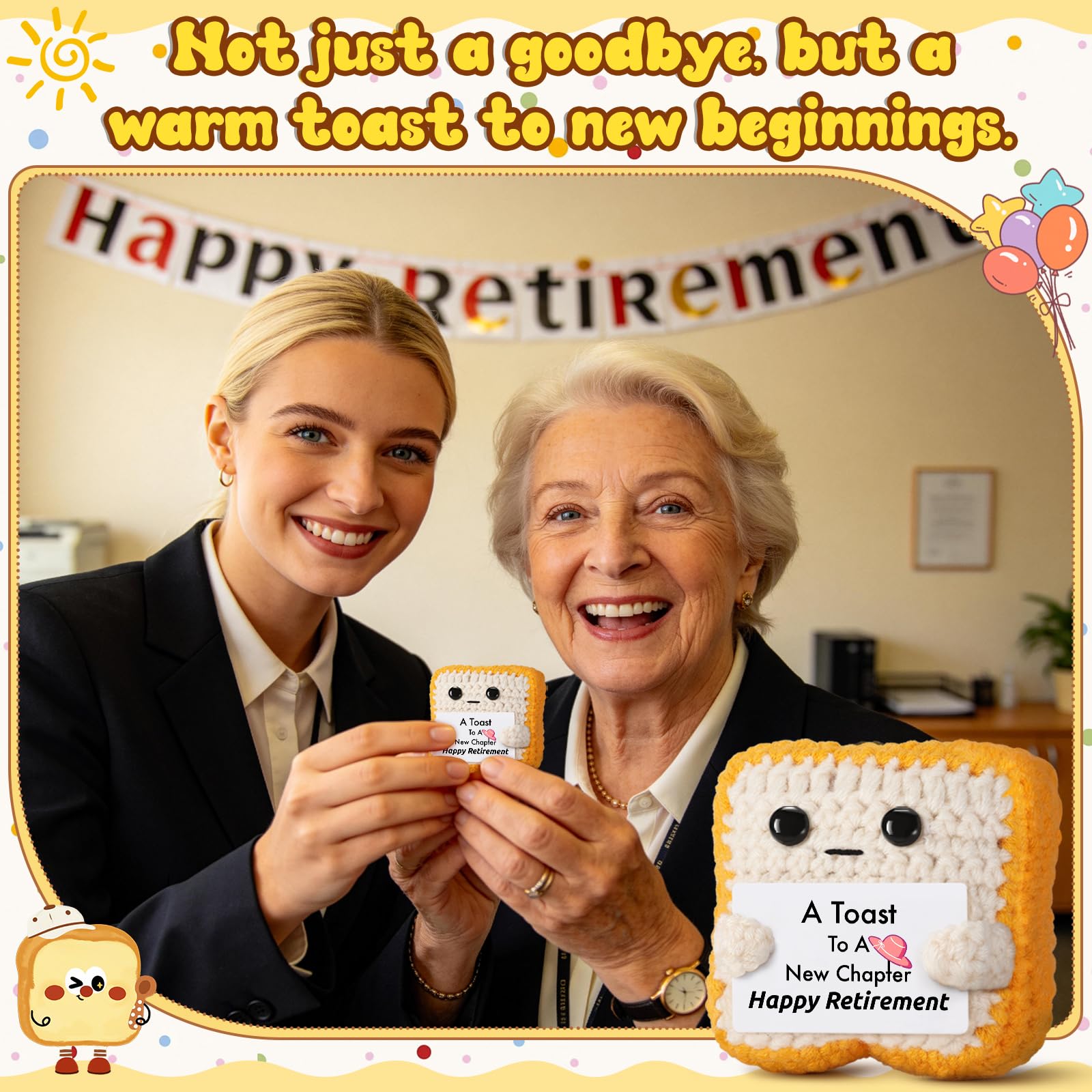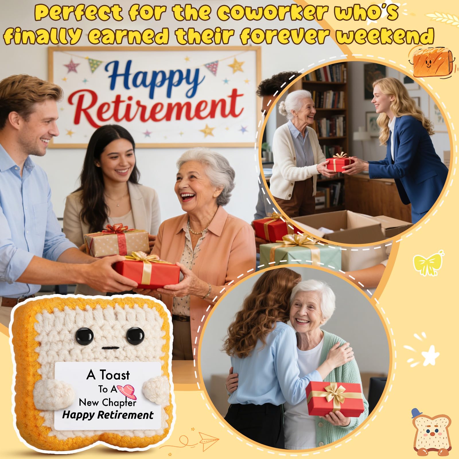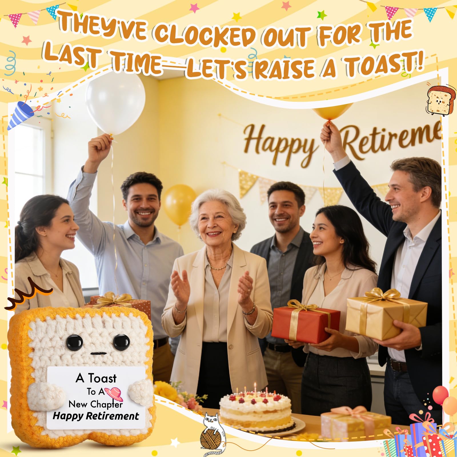 Celebrate a Milestone Moment: Whether it's your coworker, boss, teacher, mom, dad, auntie, uncle, cousin, grandad, grandma, or best friend — this handmade crochet toast plush cheers them on as they step into retirement