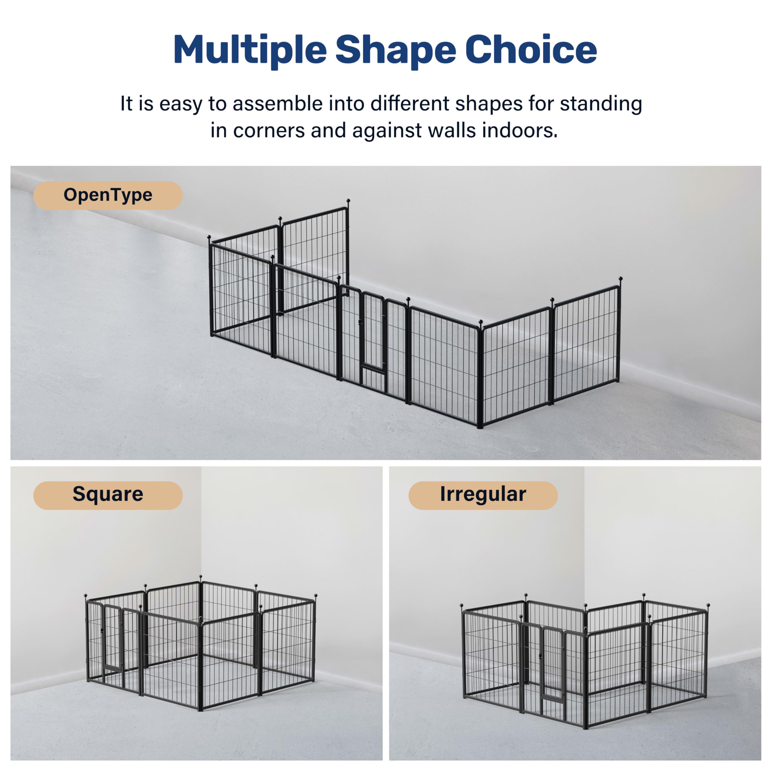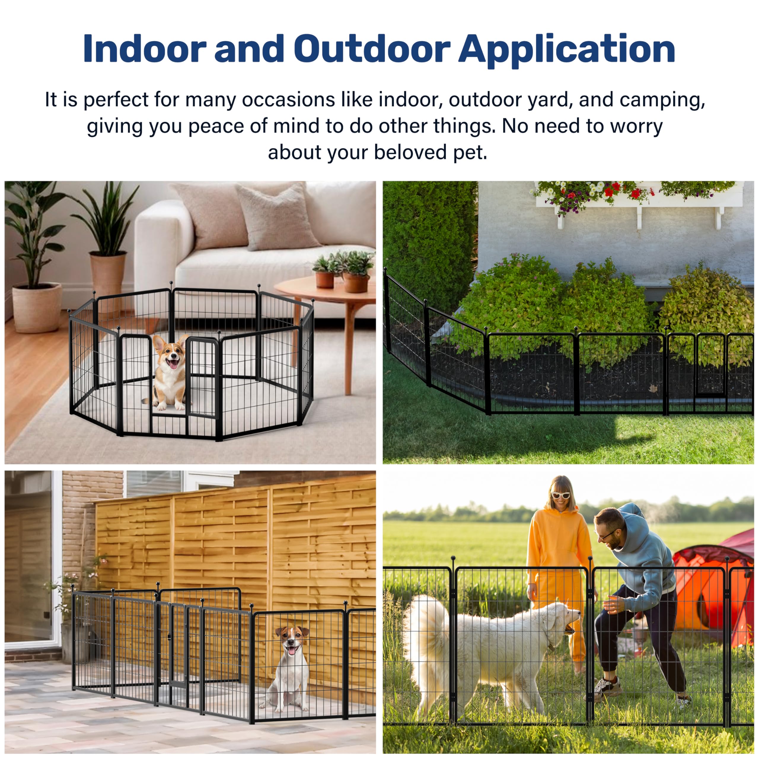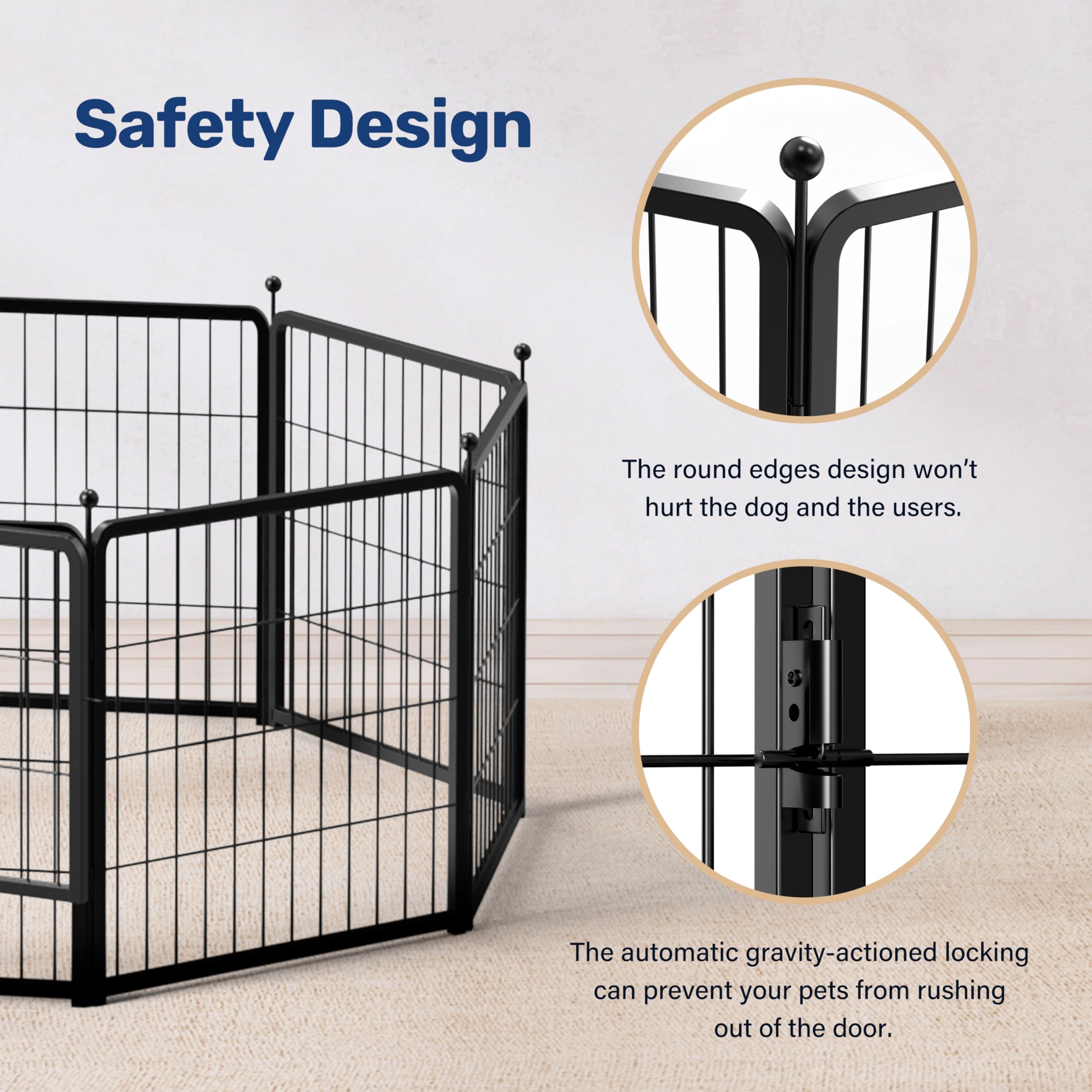 【Upgraded Dog Playpen】Dog playpen indoor adopts gravity door lock design, much safer and more convenient. Made of heavy duty metal panels and stakes with black coating, non-toxic, anti-rust. Ensures long time use no matter indoor or outdoor.