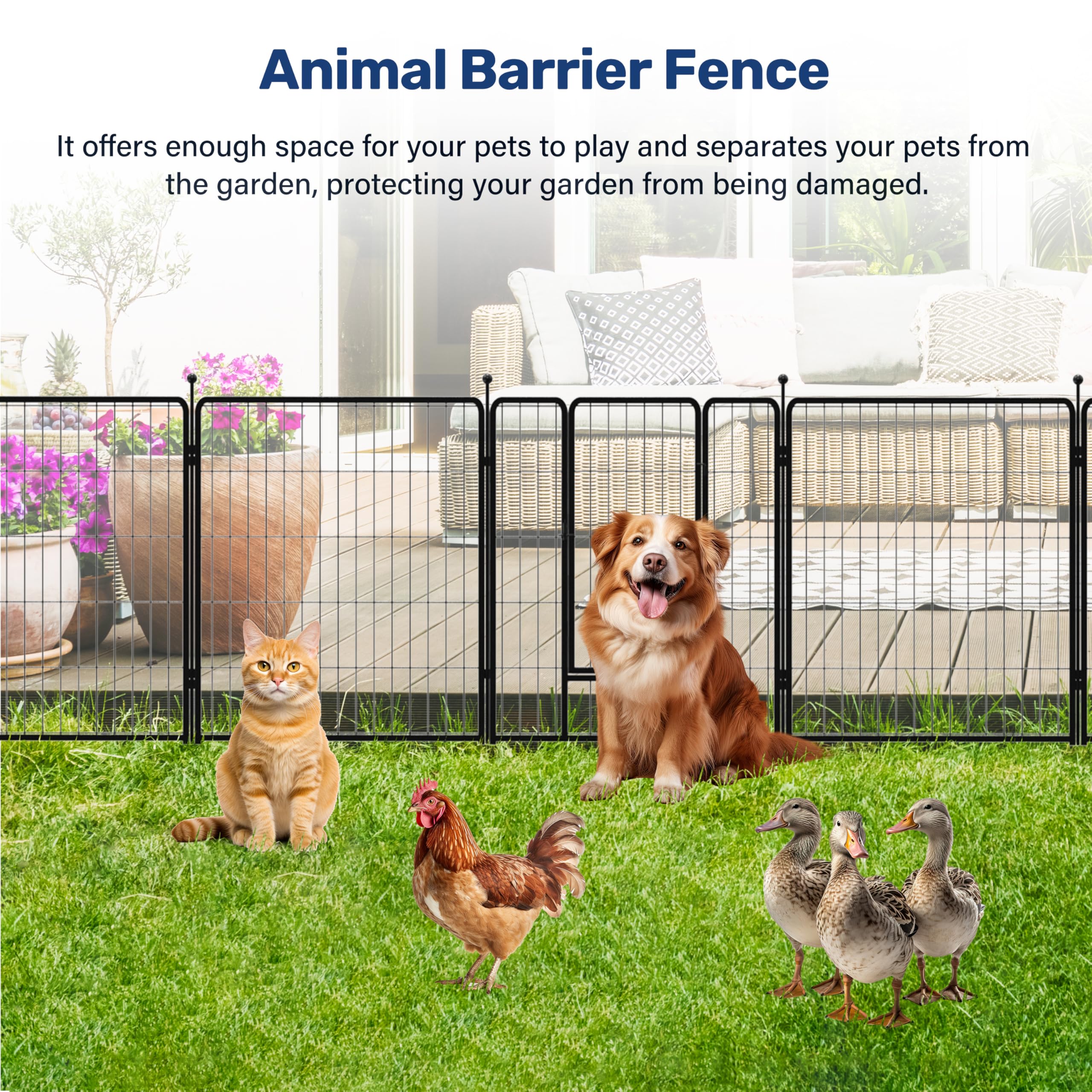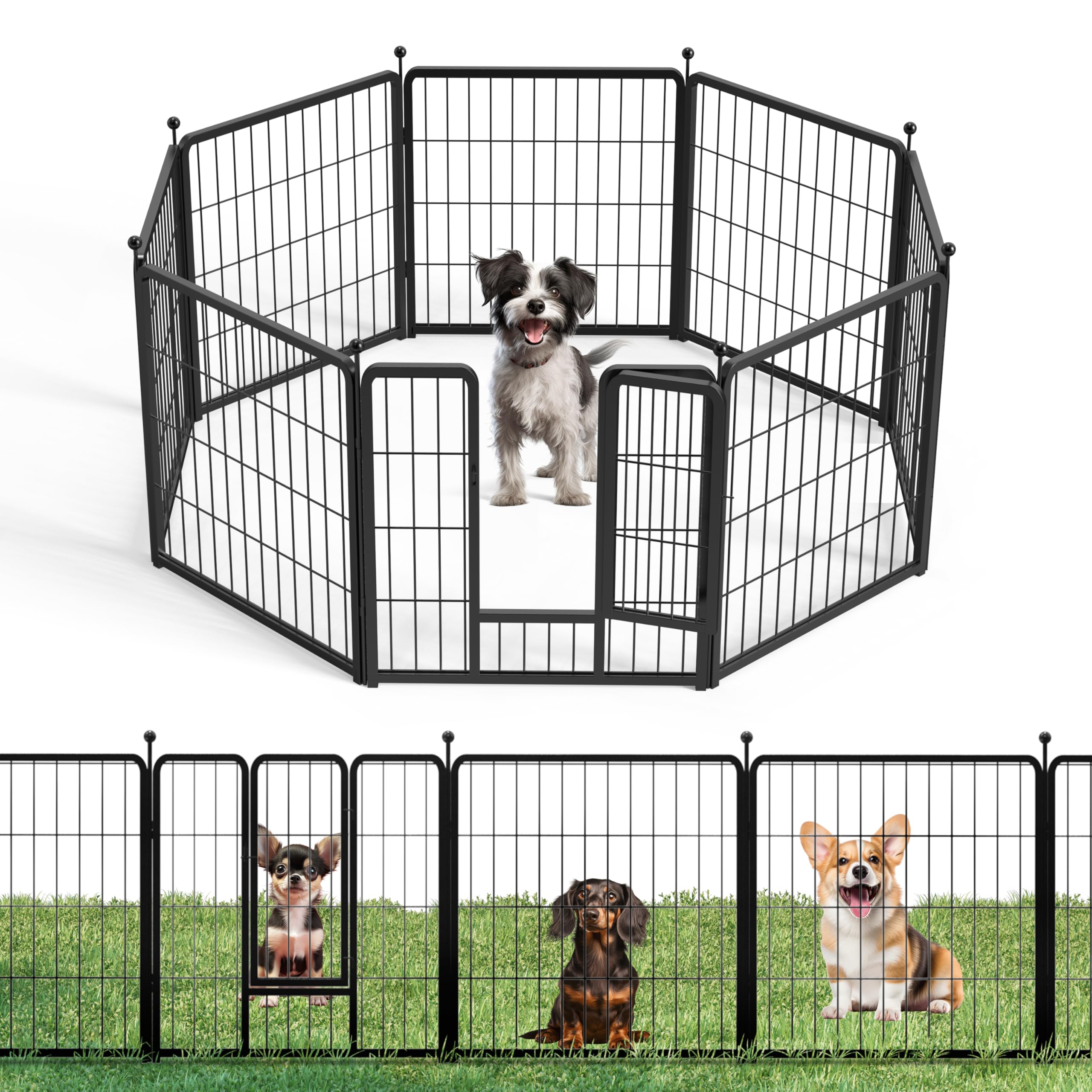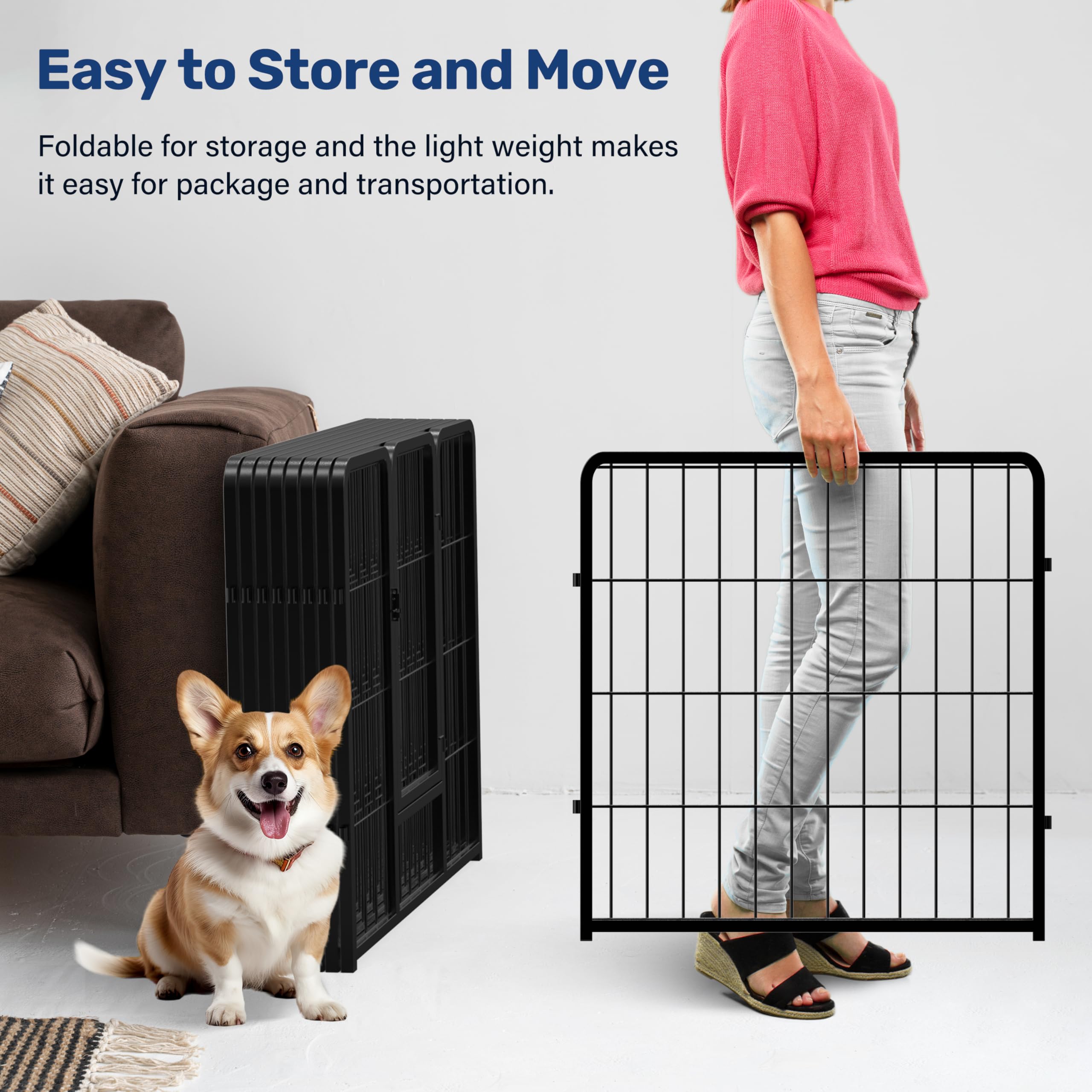 【Upgraded Dog Playpen】Dog playpen indoor adopts gravity door lock design, much safer and more convenient. Made of heavy duty metal panels and stakes with black coating, non-toxic, anti-rust. Ensures long time use no matter indoor or outdoor.