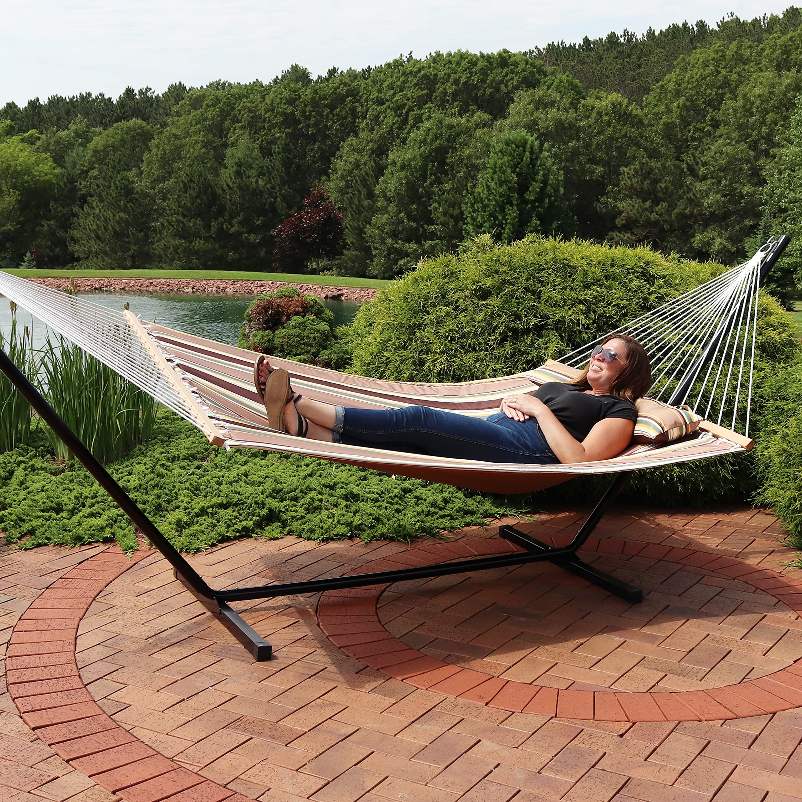 VERSATILE HANGING OPTIONS: The quilted hammock features attached chains for easy hanging. This two person hammock swing can be tied between trees, poles, or used with a 12' to 15' hammock stand (not included). It's wonderful for a variety of indoor or outdoor locations including the backyard, campsite, patio, sunroom, or bedroom.