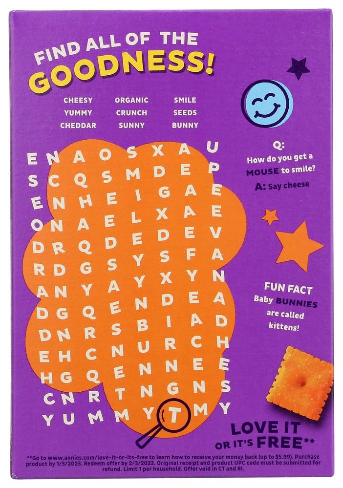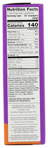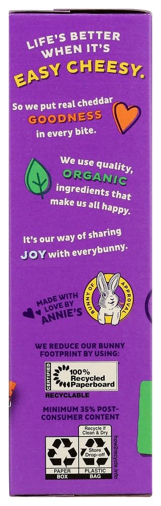 Dive into a box of Annie's Organic Cheddar Squares for a snackity snack that will cure your cheesy cravings. These organic snacks are perfect for anytime of the day. Grab a box for kids' snacks, after school snacks, or work snacks, and enjoy the yummy flavors of real cheddar cheese with a delectable crunch. We make our cheddar crackers with the good stuff and no artificial flavors or synthetic colors. Life's better when it's easy cheesy, so enjoy a handful of Annie's Organic Cheddar Squares for an organic snack that will have you coming back for more. Annie's makes products in over 20 family-friendly categories, from fruit-flavored snacks and cereal to mac and cheese. For busy bunnies and families on the go, we help make life a little easier and more delicious by spreading goodness through tasty foods and kindness to the planet.