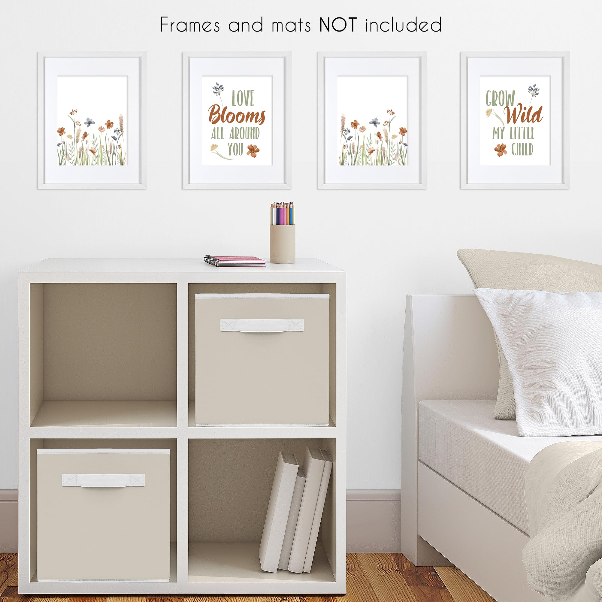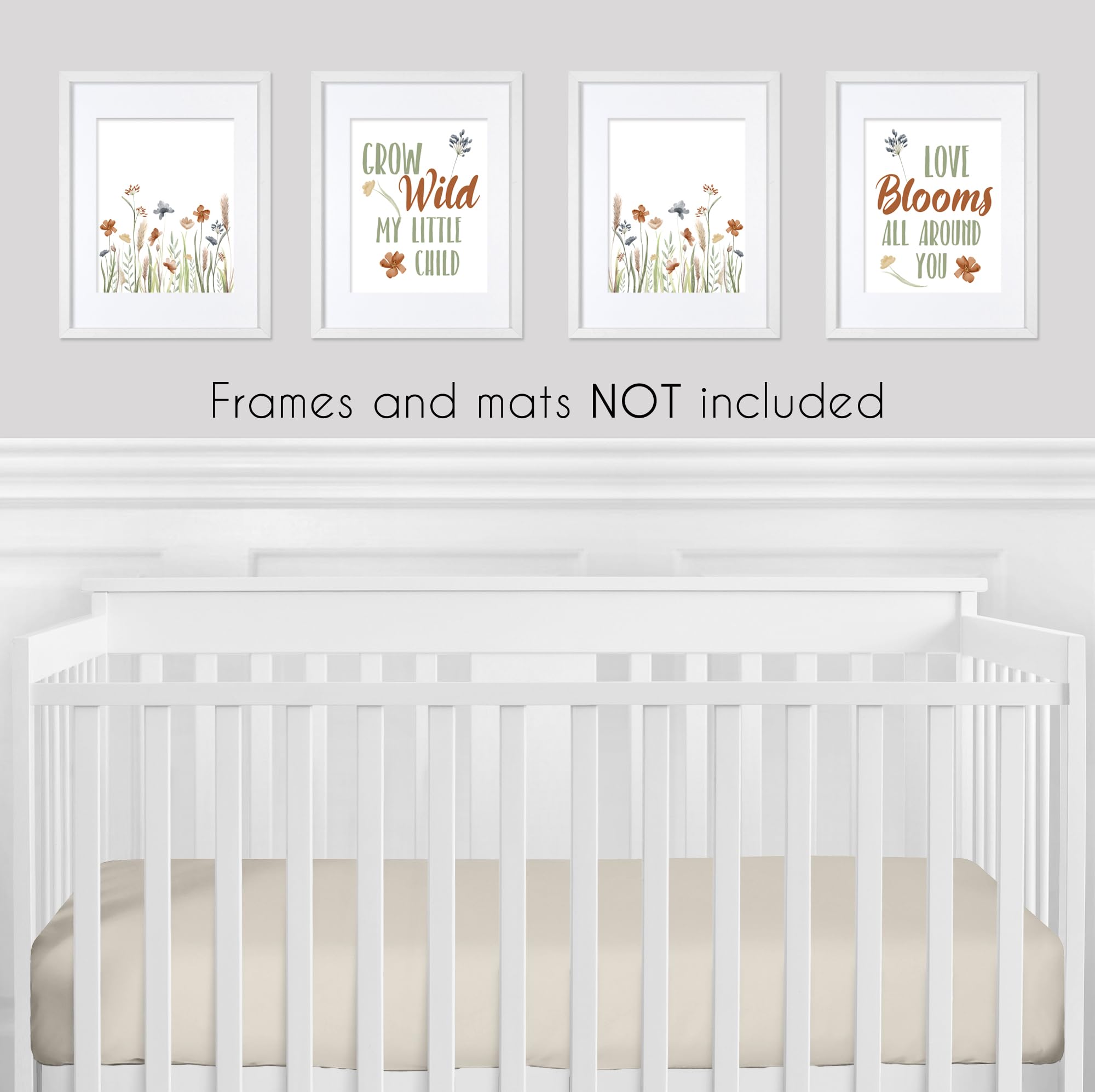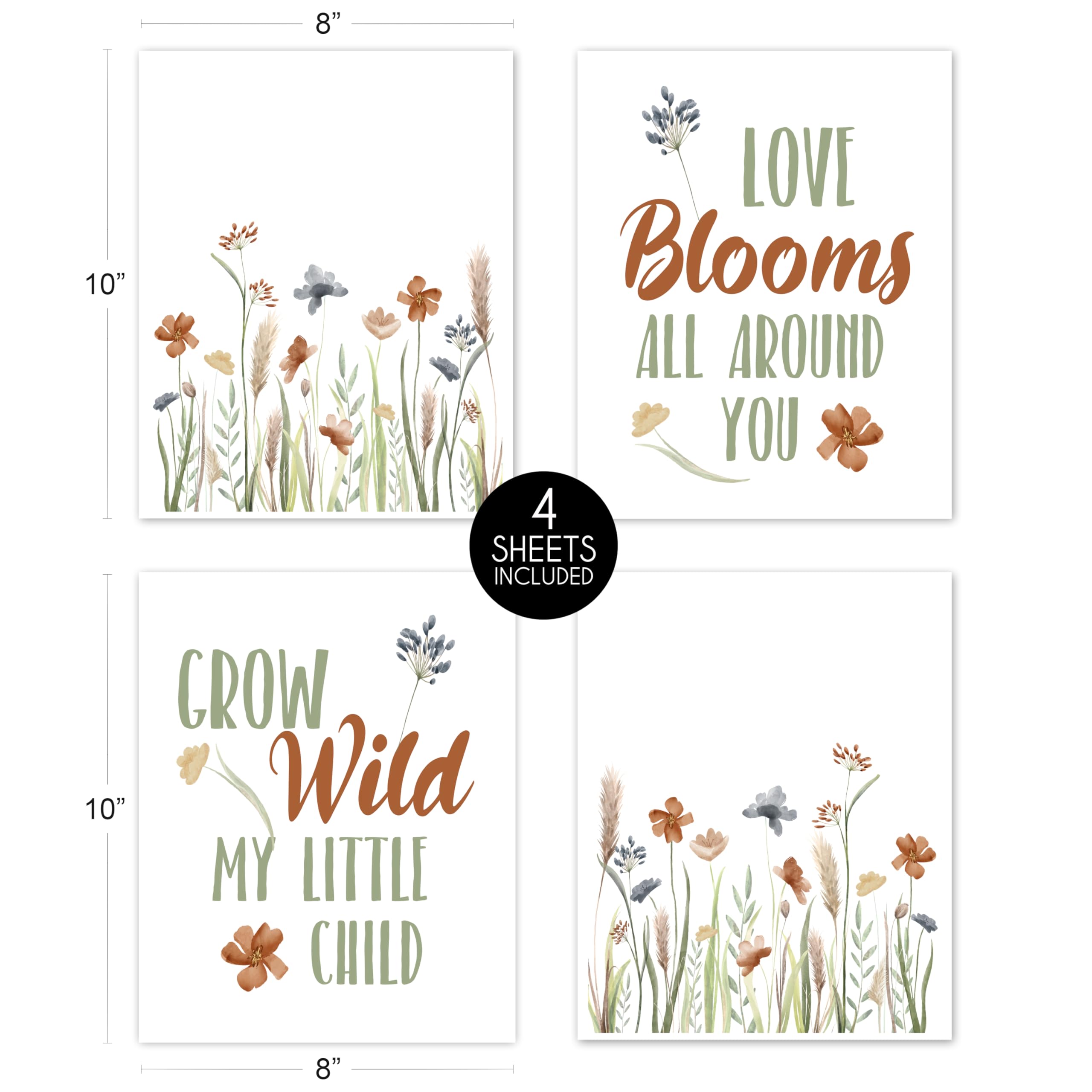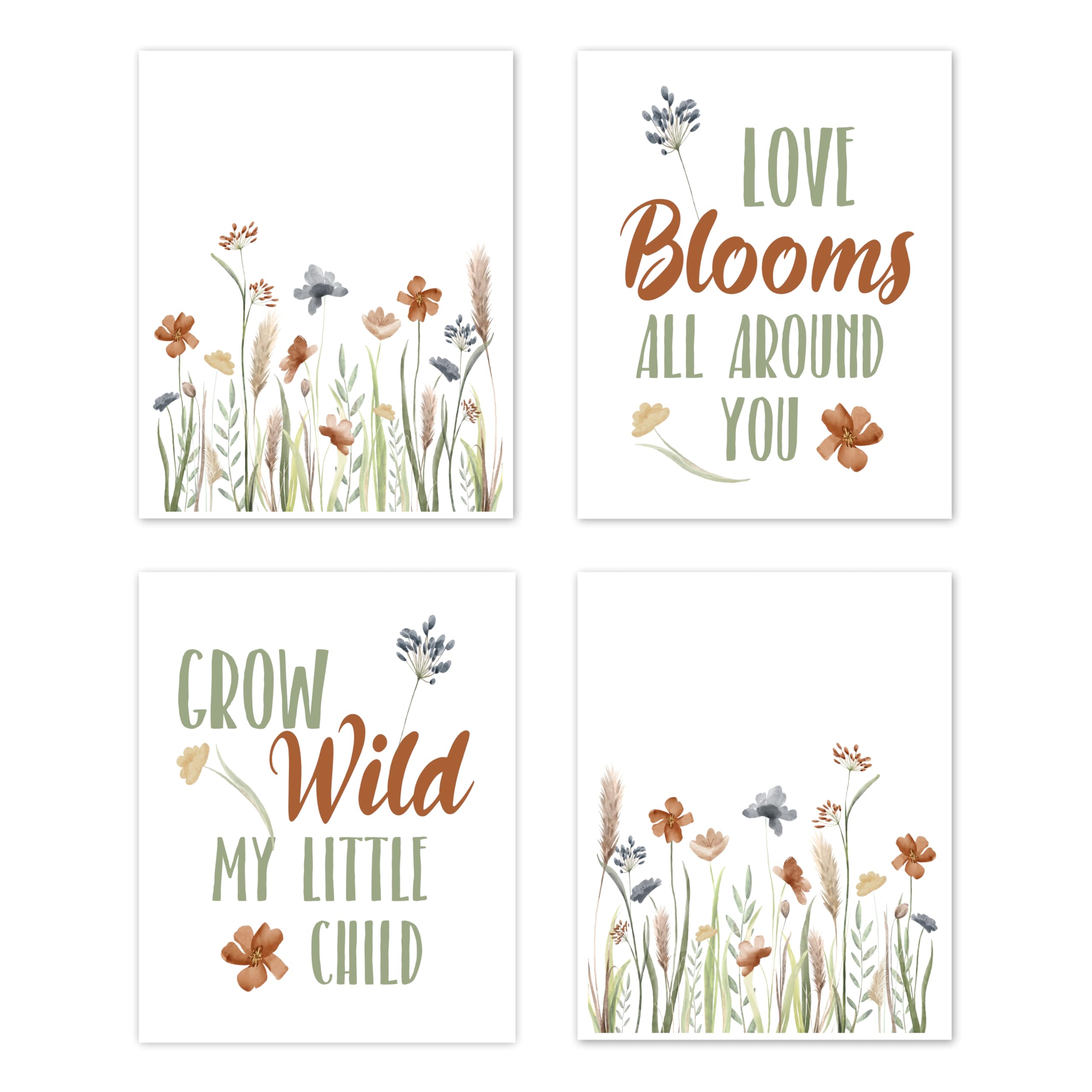 Wall art prints set features exclusive design of sage green, beige, blue, rust orange and taupe boho floral garden flower nature watercolor bohemian farmhouse vintage shabby chic wildflower print with inspirational "Love Blooms All Around You" and "Grow Wild My Little Child" quotes.