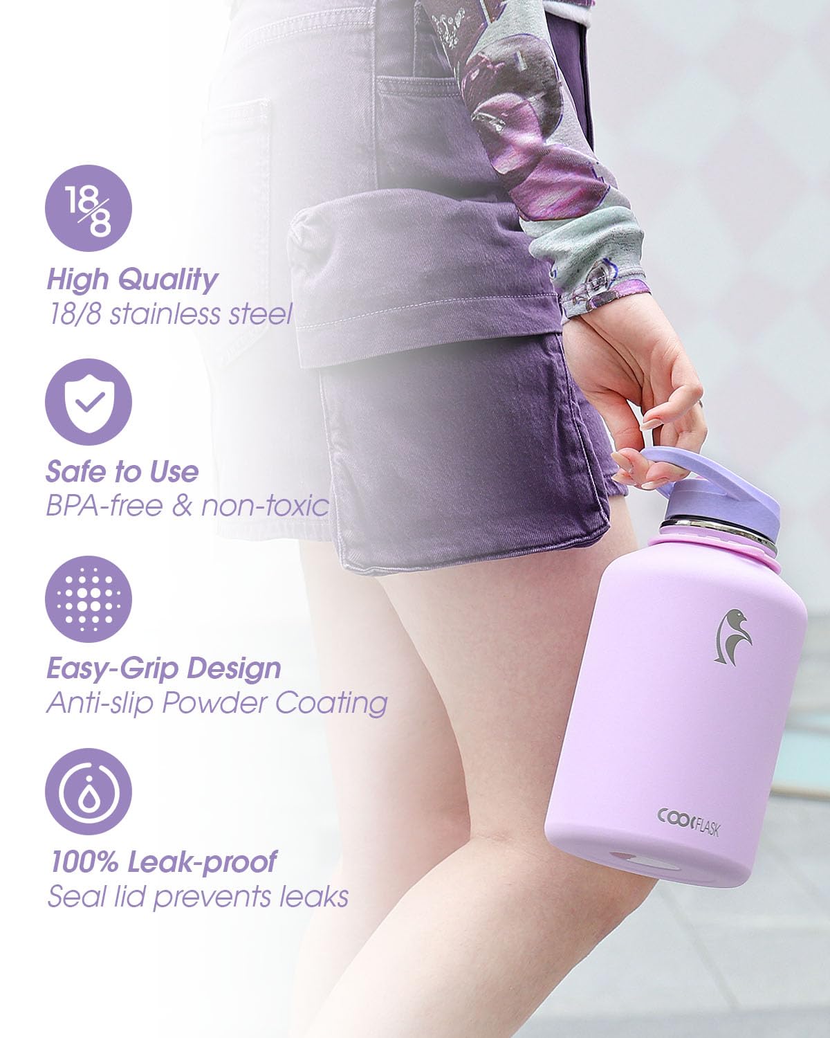 Keep Cold 48h: Experience the luxury of double-layer 18/8 stainless steel and cutting-edge vacuum insulation. Rest easy knowing this 64 oz insulated water bottle is made from food-grade BPA-free materials.