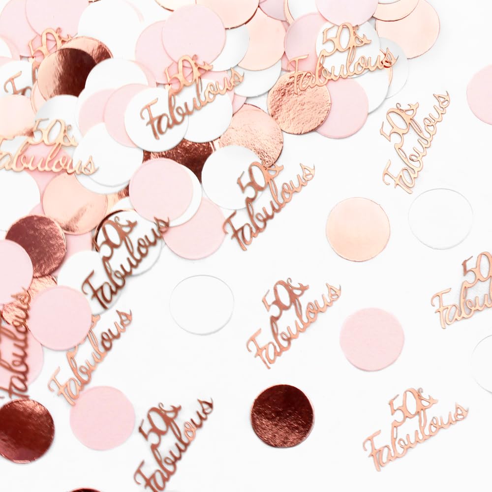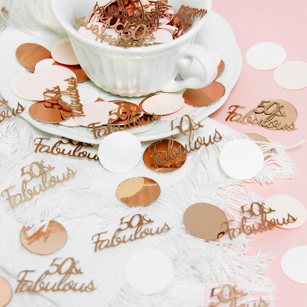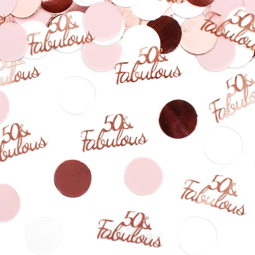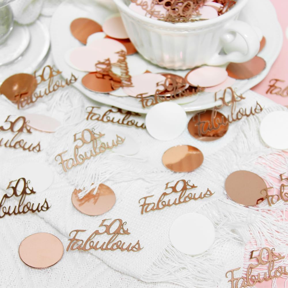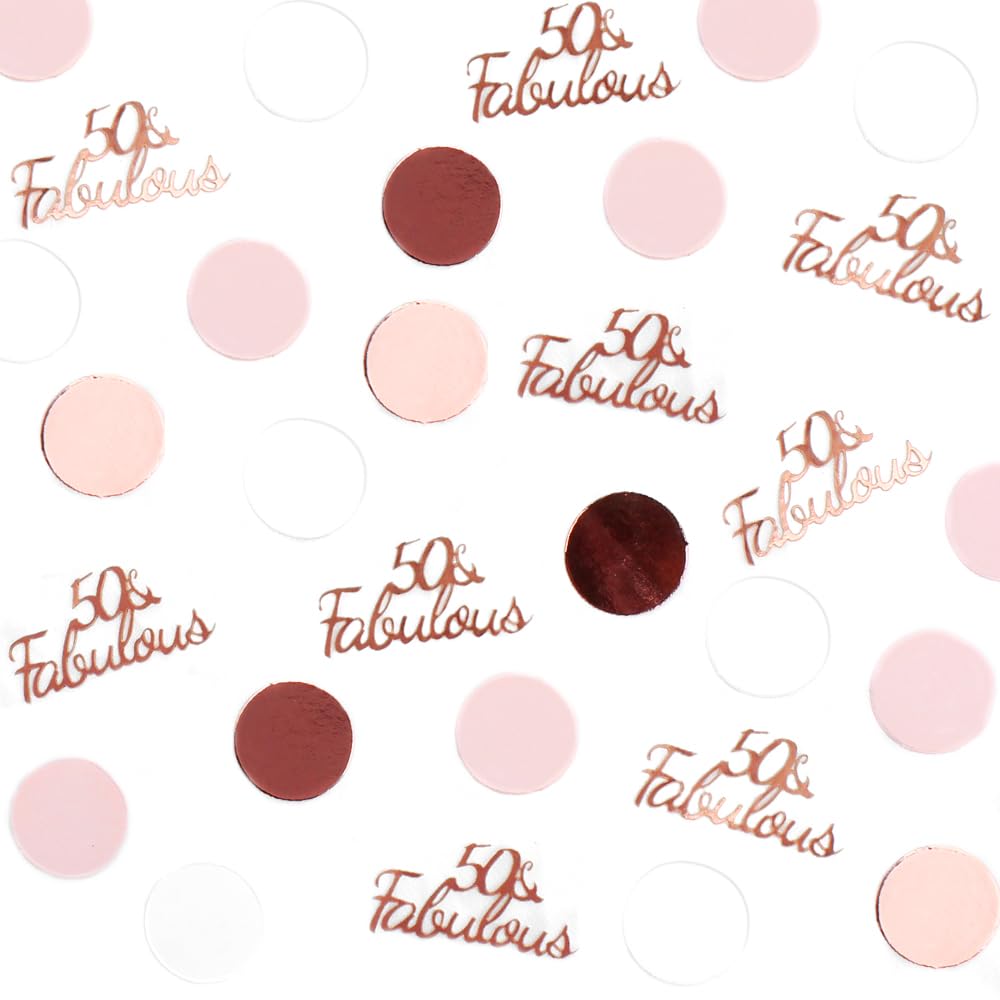 4.Value Pack and Proper size:Launching a 50th birthday or wedding anniversary party, the sweet rose gold happy birthday confetti package is enough.The size(1.65inch width for 50&fabulous,round dot confetti 1inch) is also proper to decorate.