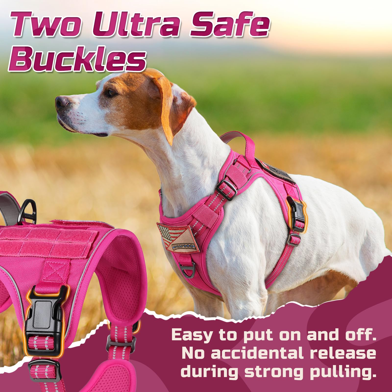 Easy to Adjust & Wear: The tactical dog harness features 4 convenient adjustment points (2 Shoulder, 2 Chest) to ensure a snug fit for dogs of all sizes. Two quick-release buckles are designed not only for easy on and off, but also can withstand great pulling force, providing security for training, hunting, walking, and any other occasions