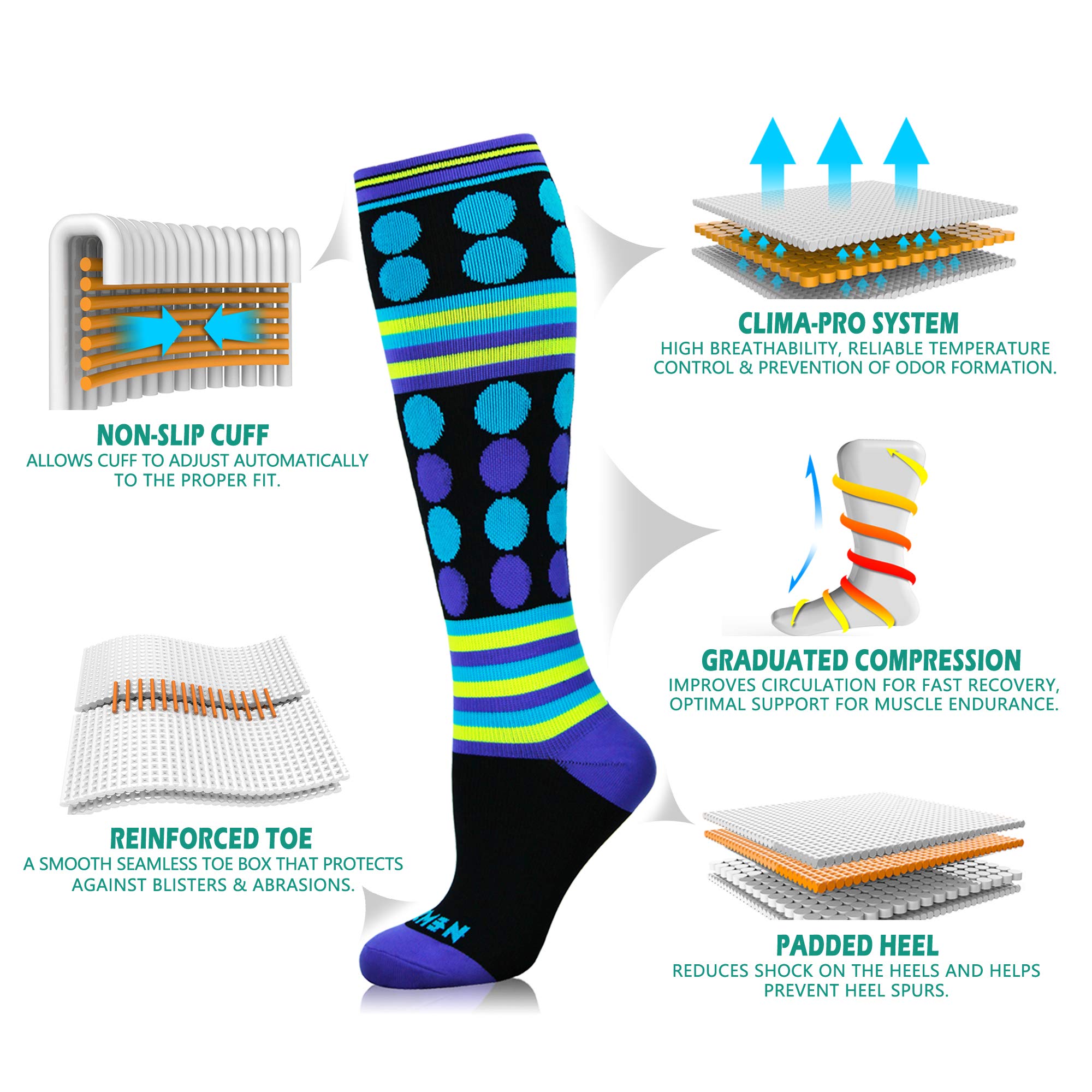 【IDEAL COMPRESSION SOCKS FOR ALL OCCASIONS】Our compression socks cater to a diverse range of needs from running nursing and traveling to sports like volleyball and basketball They also provide support for medical professionals pregnant women and individuals seeking comfort during travel or maternity With high-performance features our socks offer support and relief for both men and women across various occasions